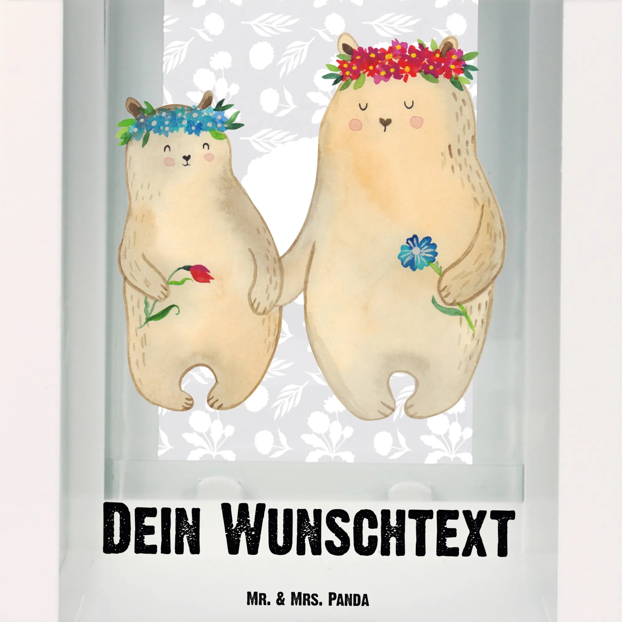 Die personalisierte Deko Laterne mit dem wunderschönen Motiv der Bären mit Blumenkranz von Mr. & Mrs. Panda ist das perfekte Geschenk für jede Mama und jeden Lieblingsmenschen. Besonders zum Muttertag, an den Geburtstagen oder einfach nur so, um Danke zu sagen, zaubert diese Laterne ein Lächeln ins Gesicht deiner Liebsten. Die bezaubernden Bären auf der Laterne sind nicht nur niedlich, sondern tragen auch eine liebevolle Botschaft: 'Mama, für mich bist du die Wundervollste!'. Damit fängt die Laterne den Herzschlag einer jeden Familie ein und sorgt für eine besonders gemütliche Atmosphäre auf der Terrasse oder dem Balkon.