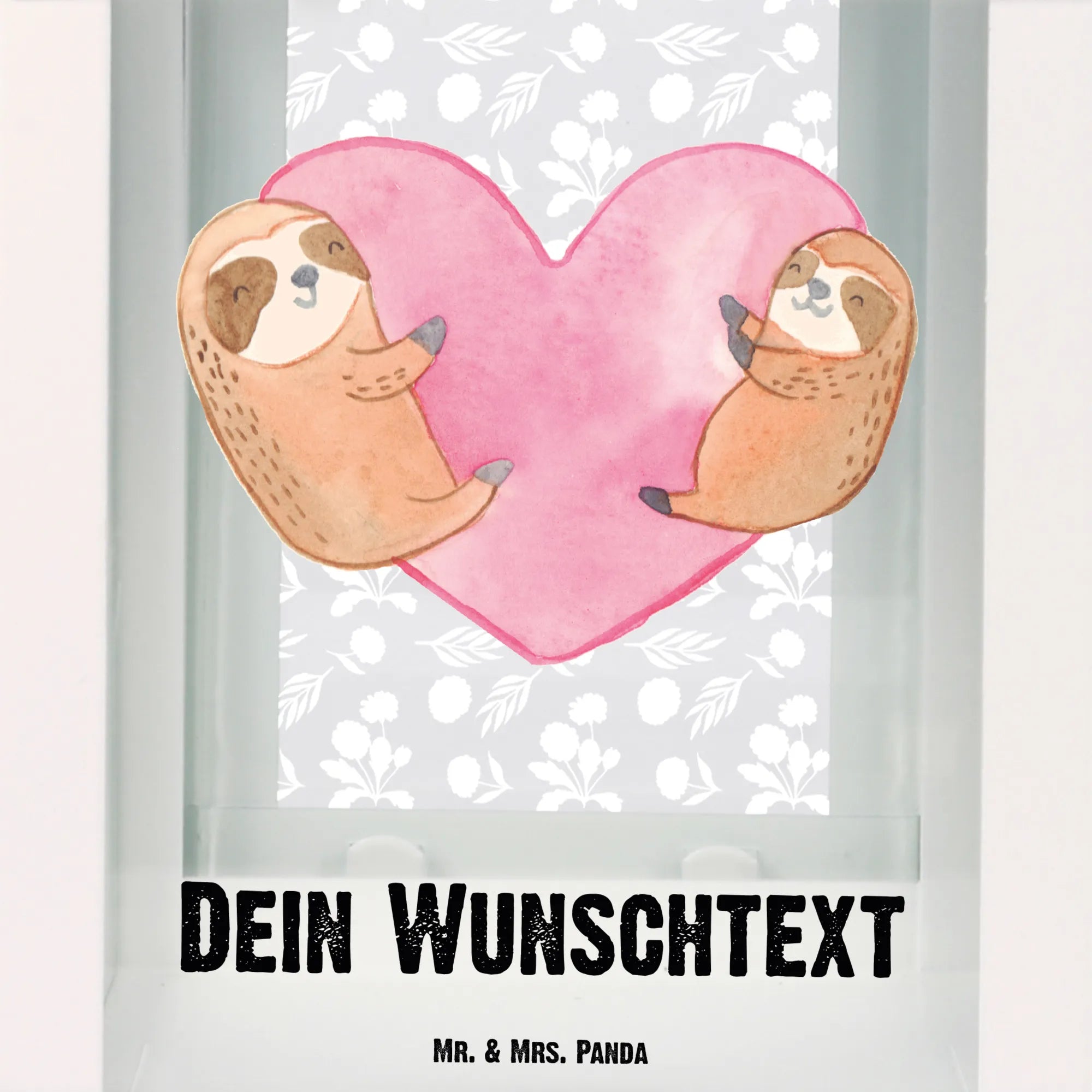 Das Motiv zeigt zwei kuschelnde Faultiere vor einem Herzen in zarten rosa Aquarellfarben, die Verbundenheit und Zuneigung symbolisieren. ❤️ Deine personalisierte Deko Laterne ist ideal für den Innen- und Außenbereich geeignet und sorgt überall für gemütliches Licht.