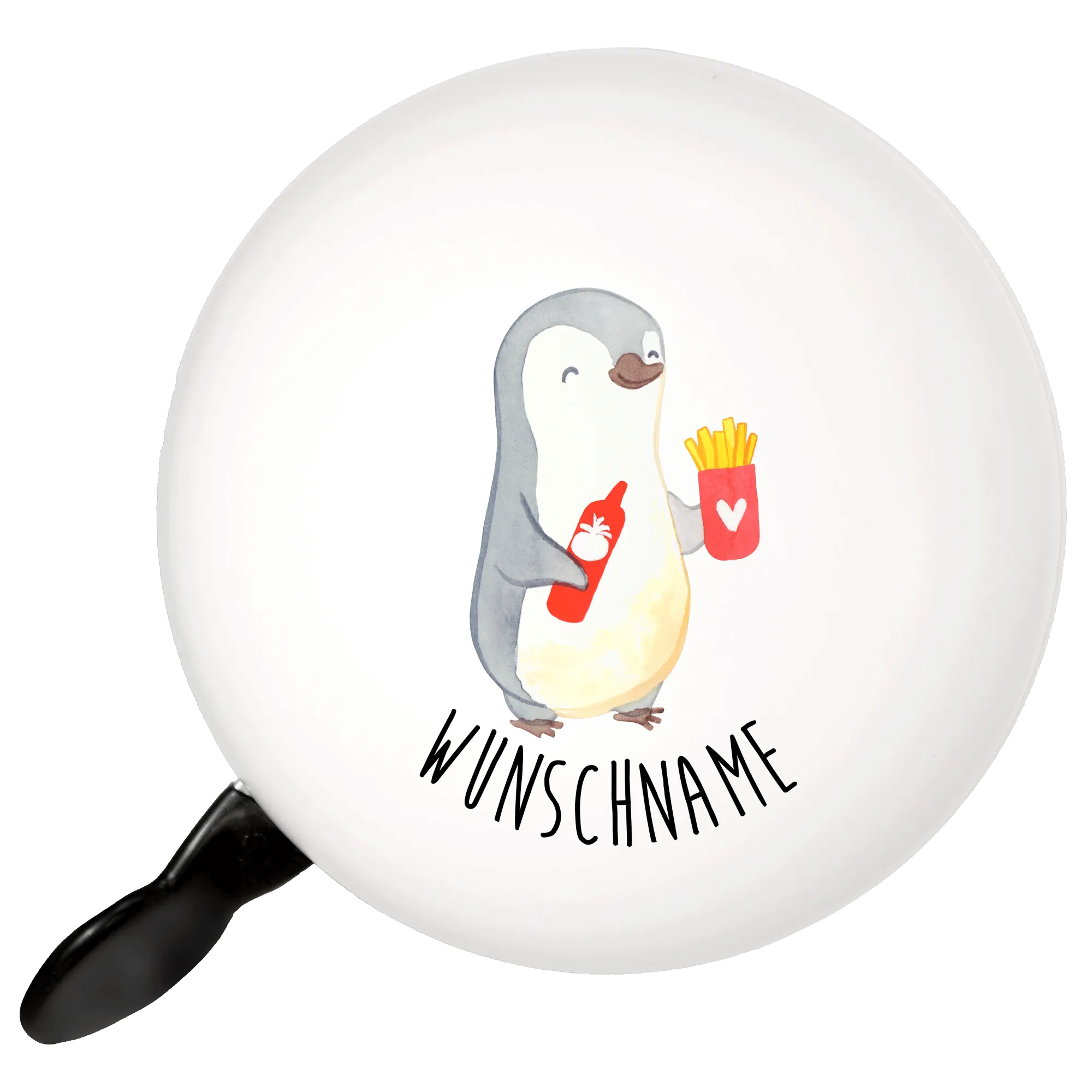 Suchst du ein Geschenk, das direkt ins Herz fährt? Unsere personalisierte Fahrradklingel „Pinguin Pommes“ aus der Liebe-Kollektion von Mr. & Mrs. Panda ist genau das: niedlich, frech und voller Zuneigung. Auf der Oberseite lächelt ein fröhlicher Pinguin, der eine Portion Pommes und eine Ketchup-Flasche mit einem kleinen Herz hält. Daneben prangt der liebevolle Spruch „Mit dir würde ich sogar meine Pommes teilen.“ – ein perfekter kleiner Liebesbeweis für Freundin, Freund oder Partner. ❤️