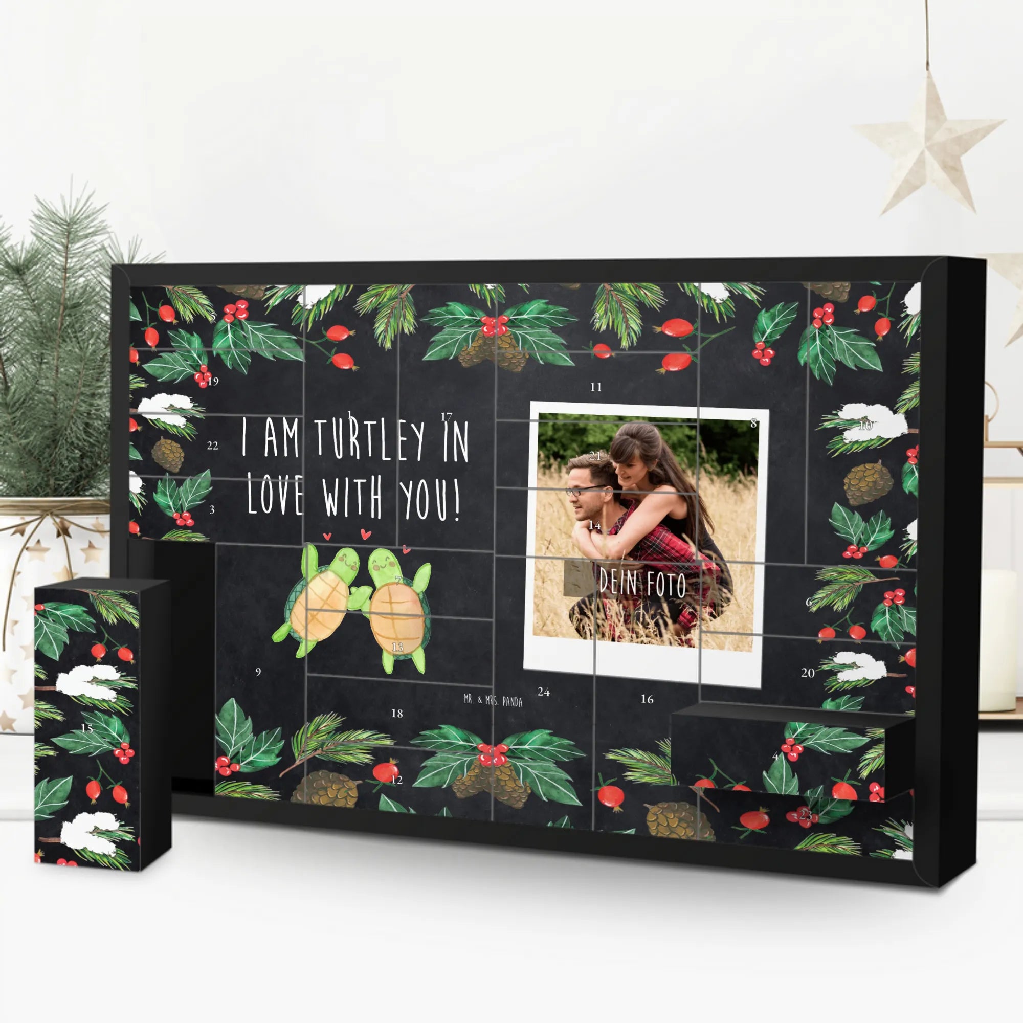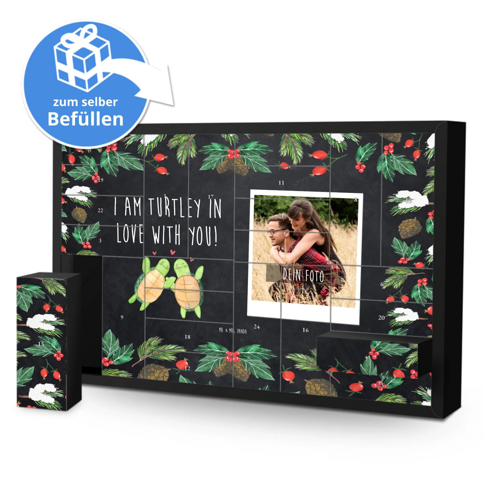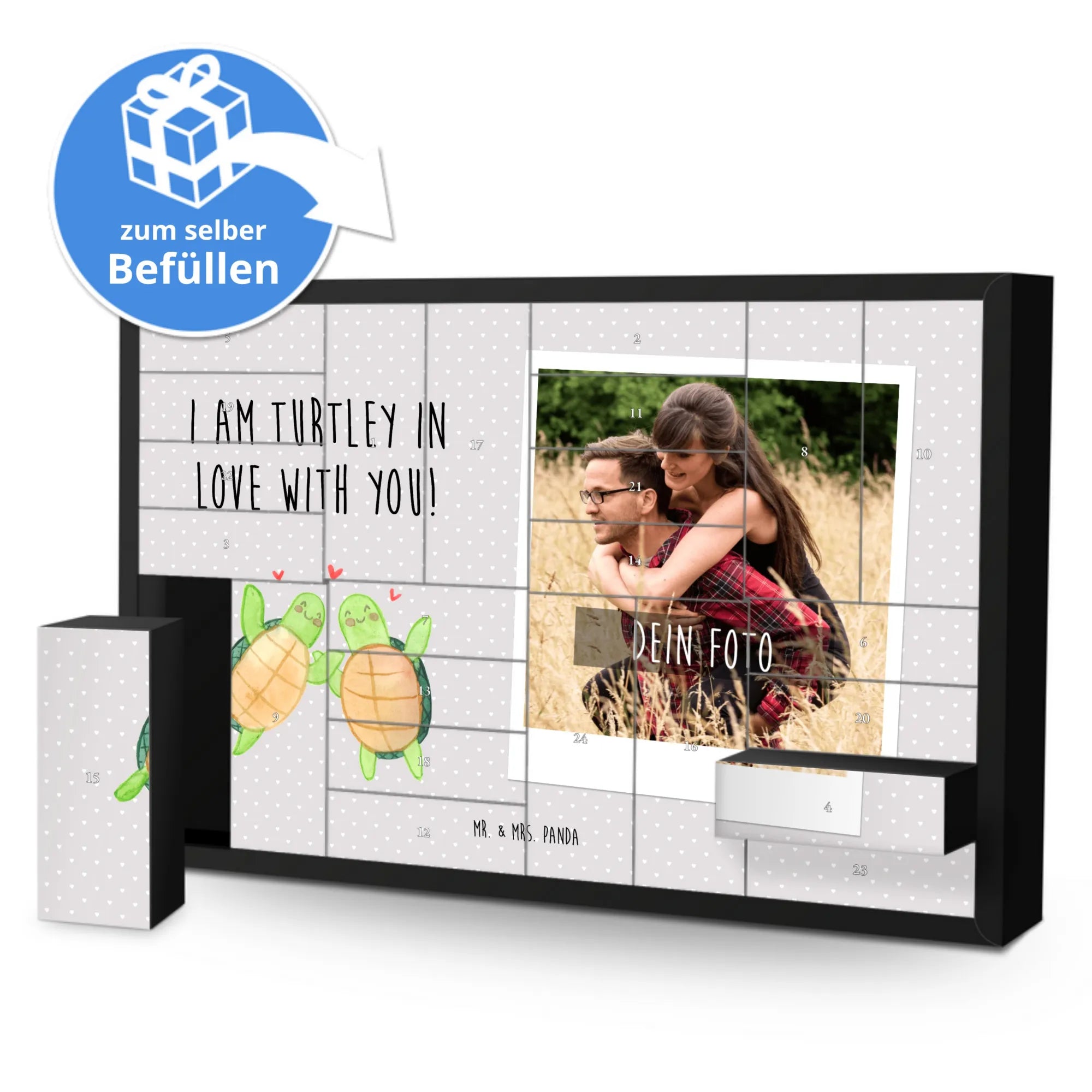 Der personalisierte befüllbare Foto Adventskalender mit dem süßen Motiv der Schildkröten von Mr. & Mrs. Panda ist das perfekte Geschenk für Verliebte. Egal ob zum Valentinstag, Hochzeitstag oder Jahrestag, dieser Adventskalender wird Euer Herz höher schlagen lassen. Mit liebevollen Illustrationen und dem süßen Spruch "I am turtley in love with you!" bringt er Freude und Liebe in die Vorweihnachtszeit.