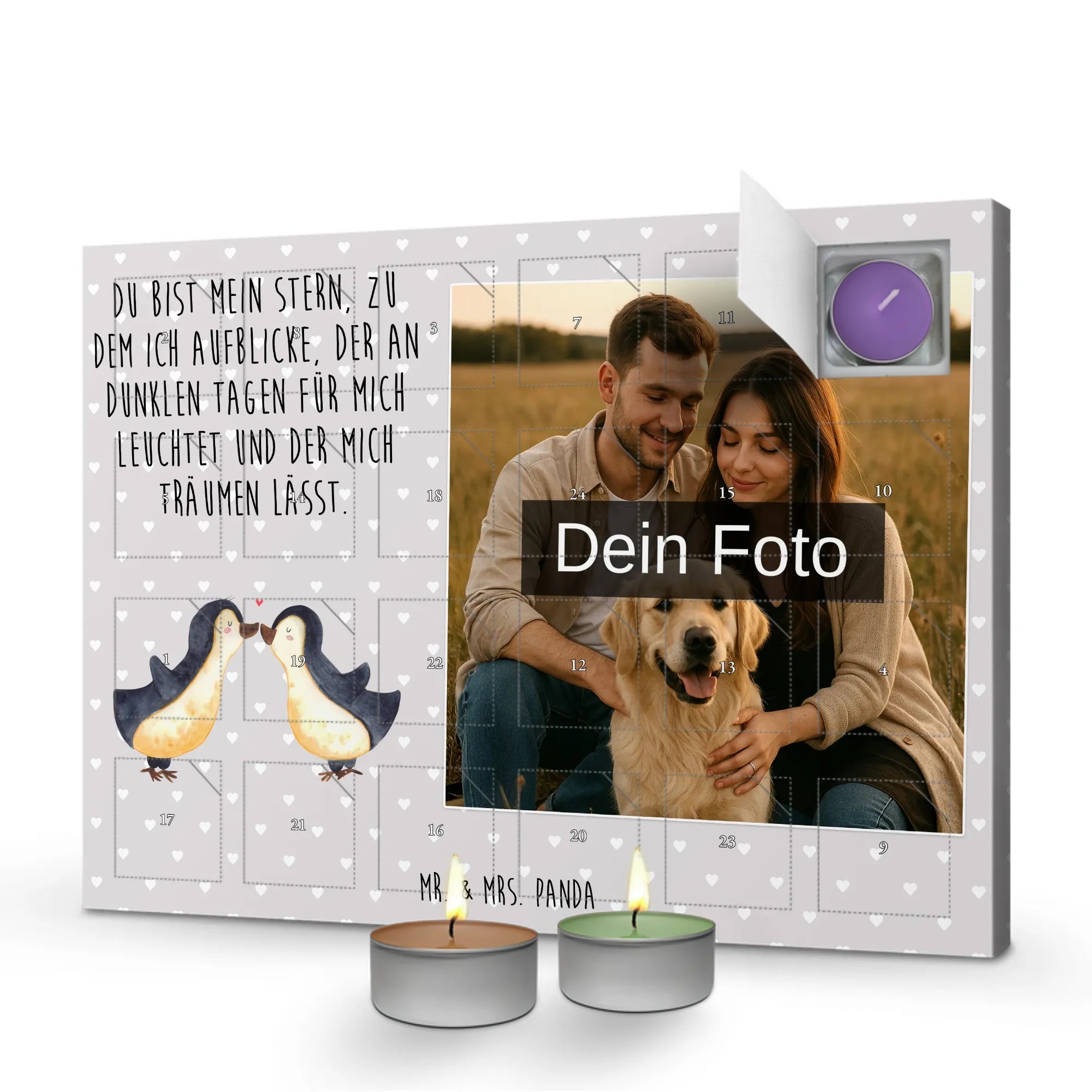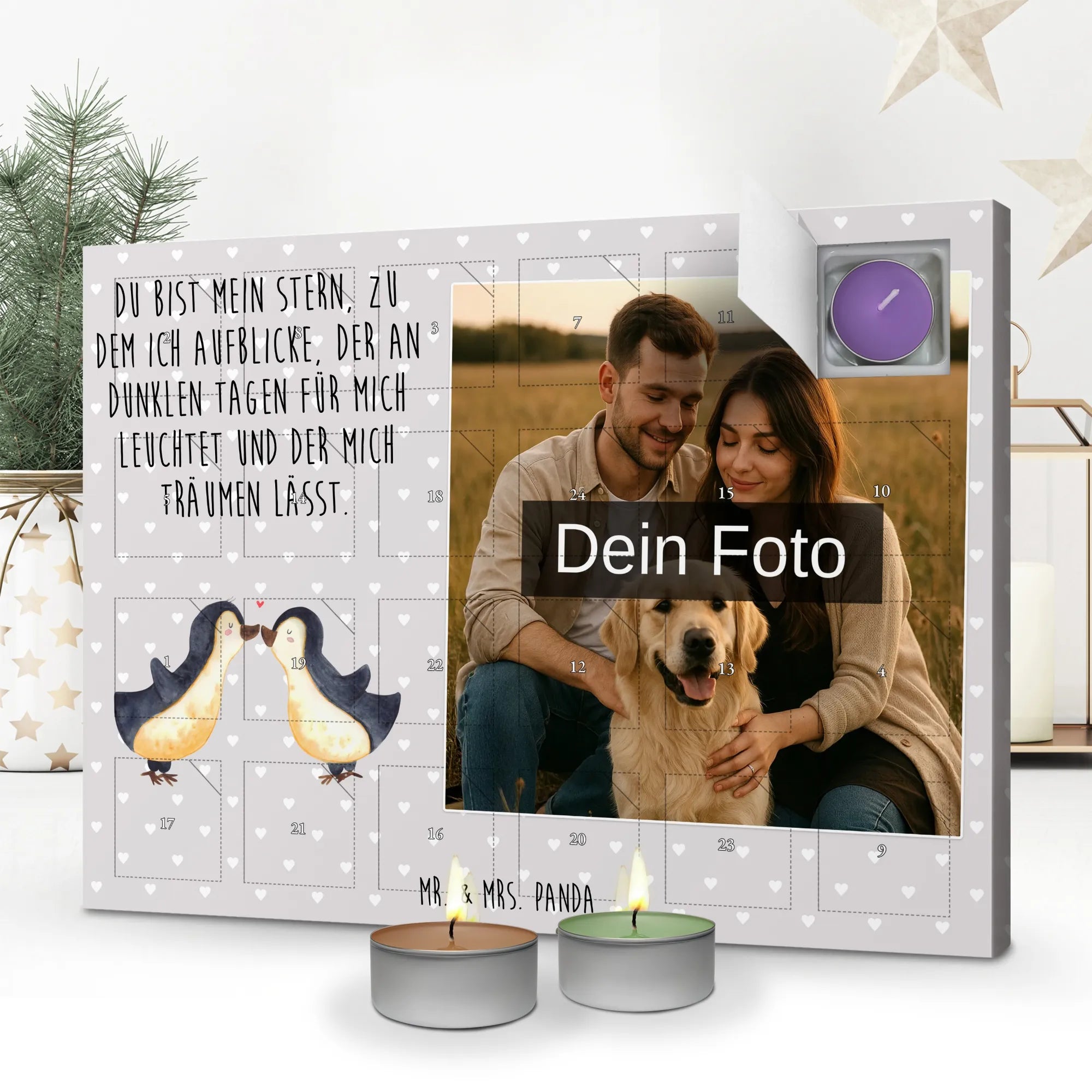 Personalisierter Duftkerzen Foto Adventskalender „Pinguin Liebe“ – das perfekte Liebesgeschenk von Mr. & Mrs. Panda. 💕 Dieser zauberhafte Adventskalender verbindet ein persönliches Foto mit der liebevollen Aquarell-Illustration von zwei kuschelnden Pinguinen und dem schönen Spruch: „Du bist mein Stern, zu dem ich aufblicke, der an dunklen Tagen für mich leuchtet und der mich träumen lässt.“