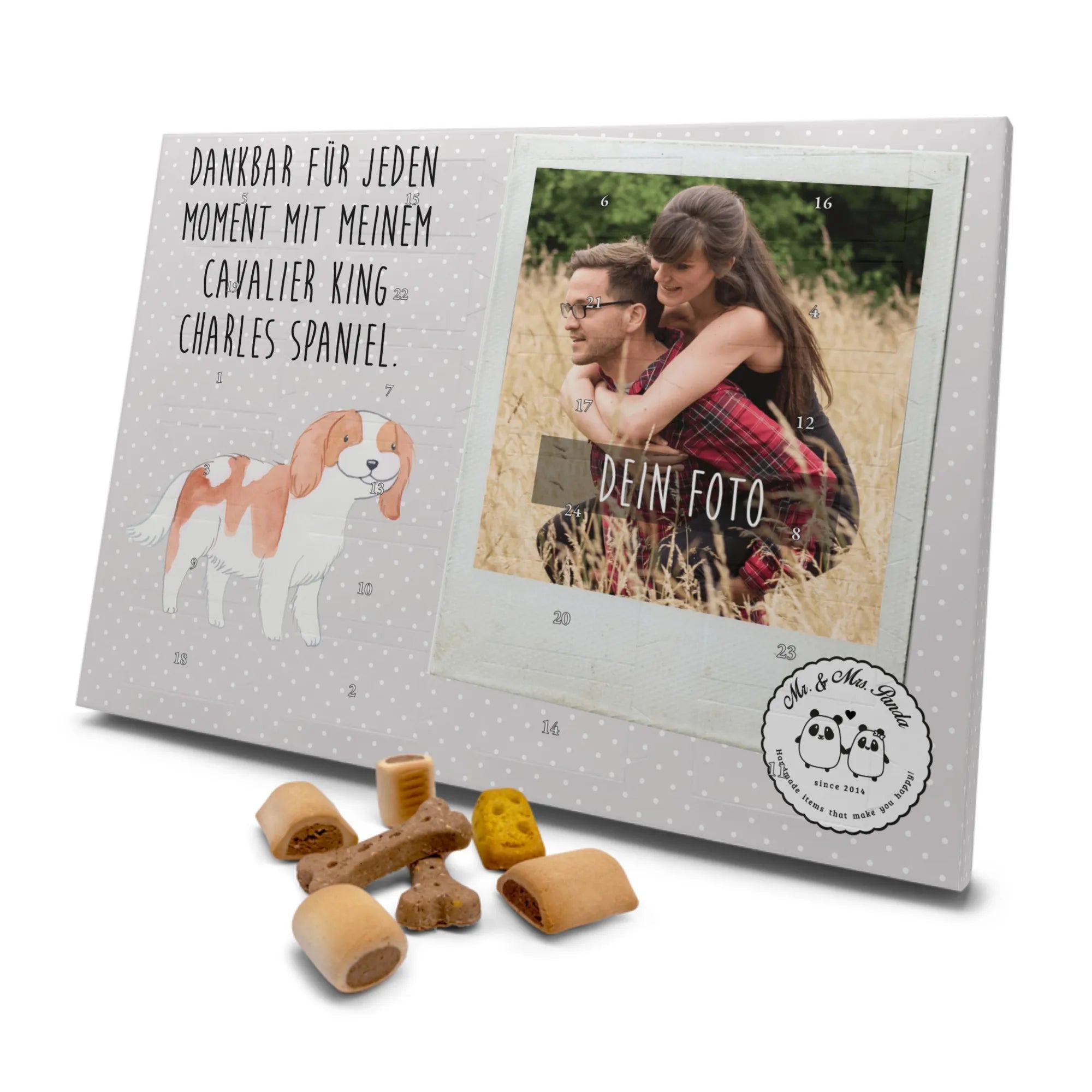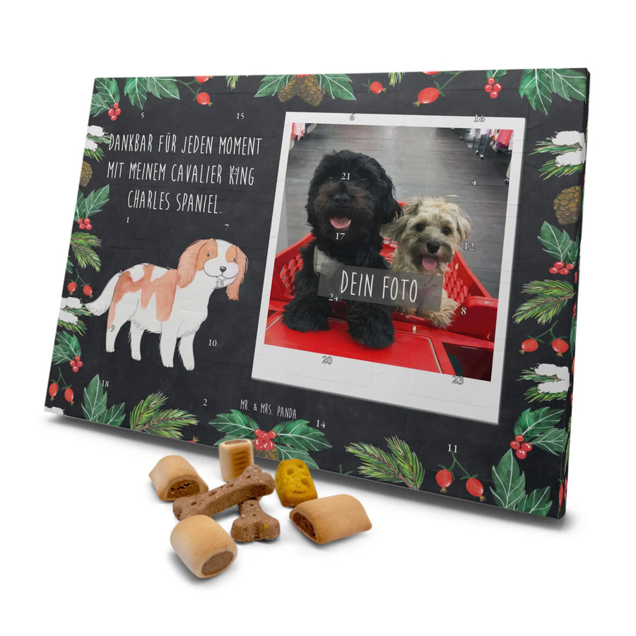 Der personalisierte Hunde Foto Adventskalender mit dem Motiv "Cavalier King Charles Spaniel" von Mr. & Mrs. Panda ist das perfekte Geschenk für Hundehalter und Tierfreunde. Specially for you, this calendar combines the joy of counting down to Christmas with the love for your furry friend. Auf jedem der 24 Türchen wartet eine köstliche Überraschung in Form von premium Hundekeksen - genau das Richtige für deinen treuen Begleiter!