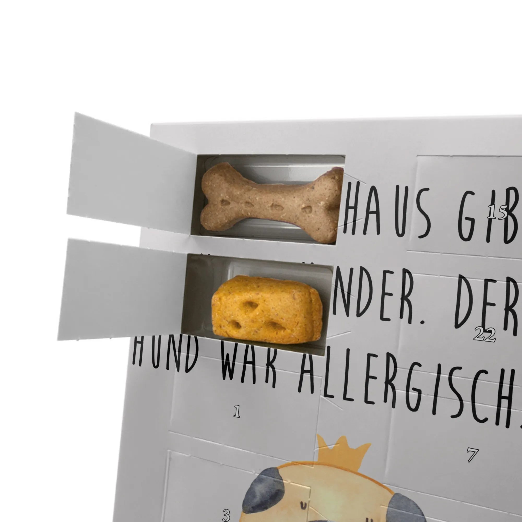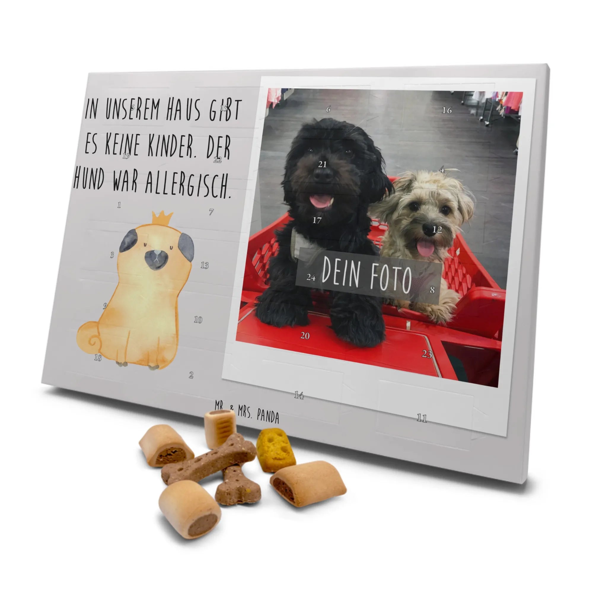 Der personalisierte Hunde Foto Adventskalender von Mr. & Mrs. Panda ist das perfekte Geschenk für alle Hundeliebhaber, besonders für diejenigen, die ihren Mops, den König der Hunde, ganz besonders schätzen. Mit dem lustigen Spruch 'In unserem Haus gibt es keine Kinder. Der Hund war allergisch.', zaubert dieser Adventskalender jedem ein Lächeln ins Gesicht und sorgt für viel Spaß in der Vorweihnachtszeit.