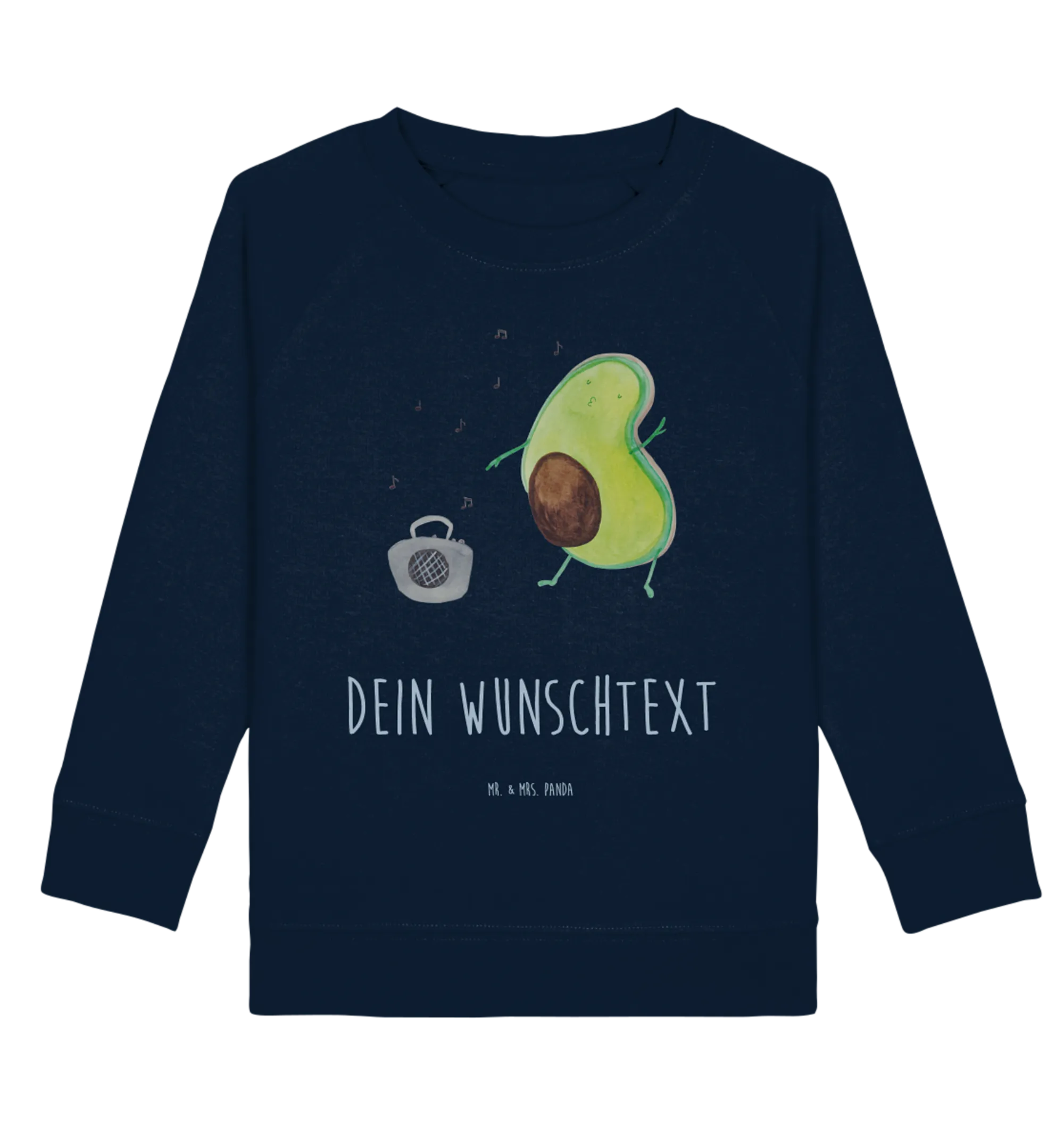 Der personalisierten Kinder Pullover "Avocado tanzt" aus der bezaubernden Avocado Kollektion von Mr. & Mrs. Panda ist das perfekte Geschenk für kleine Fans gesunder Lebensstile! Mit einem niedlichen Motiv einer tanzenden Avocado vor einem Ghettoblaster bringt dieser Pullover Freude und Farbe in jede Garderobe. Er ist nicht nur stylisch, sondern auch super bequem und aus hochwertiger, ökologischer Baumwolle gefertigt.