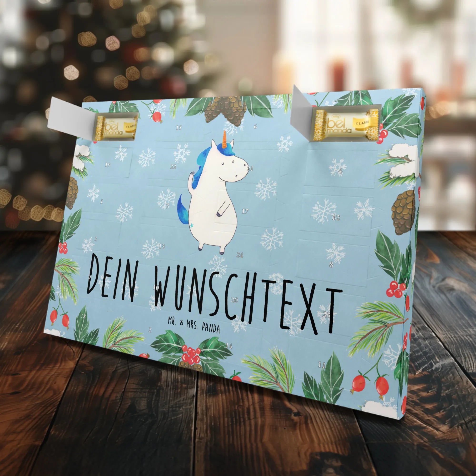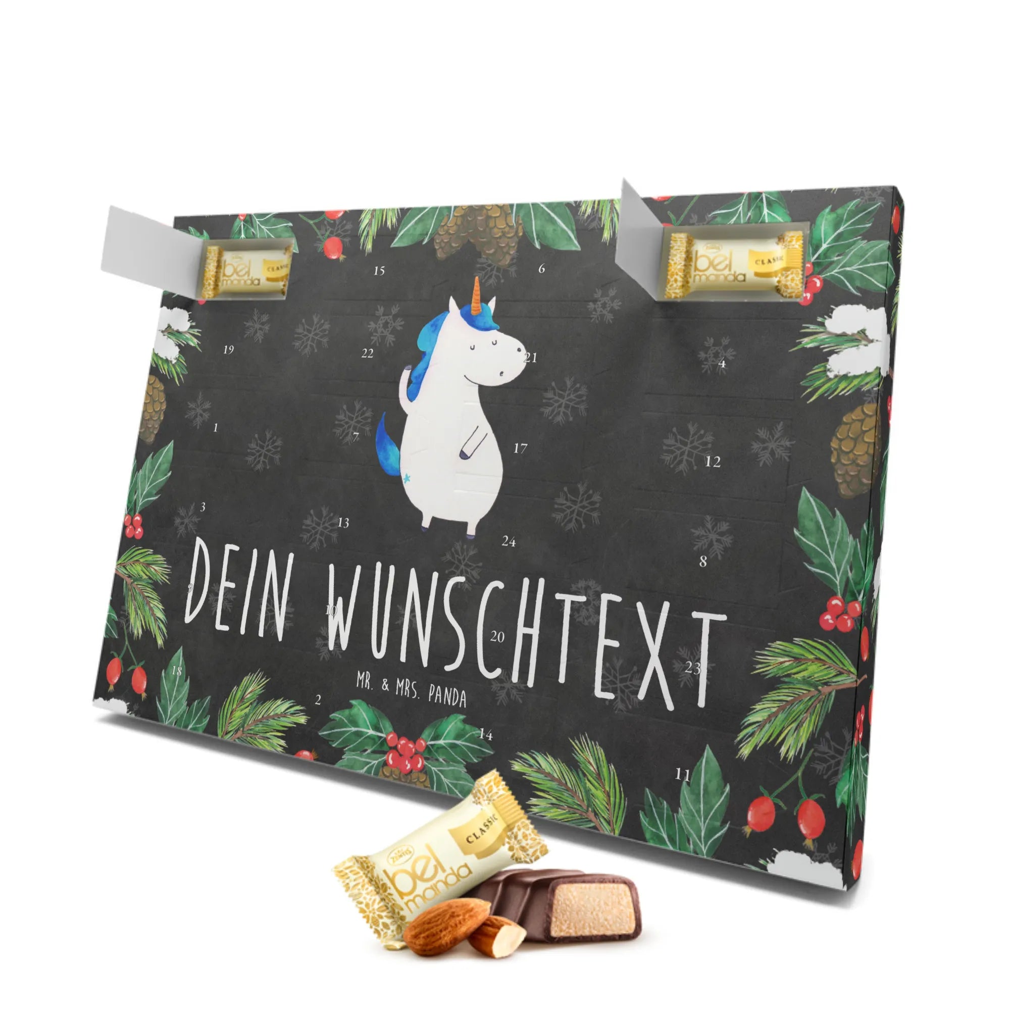 Der personalisierte Marzipan Adventskalender Einhorn Mann von Mr. & Mrs. Panda ist das perfekte Geschenk für Freunde und Familie! Er bringt nicht nur die Magie der Adventszeit in dein Zuhause, sondern begeistert auch mit einem tollen Einhorn-Motiv, das garantiert für Freude und Lächeln sorgt.