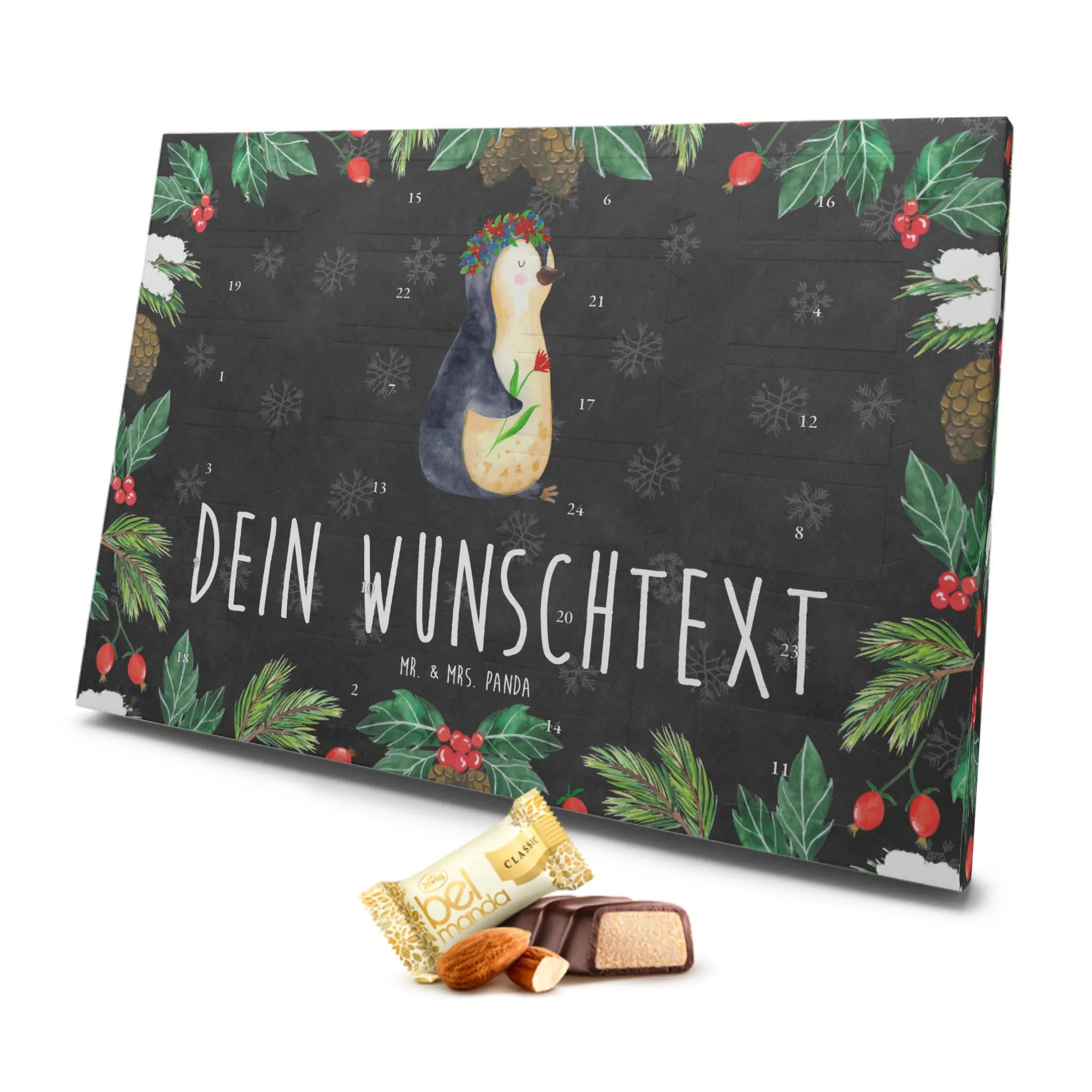 Der personalisierte Marzipan Adventskalender mit dem liebevollen Pinguin Blumenkranz von Mr. & Mrs. Panda ist nicht nur ein köstliches Leckerli, sondern auch ein einzigartiges Geschenk, das Freude und Motivation für die Adventszeit verspricht. Mit seinem strahlenden Design, das einen süßen Pinguin zeigt, der mit einem bunten Blumenkranz geschmückt ist, bringt dieser Kalender sofort gute Laune und Lebensfreude in jedes Zuhause.