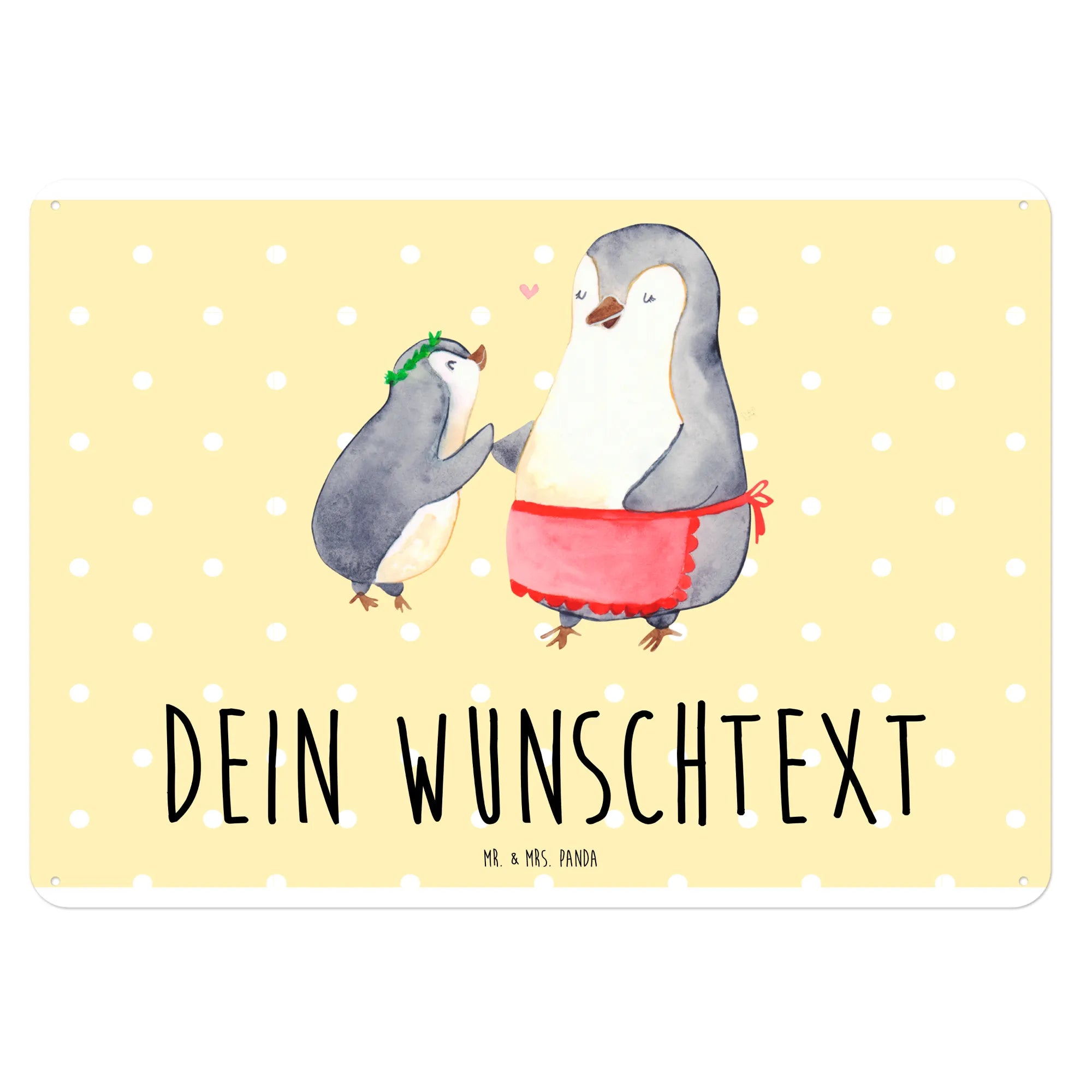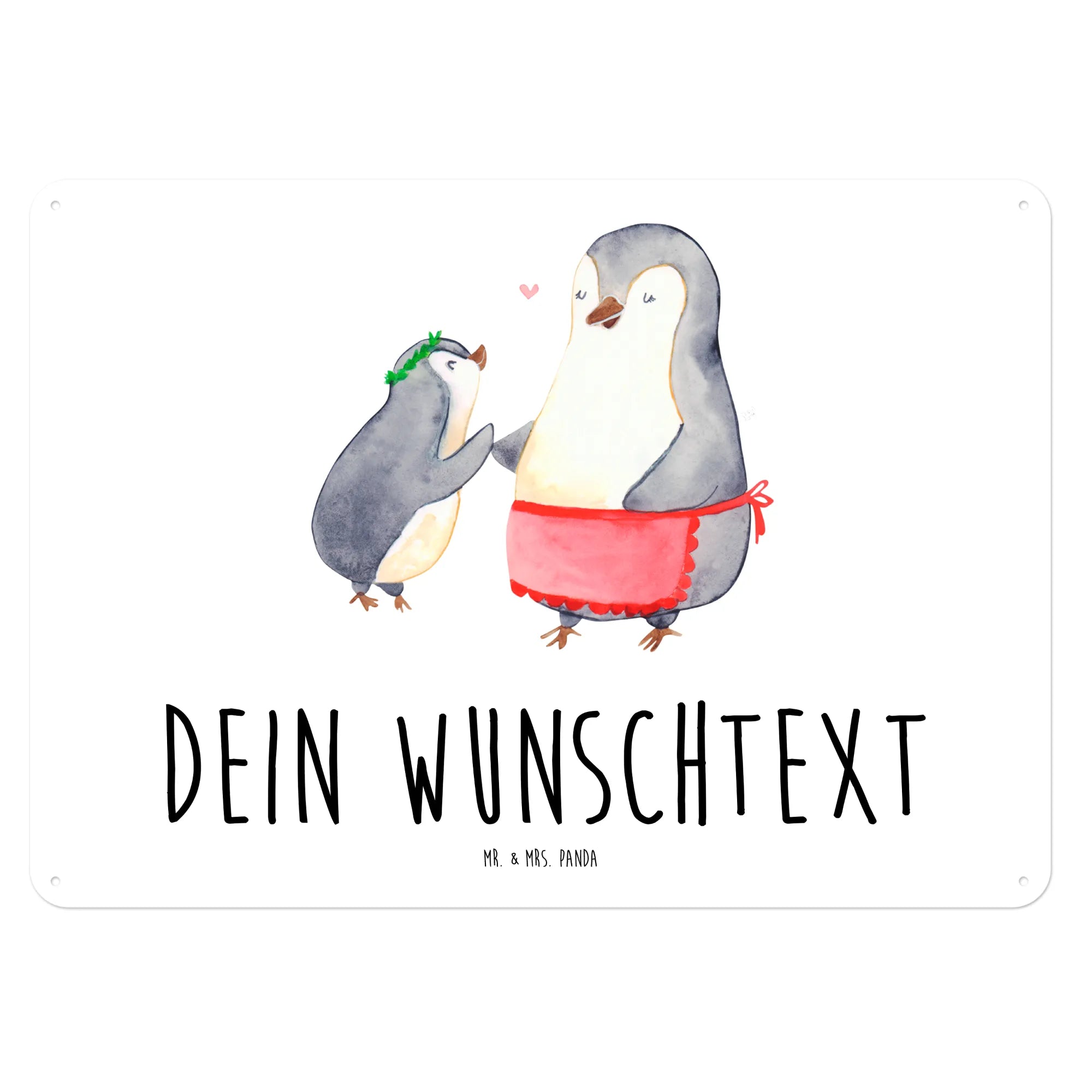 Das personalisierte Blechschild mit dem süßen Motiv "Pinguin mit Kind" von Mr. & Mrs. Panda ist nicht nur ein dekoratives Element, sondern ein liebevolles Geschenk, das Herzen berührt. Dieses Schild zeigt eine bezaubernde Szene, in der ein großer Pinguin in einer roten Schürze fürsorglich auf seinen kleinen Pinguin mit einem grünen Kranz schaut. Zwischen ihnen schwebt ein kleines Herz, das die besondere Verbindung zwischen Mutter und Kind symbolisiert.