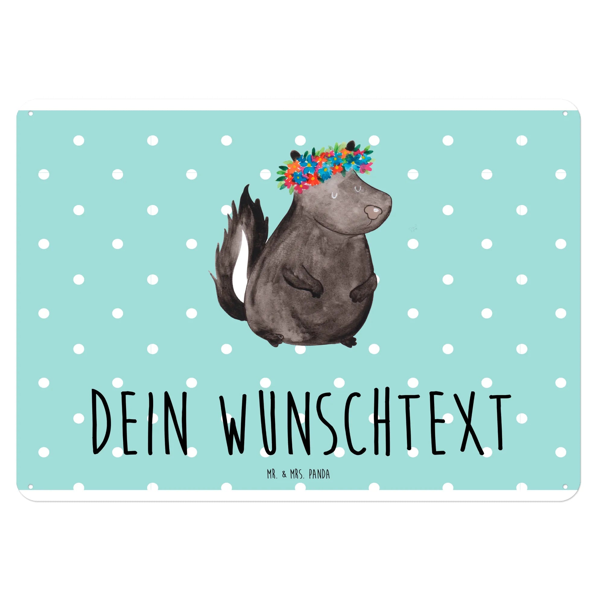 Das Schild zeigt ein süßes Stinktier, das stolz mit einem bunten Blumenkranz auf dem Kopf posiert. Es strahlt Freude und einen Hauch von Naturverbundenheit aus, perfekt für eine liebevolle Dekoration in jedem Zuhause. Die liebevolle Gestaltung von Mr. & Mrs. Panda wird durch den Spruch "Ich trage Träume im Herzen, Sonnenschein im Bauch und Blumen auf dem Kopf." ergänzt, der den Betrachter zum Schmunzeln bringt.