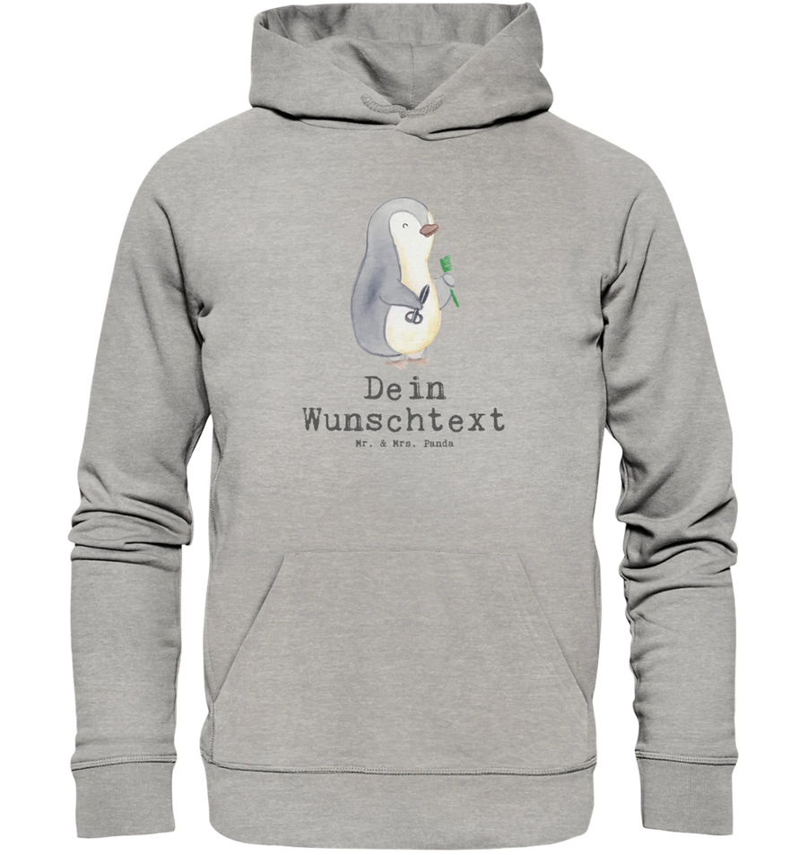 Personalisierter Organic Hoodie „Hairstylist mit Herz“ – das perfekte Geschenk für alle Hairstylisten, Friseure und Barber, die ihre Arbeit mit Herzblut leben. Unser liebevoll gestalteter Hoodie zeigt den niedlichen Pinguin mit Kamm und den frechen Spruch „Du bist nur ein halber Mensch, wenn du kein Hairstylist bist.“ und kann mit einem Wunschname personalisiert werden.