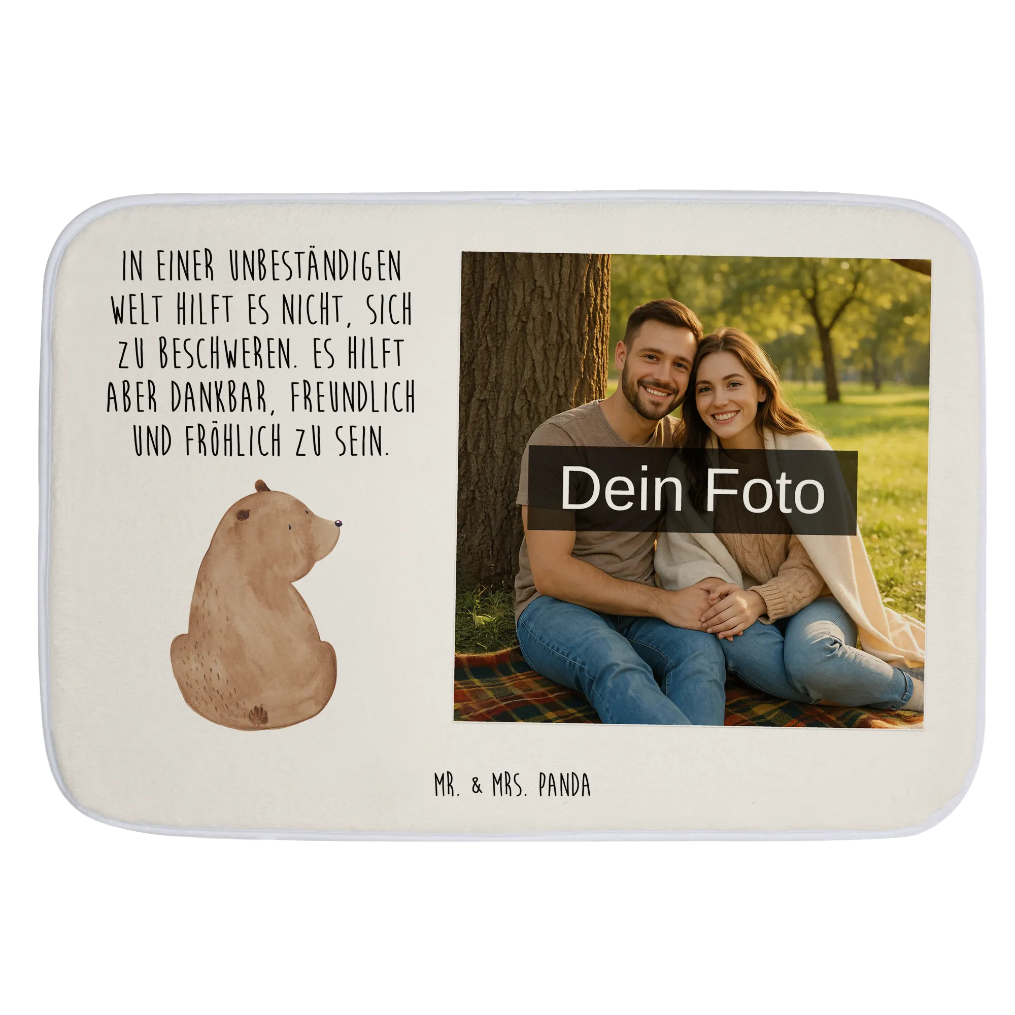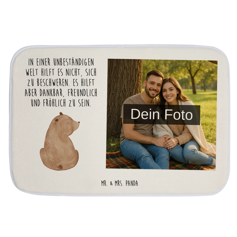 Add personality and safety to your bathroom with our Customizable Photo Bathmat from Mr. & Mrs. Panda. Size: 590 mm (23 inch) x 400 mm (16 inch), crafted from a particularly fluffy premium synthetic fibre that feels gentle under your feet. The mat’s top layer is highly absorbent to keep floors dry, while the back is coated with anti-slip rubber nodules to prevent sliding. We print your uploaded photo in high resolution alongside our charming motifs, so please make sure the image is of good quality and that you have permission to use it. Check the crop before ordering so faces or important details aren’t cut off. Each mat is lovingly printed by us to ensure bright, lasting colours. Care is easy — wash the mat at 30°C in the washing machine. With its extra absorbency and anti-slip gumminoppen, this Customizable Photo Bathmat offers both a decorative accent and reliable safety. It makes a wonderful personalised gift or a cozy upgrade for your own bathroom that you’ll enjoy every day.