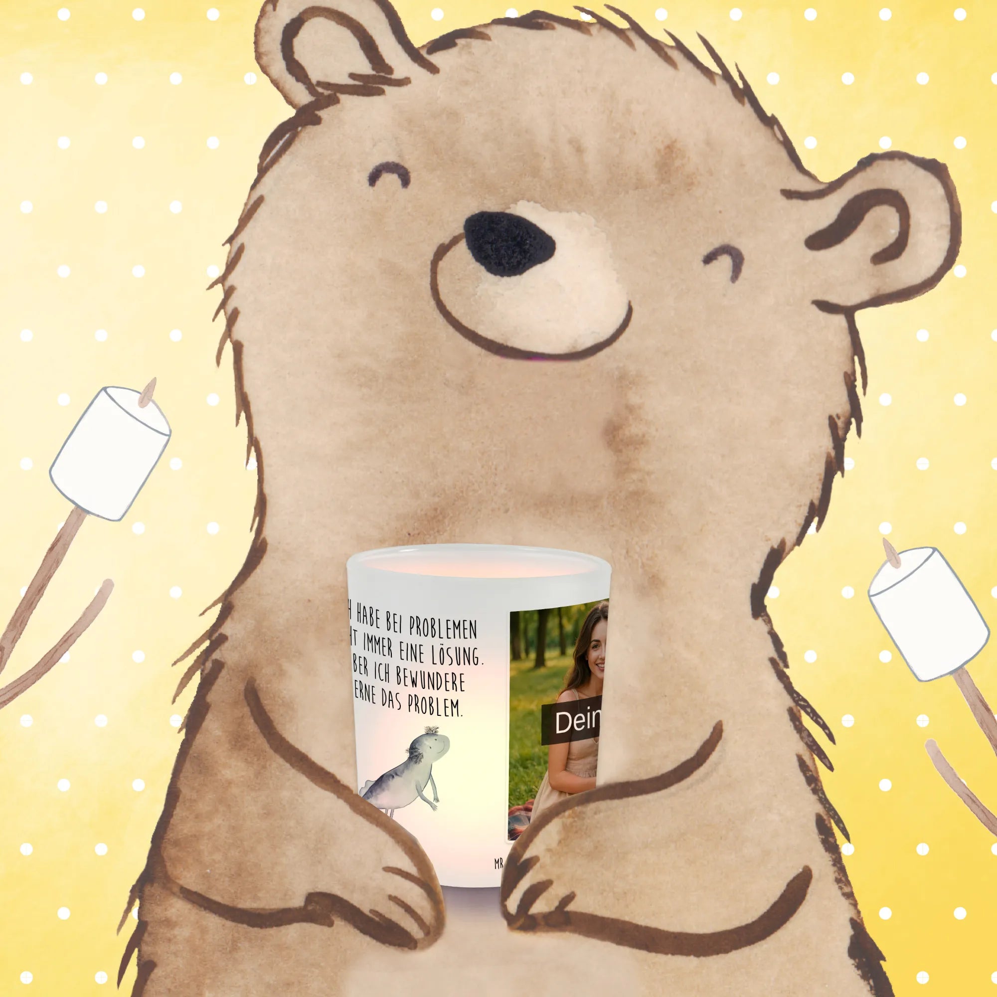 Hey friend! Light up favourite moments with our adorable photo candle holder from Mr. & Mrs. Panda. Printed with whimsical motifs and a sweet phrase, this lantern can be personalised with your chosen photo to make a unique little treasure. Measurements: 70 mm - 3 inch x 80 mm - 3 inch. The satin glass creates a dreamy, diffused glow that suits romantic dinners, quiet evenings, or cosy corners. It shields the flame from breezes, is heat-resistant and perfectly sized for standard tealights. To ensure a gorgeous print, upload a high-resolution image and check the crop so no important details are cut off; please only use pictures you have rights to or permission for. For longevity, we recommend gentle hand washing to protect the satin surface and the printed motif. Whether you’re gifting someone special or treating yourself, this photo candle holder brings warmth and personality to any space and makes memories visible in soft candlelight.