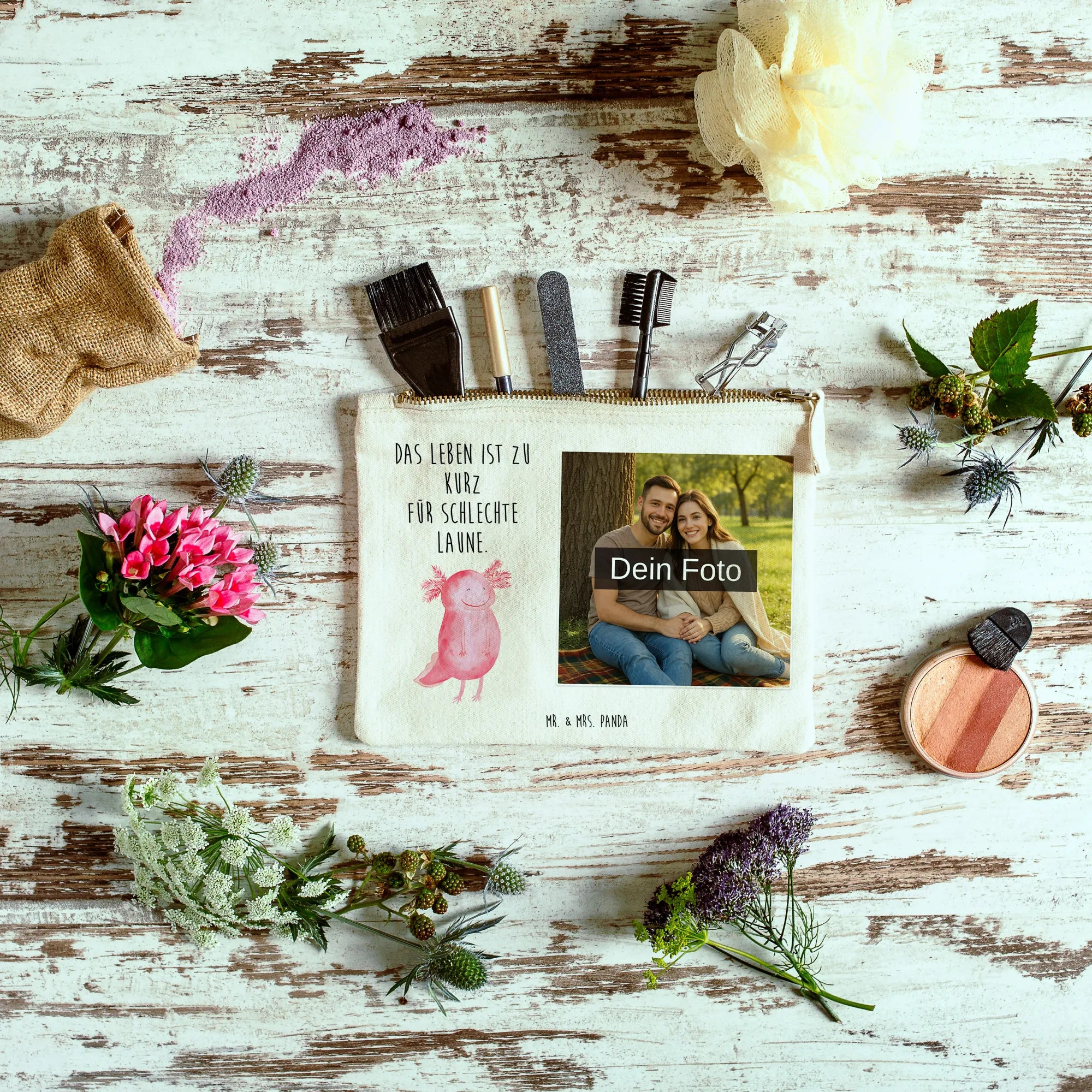 Make it yours with our Custom Photo Makeup Bag — a playful and practical pouch from Mr. & Mrs. Panda that carries a little story wherever you go. We love to print cute motifs and cheeky sayings on soft cotton, and then add your chosen photo so the result is totally personal. The material is 100% soft cotton and the pouch keeps its shape thanks to carefully hemmed and tucked inner seams. Choose from multiple sizes; one popular option measures (18 x 10 x 6 cm), perfect for a compact makeup kit or a tidy pencil case. For the best outcome, please upload a high-resolution photo so the print is crisp, and check the crop to avoid cutting out faces or details. Only upload images you have rights to or permission for — especially when people are visible. This bag is wonderfully versatile: cosmetics, receipts, chargers, art supplies — it does it all. Care is easy: lukewarm hand wash is recommended to preserve the print and the cotton. Whether for a birthday, bridesmaid gift, or a little self-love present, this Custom Photo Makeup Bag is a sweet, practical companion.