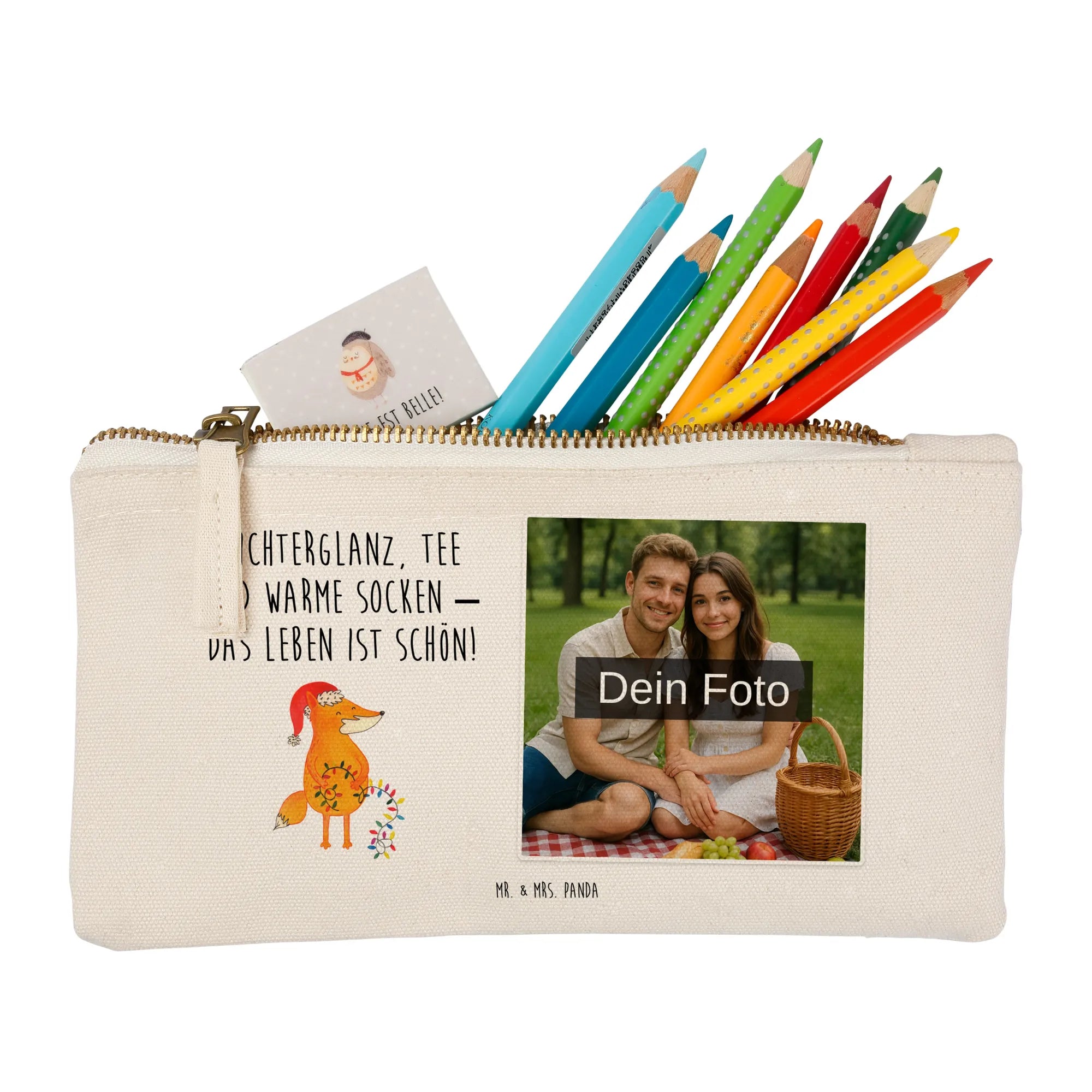 Treat yourself to a Customizable Photo Makeup Pouch by Mr. & Mrs. Panda — a tiny wonder that’s as practical as it is personal. We print our signature cute designs and optional sayings onto soft, 100% cotton fabric, then add your photo for a keepsake that’s all about you. The pouch stays nicely form-stable thanks to hemmed and tucked inner seams, and you can choose from different sizes; for a handy everyday pouch the measurement is (20 x 12 x 6 cm). To ensure a beautiful print, upload a high-resolution photo and pay attention to the crop so faces or details aren’t unintentionally trimmed. Always use images you have rights to or permission for. This little pouch is super versatile — cosmetics, receipts, pencils, or chargers all fit right in. For best care, we suggest lukewarm hand washing to protect the fabric and print. The Customizable Photo Makeup Pouch makes a sweet gift for close friends or a lovely personal treat — practical, cute, and uniquely yours.