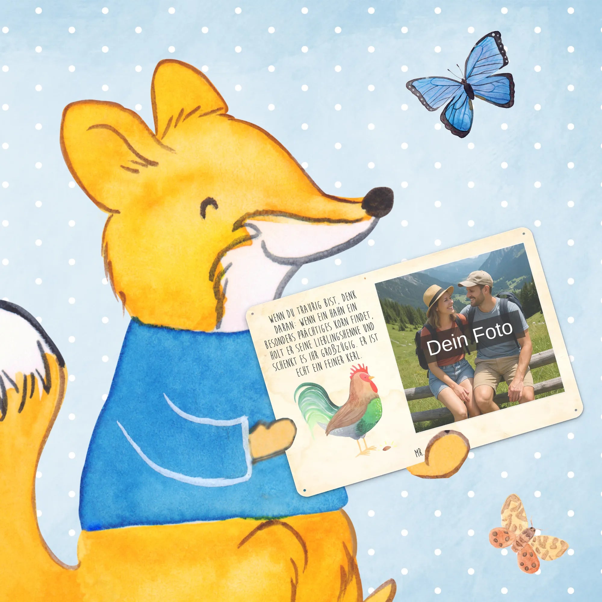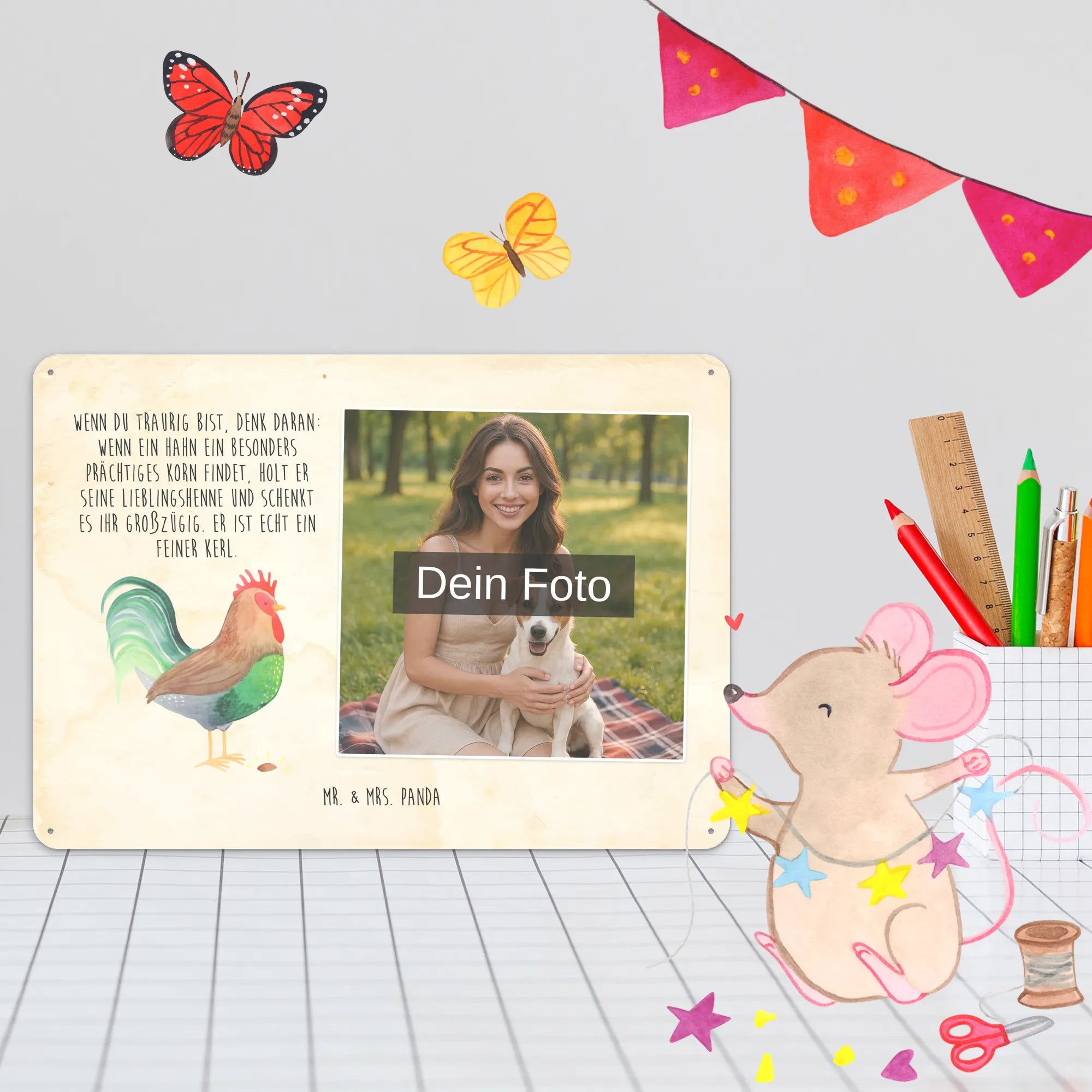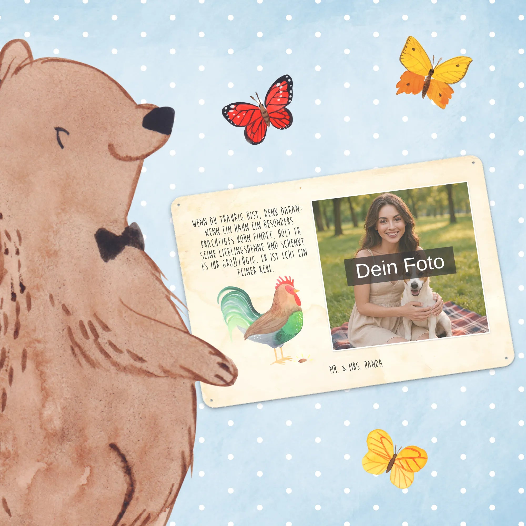 Gestalte dein persönliches Blechschild: Lade dein Foto hoch und kreiere ein einzigartiges Geschenk mit Mr. & Mrs. Panda – schnell gefertigt, liebevoll verpackt.