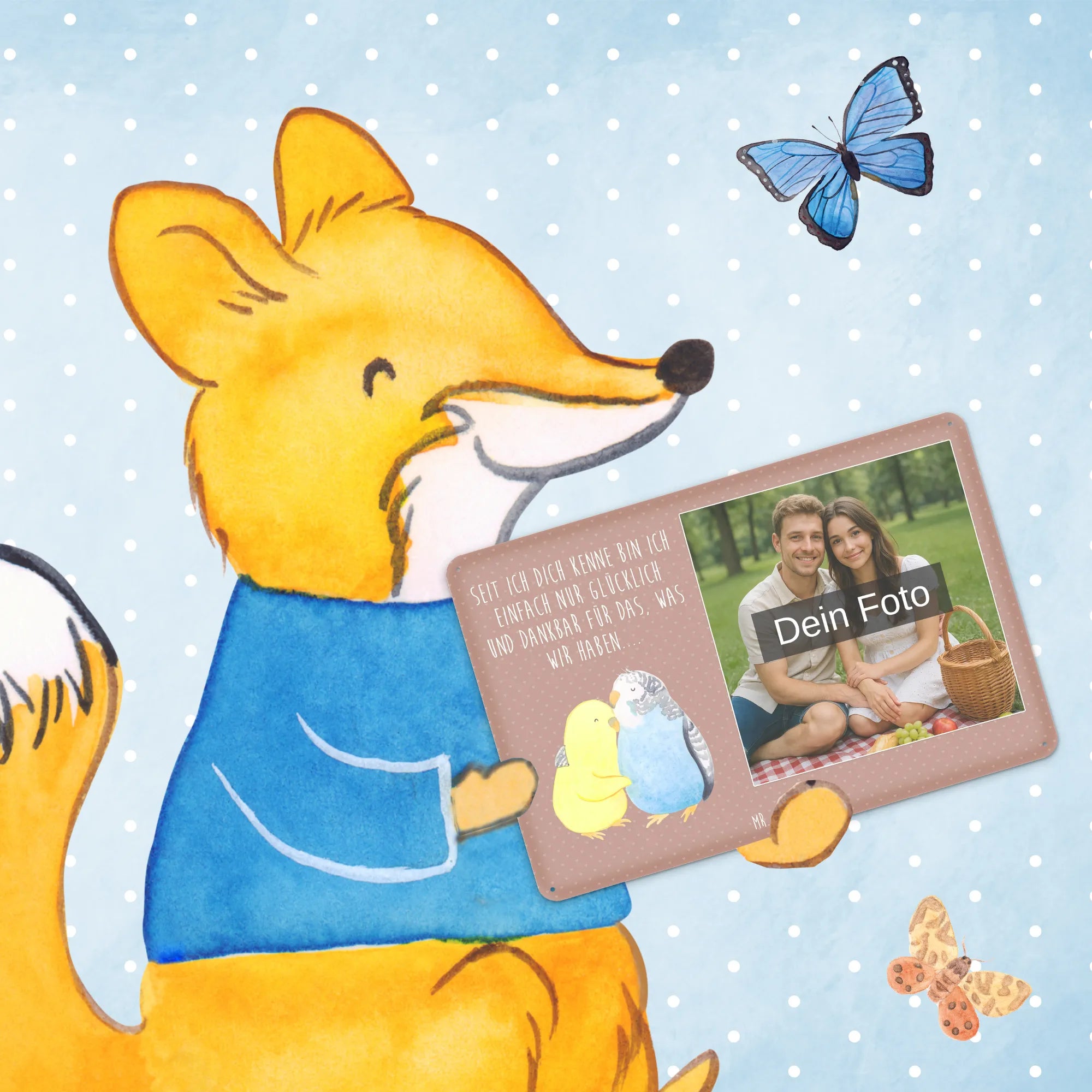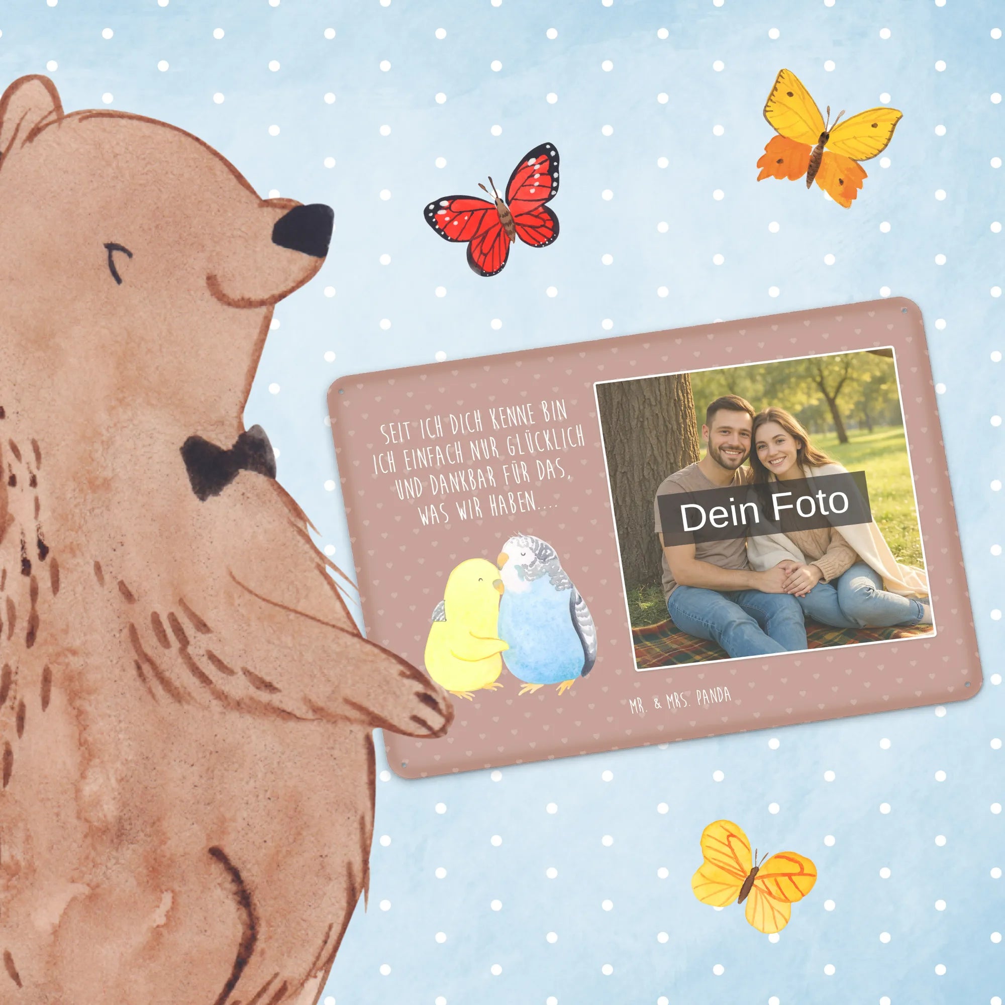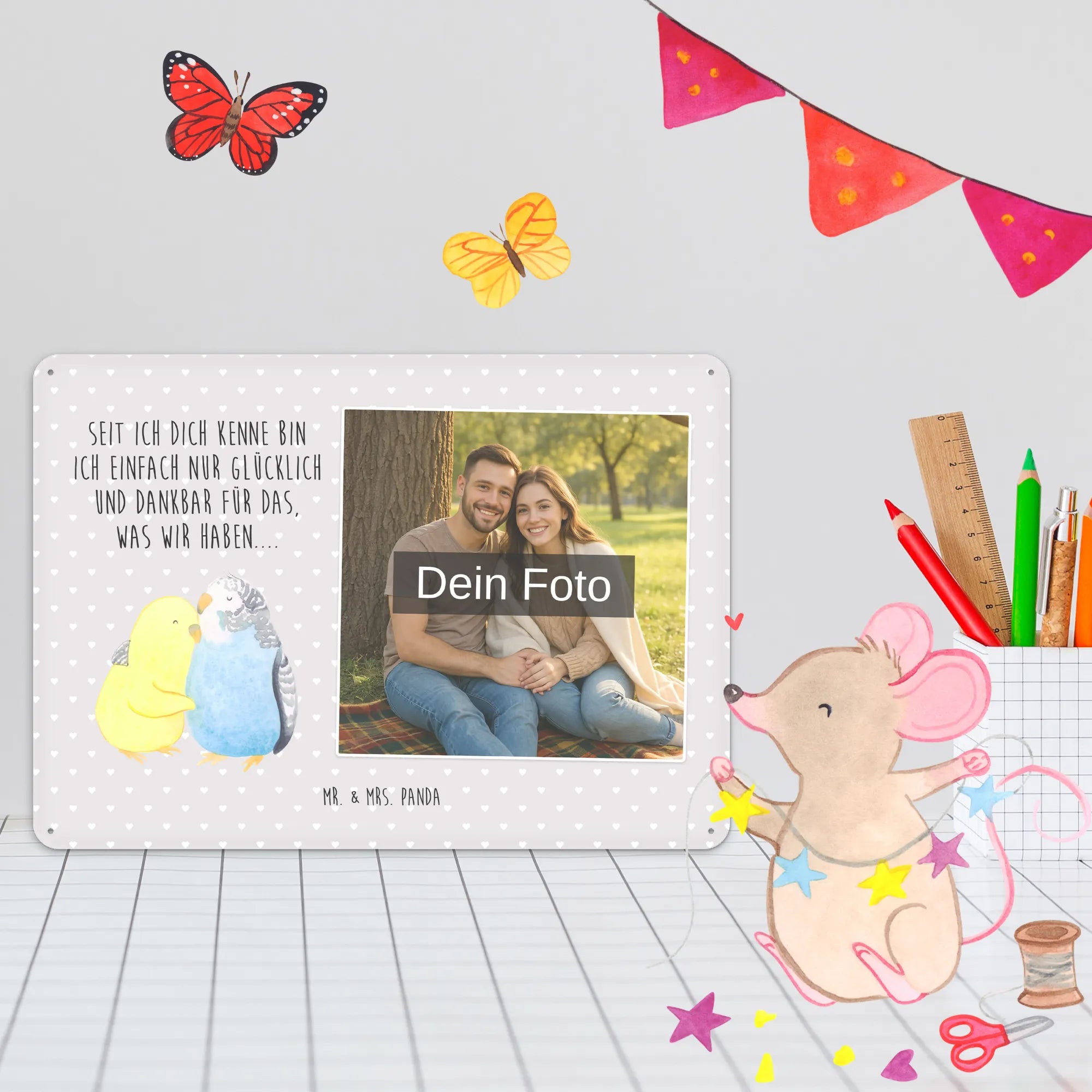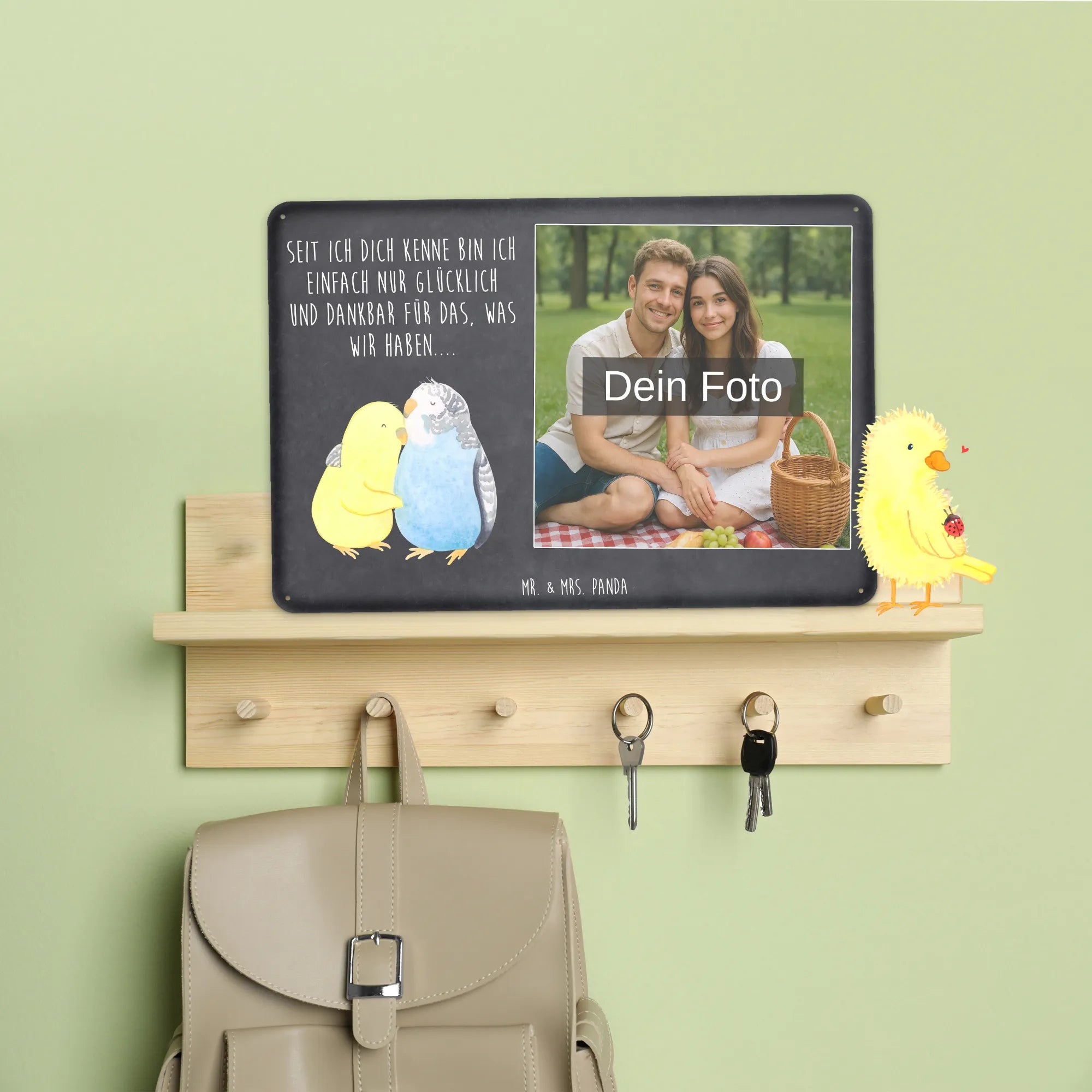 Personalized Photo Metal Sign Parakeets in love - DIN A6 - Chalkboard