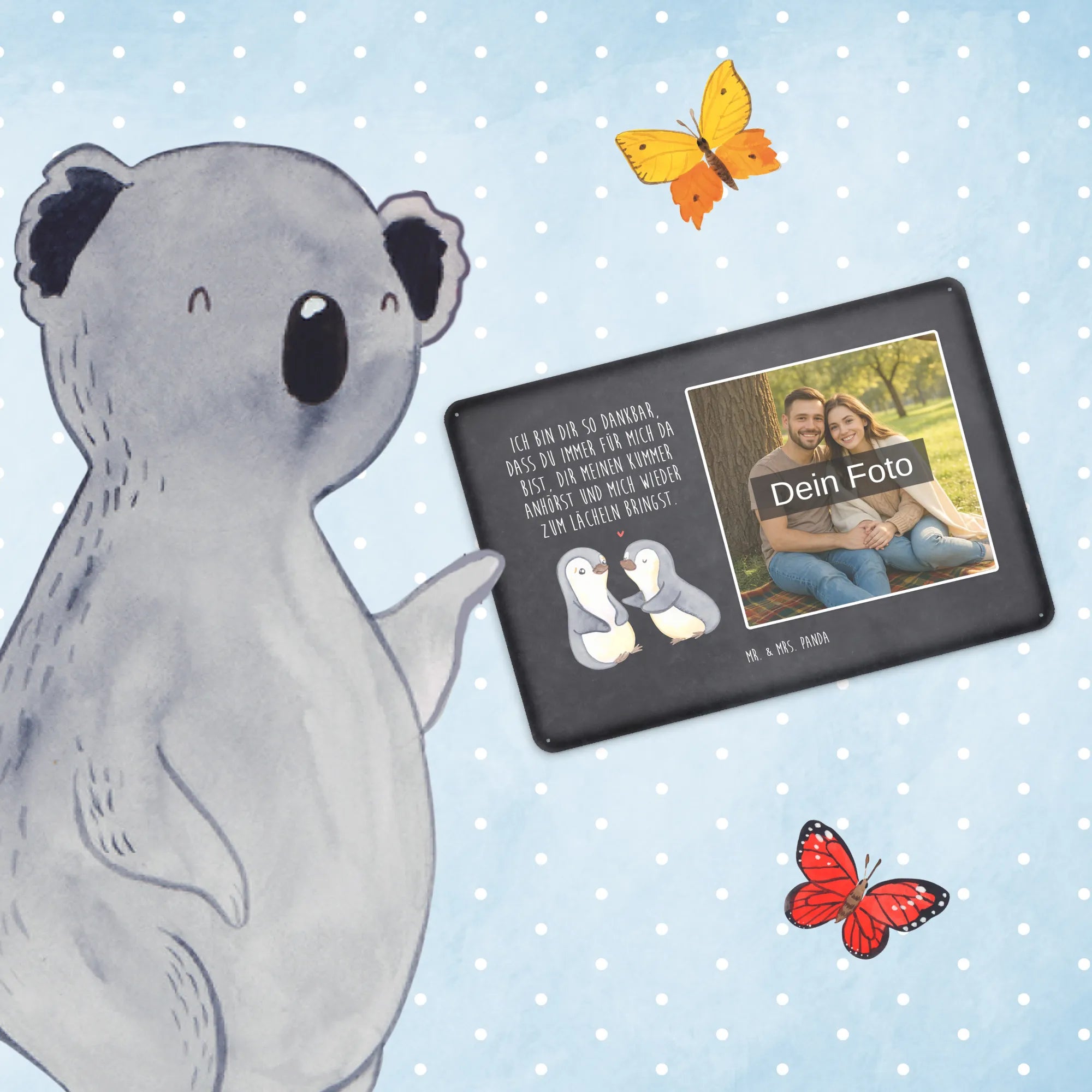 Dieses liebevoll gestaltete Metallschild mit Foto verbindet zarte Aquarell-Illustration und dein persönliches Wunschfoto zu einem einzigartigen Liebesgeschenk. Auf dem Motiv lehnen sich zwei Pinguine zärtlich aneinander – ein Bild voller Geborgenheit, Trost und Vertrautheit. Der gedruckte Spruch „Ich bin dir so dankbar, dass du immer für mich da bist, dir meinen Kummer anhörst und mich wieder zum Lächeln bringst.“ macht das Foto-Blechschild zu einer besonders emotionalen Botschaft für deinen Lieblingsmenschen.