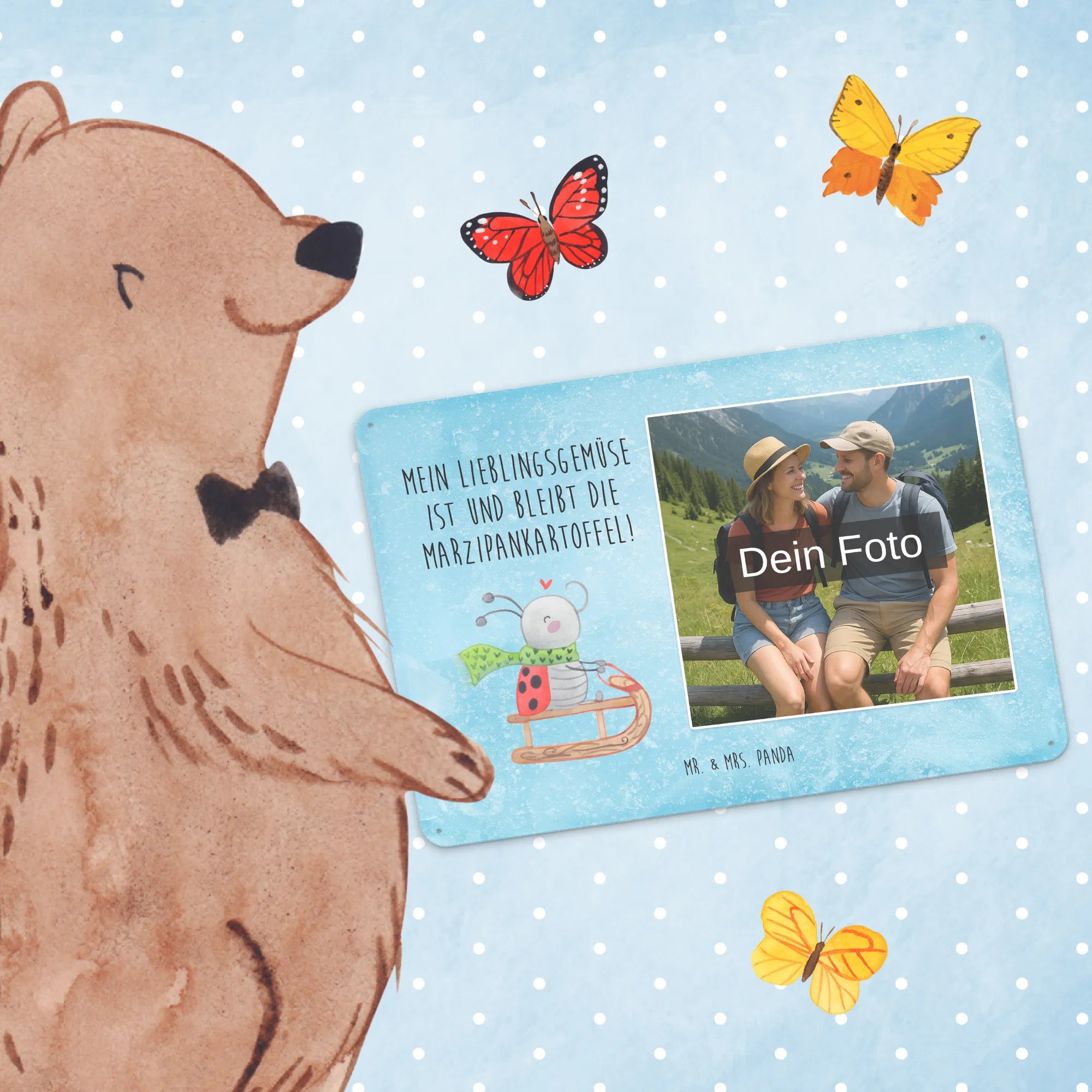 Schenke Persönlichkeit: Erstelle jetzt dein personalisierbares Blechschild Foto mit Mr. & Mrs. Panda – Foto hochladen, Text hinzufügen, bestellen und Freude verschenken.