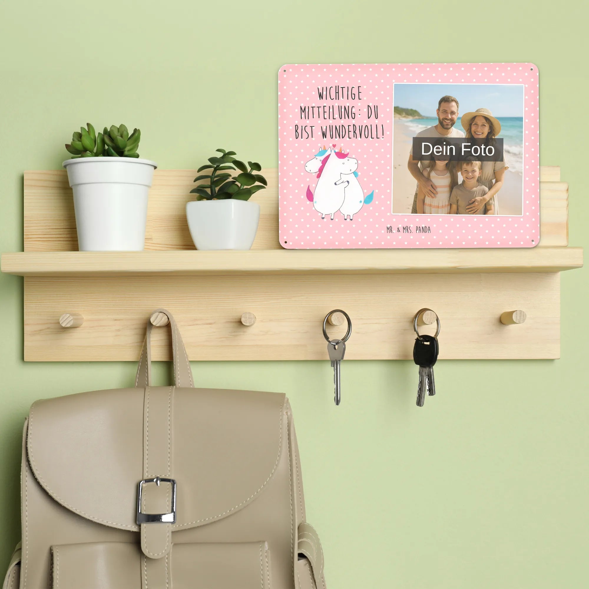 Unser personalisiertes Foto-Blechschild von Mr. & Mrs. Panda vereint liebevolles Design mit robuster Verarbeitung. Bedruckt mit süßen Motiven und herzlichen Sprüchen bringt es Wärme an jede Wand. Du kannst dein Wunschfoto einfach hochladen – denke an hohe Auflösung, einen passenden Bildausschnitt und die Bildrechte. Hergestellt aus edlem Stahlblech ohne Wölbung überzeugt das Schild durch seine seidenmatte Oberfläche und den langlebigen Druck. Maße: 70 mm x 420 mm x 297 mm. Für eine sichere Montage sorgen 4 Bohrungen; abgerundete Ecken und umgefalzte Kanten schützen vor scharfen Kanten. Das Blechschild eignet sich hervorragend als Tür- oder Wanddekoration im Innenbereich und ist eine tolle Geschenkidee zu Geburtstagen, Einzügen oder besonderen Anlässen. Pflegeleicht: einfach mit einem feuchten Tuch abwischen. Damit dein Foto perfekt wirkt, empfehlen wir, vor dem Upload den Bildausschnitt zu prüfen und die Kalender-Rahmen-Vorschau zu betrachten. In verschiedenen Größen erhältlich, sodass du das passende Format für deinen Flur, deine Küche oder dein Büro findest. Ein persönliches, edles Geschenk mit Panda-Charme – ideal für Freunde und Familie.
