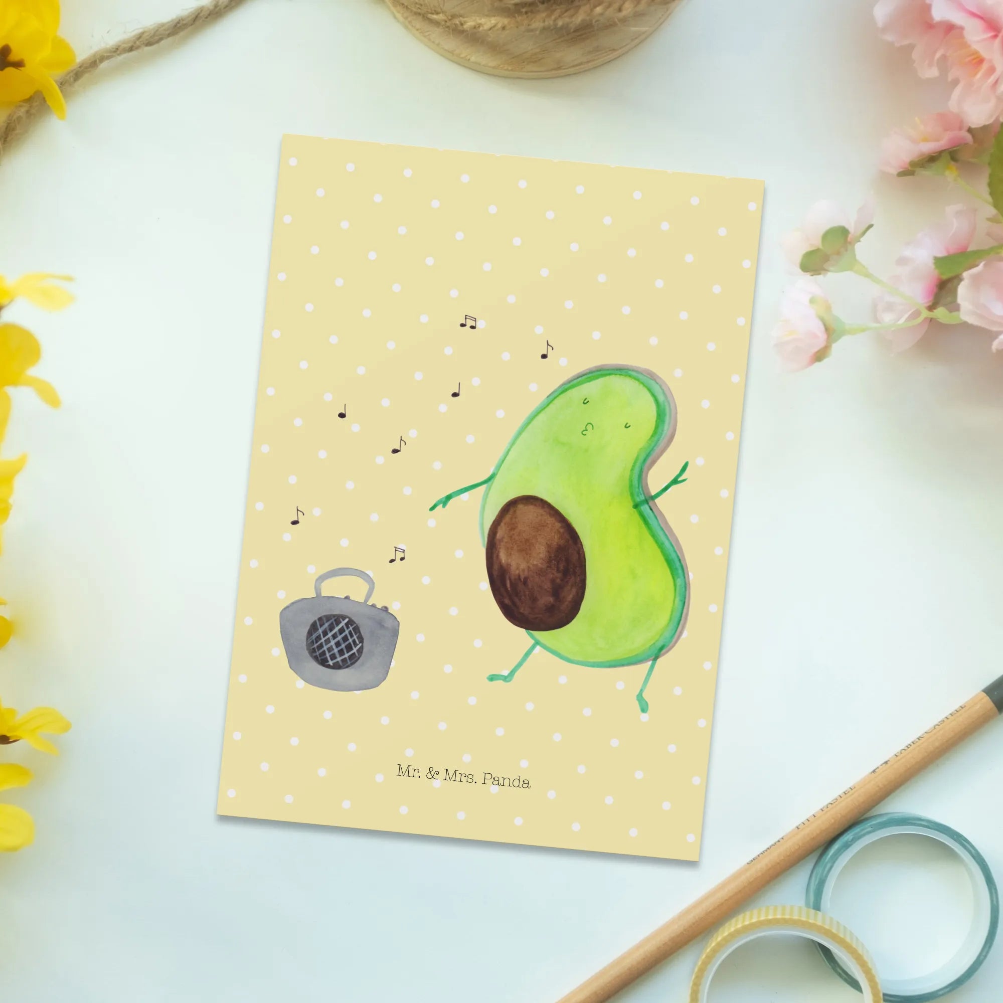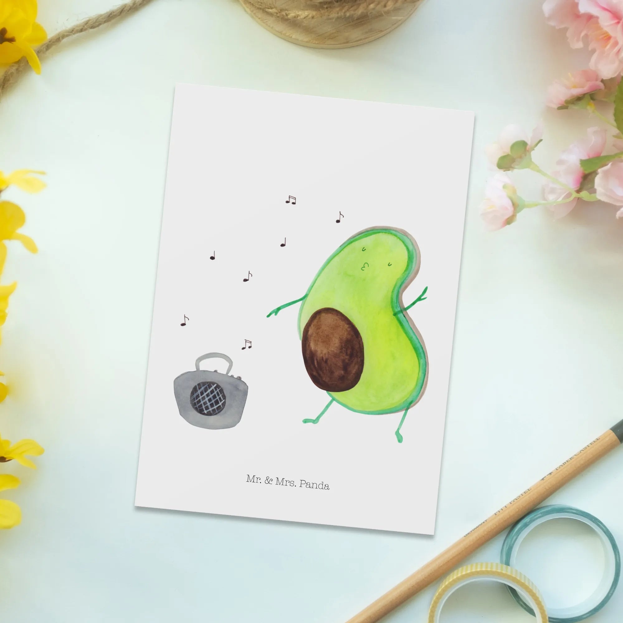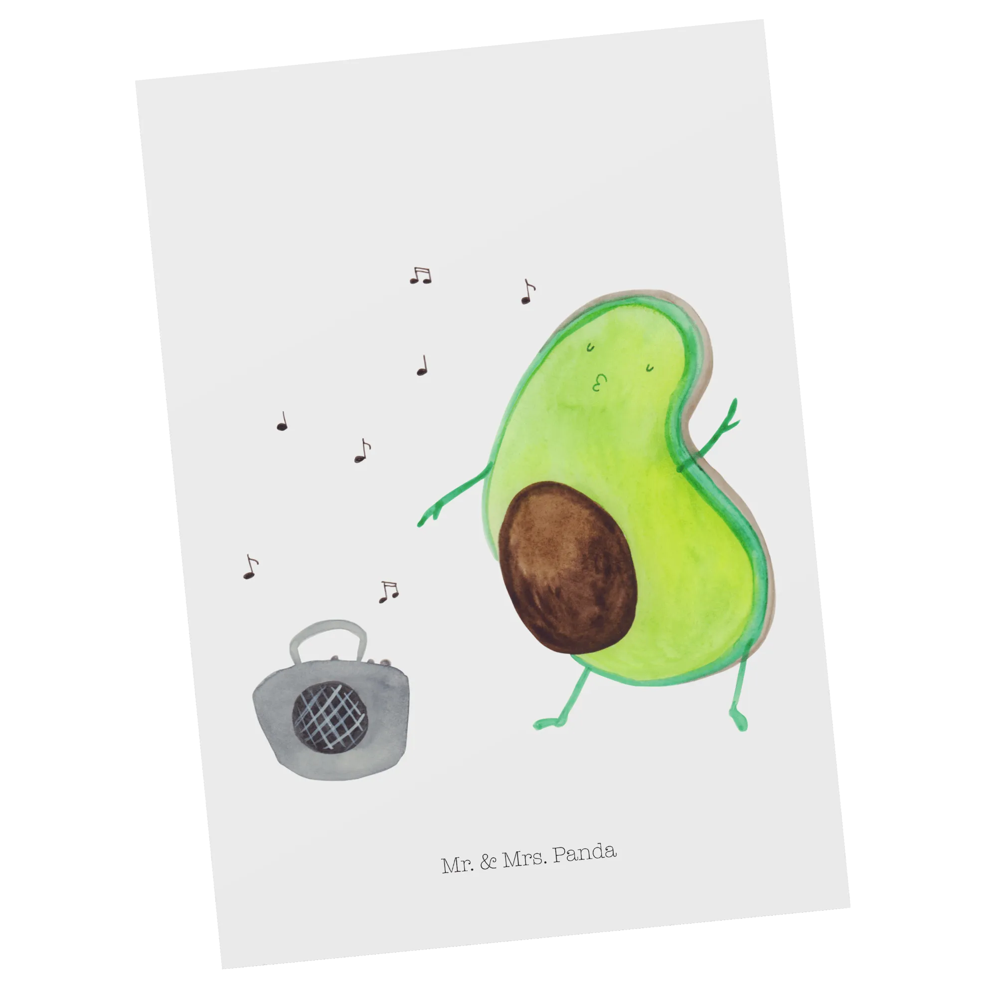 Introducing the charming Avocado Dancing Postcard from the delightful Mr. & Mrs. Panda collection! This isn't just any postcard; it's a burst of joy and a delightful way to spread happiness to your loved ones. Imagine the smiles you'll bring when you share a cute depiction of a dancing avocado, grooving to the music from a colorful ghettoblaster! Whether you're looking to send a warm invitation card, a thoughtful gift card, or just a simple postcard to brighten someone's day, this beautiful item is perfect for a variety of occasions.