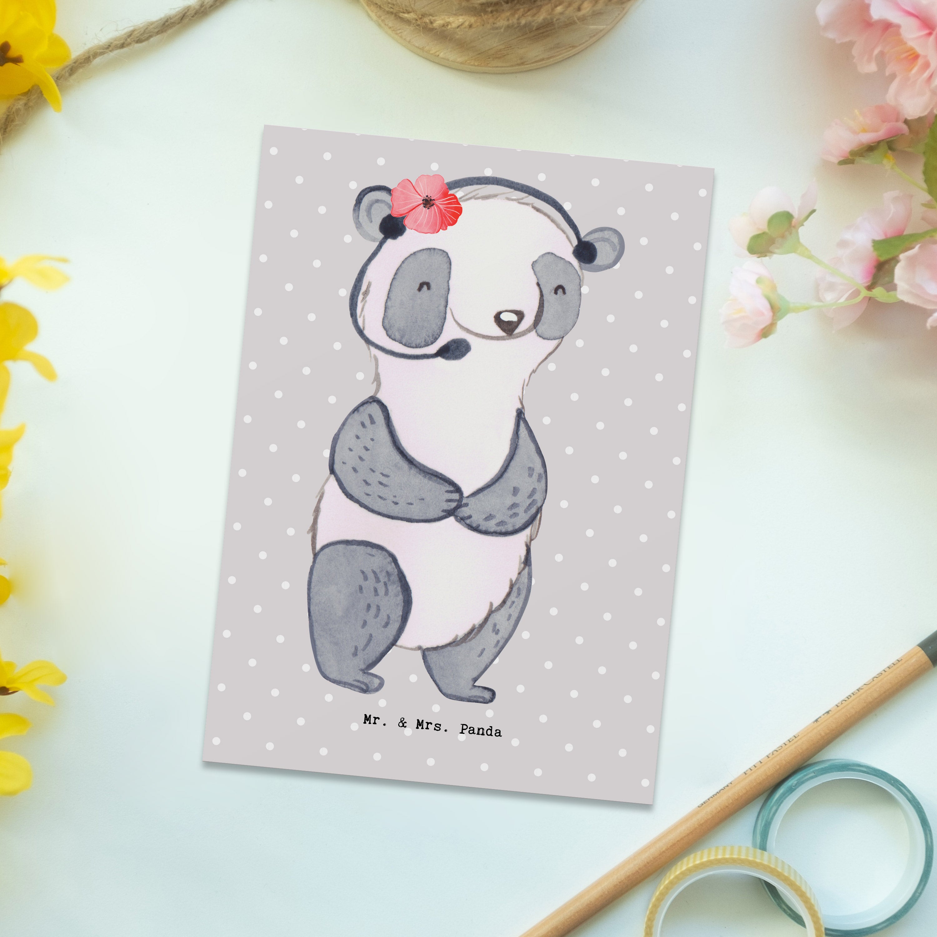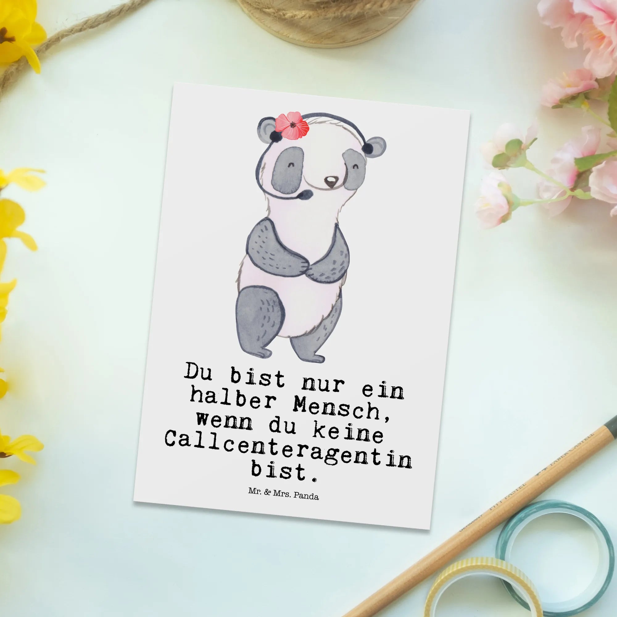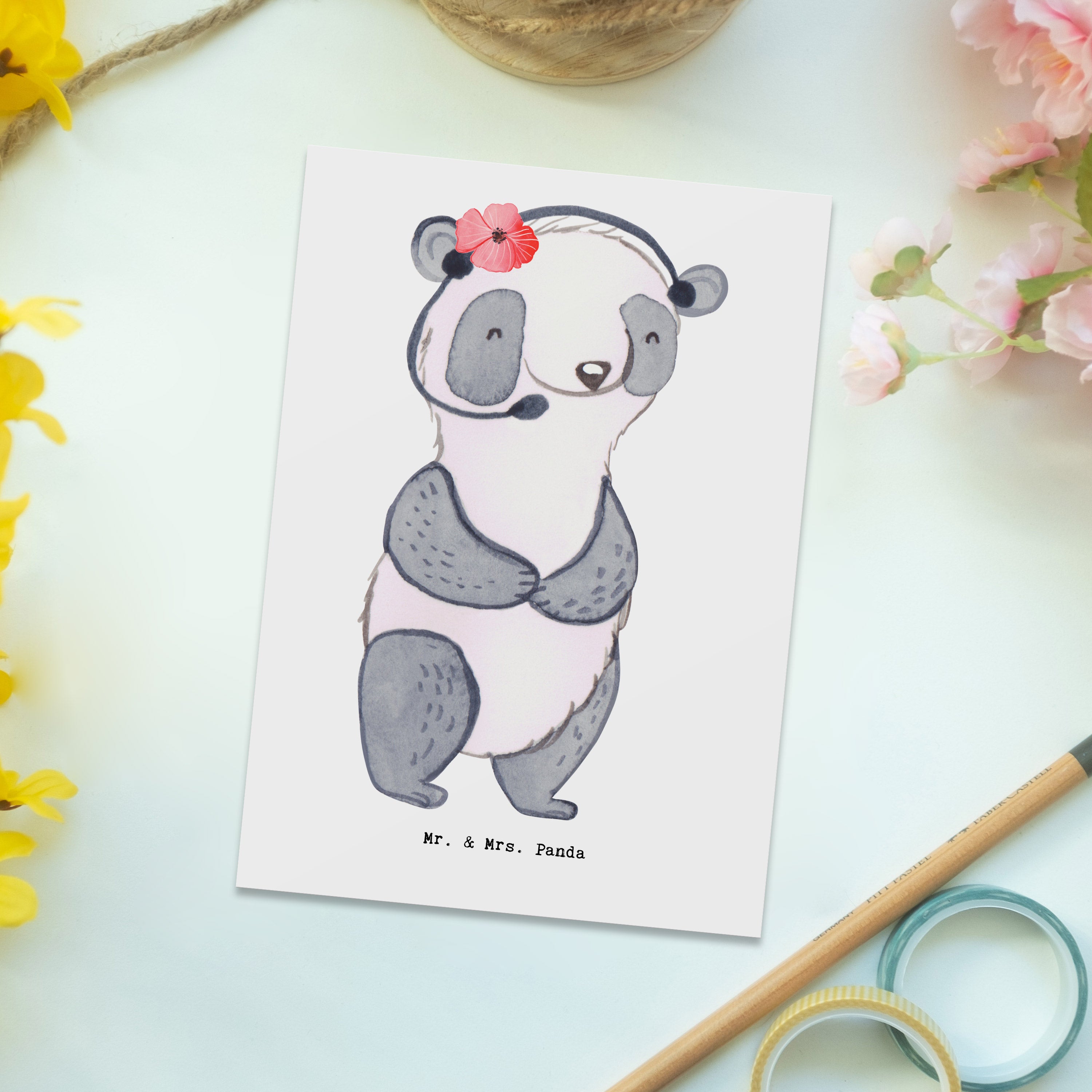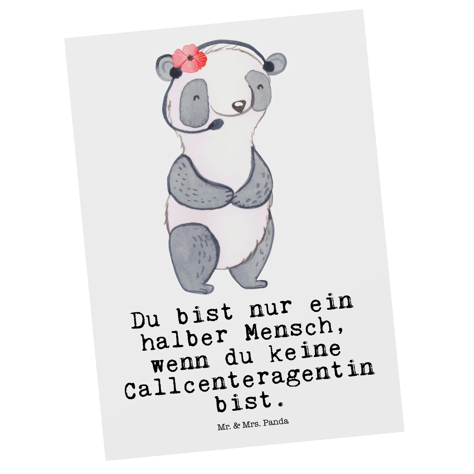 Unsere niedliche Postkarte aus der Berufe-Kollektion von Mr. & Mrs. Panda ist ein liebevolles Dankeschön an alle Callcenteragentinnen, Kundendienstmitarbeiterinnen und Backoffice-Mitarbeiterinnen. Das handgezeichnete Aquarellmotiv zeigt eine fröhliche Callcenteragentin mit Herz am Telefon – ideal als Geschenkkarte, Grußkarte oder Dankeskarte.