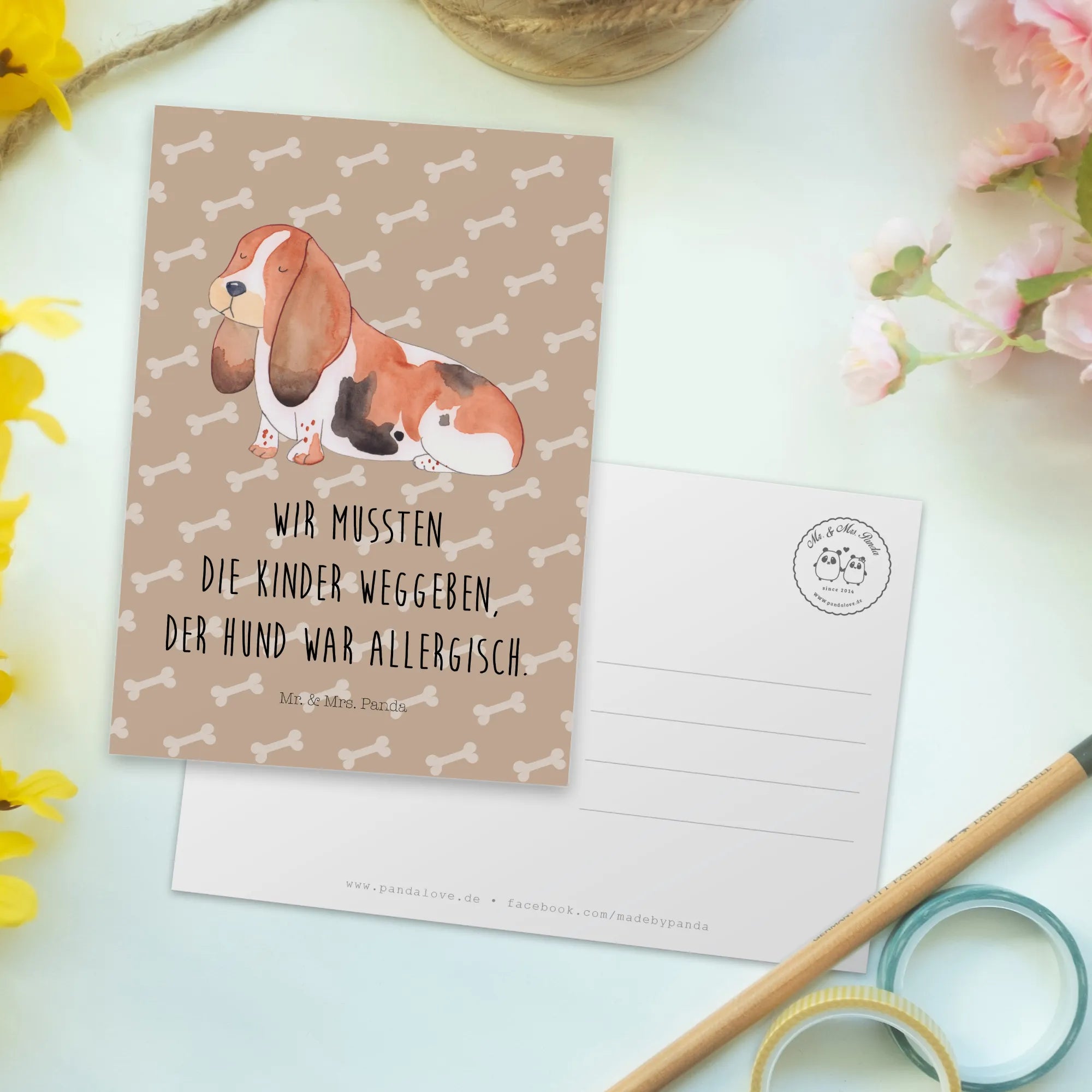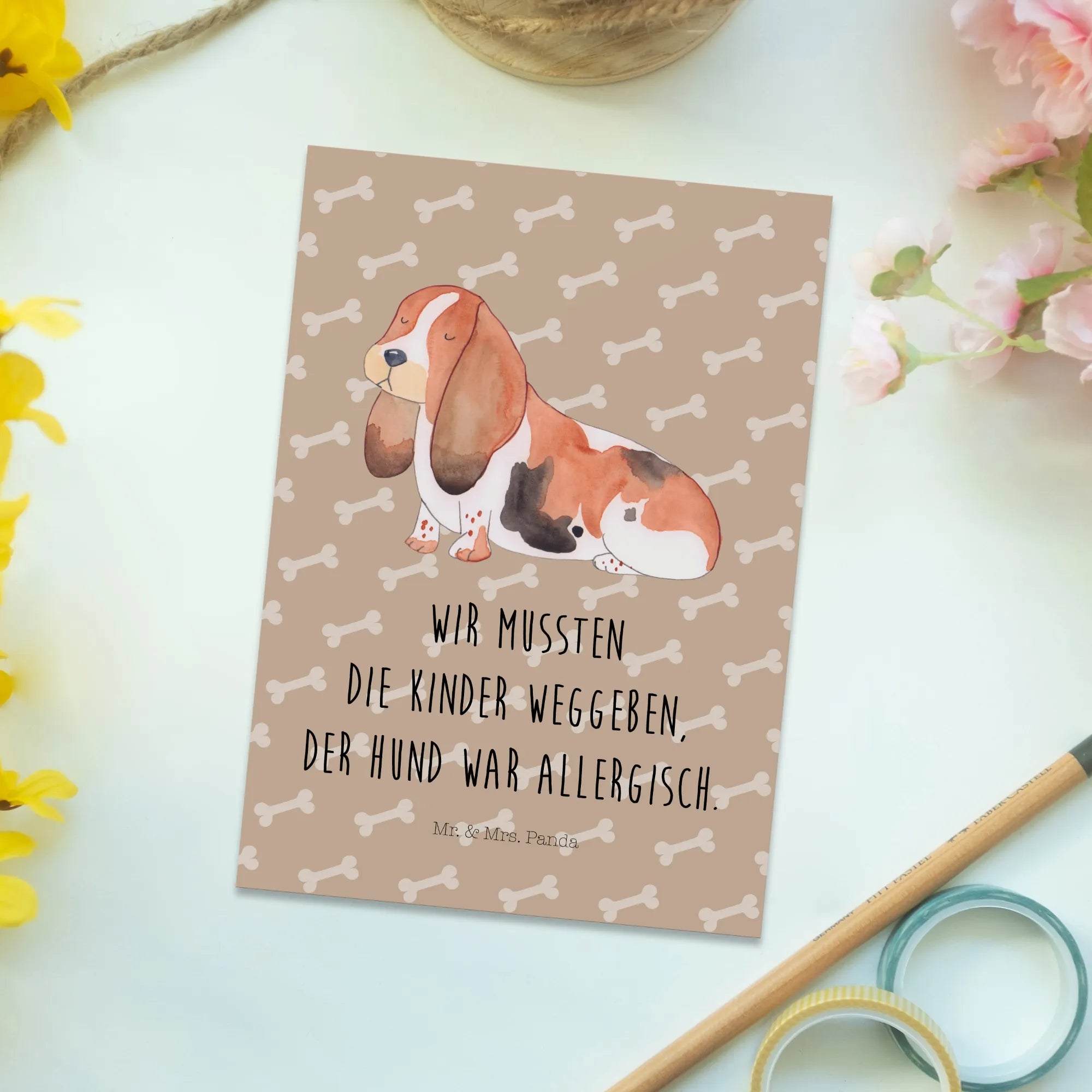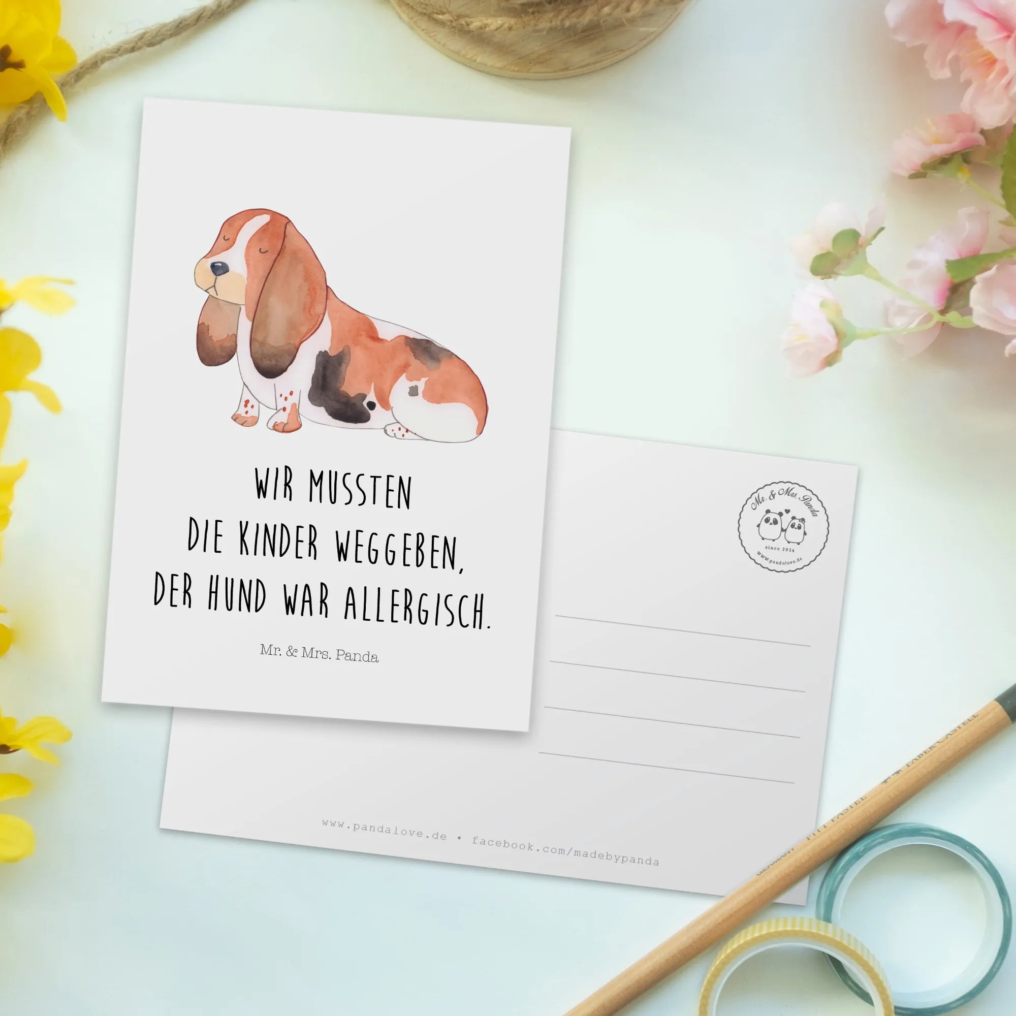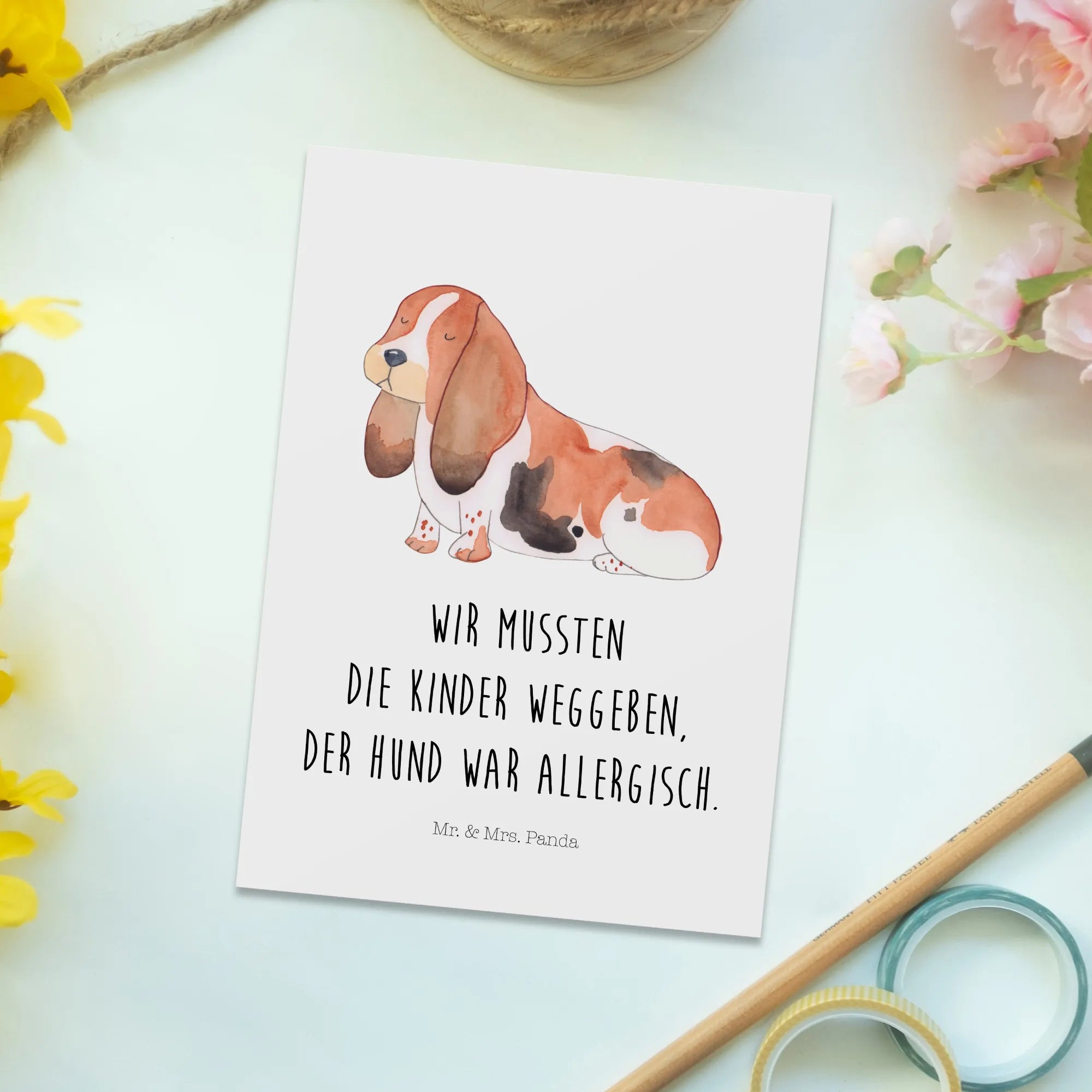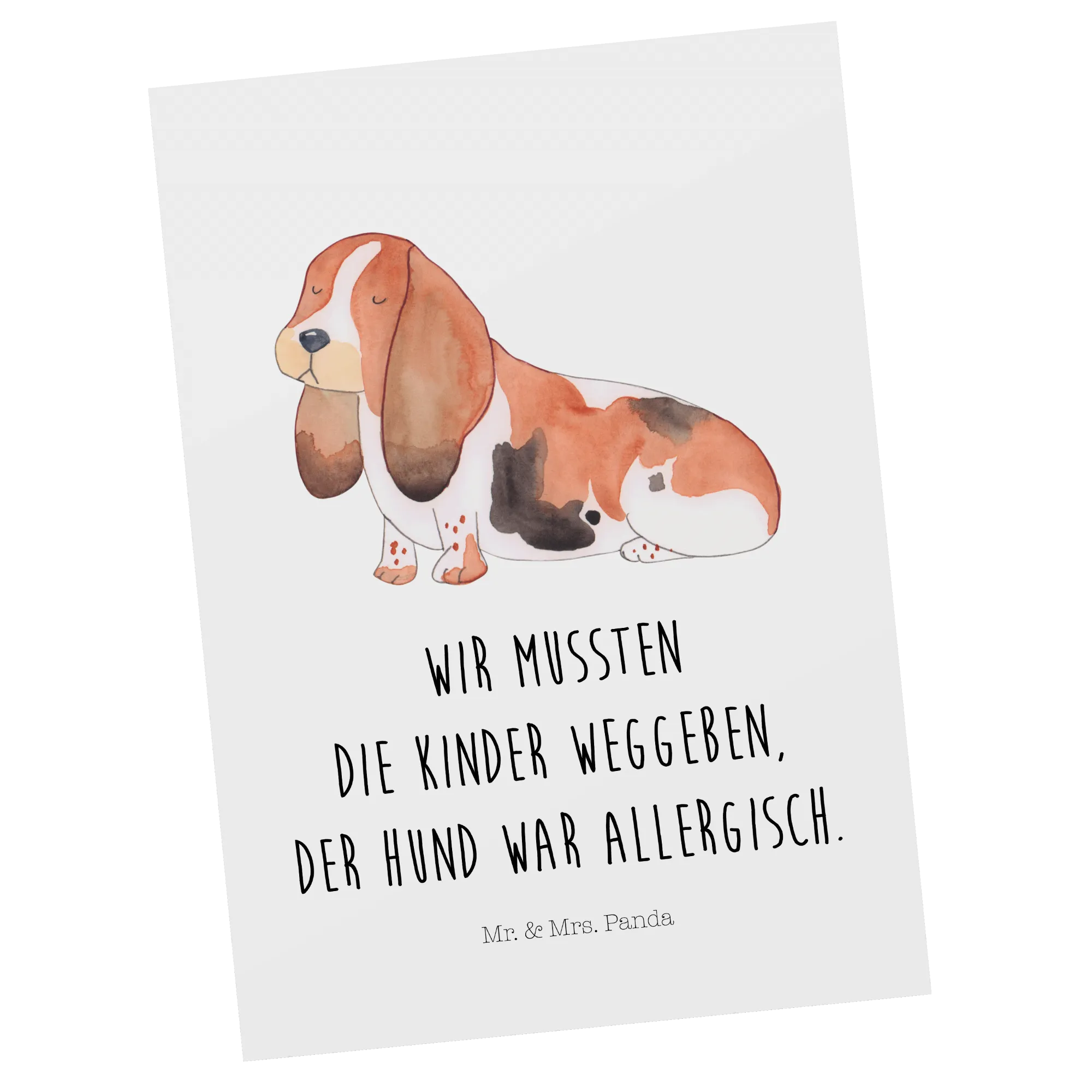 The front of this postcard features a beautifully designed Basset Hound, lovingly illustrated by Mrs. Panda. Imagine your loved ones receiving this thoughtful card, perhaps featuring the humorous slogan "We had to give the kids away. Our dog was allergic." This lighthearted phrase perfectly captures the essence of dog ownership and brings an element of fun to the gift-giving experience. Alternatively, a version without text is also available for those who prefer to pen their own thoughts.