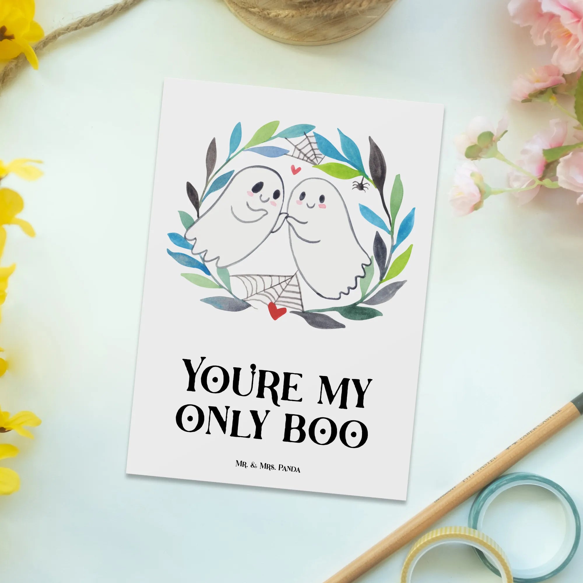 Imagine a tender scene with two playfully ghostly figures wrapped in each other's embrace. Their whimsical curves and the heart floating between them capture the sweetness of love beautifully. A background filled with vibrant greens and blues, along with clever Halloween elements like a delicate spiderweb, contribute to the fun atmosphere. As your playful duo, we proudly wear our slogan, 'You're my only boo,' celebrating the light-hearted side of romance. This motif is all about reminding everyone that love can bring joy even in the spookiest of seasons, creating a connection that warms your heart amidst the autumn chill.