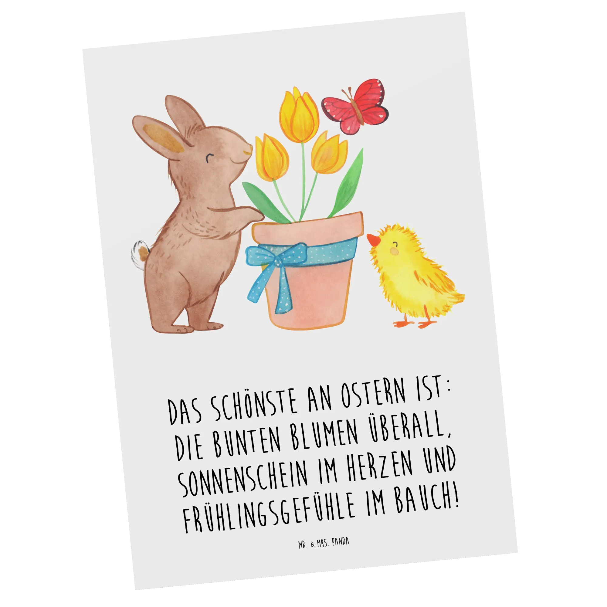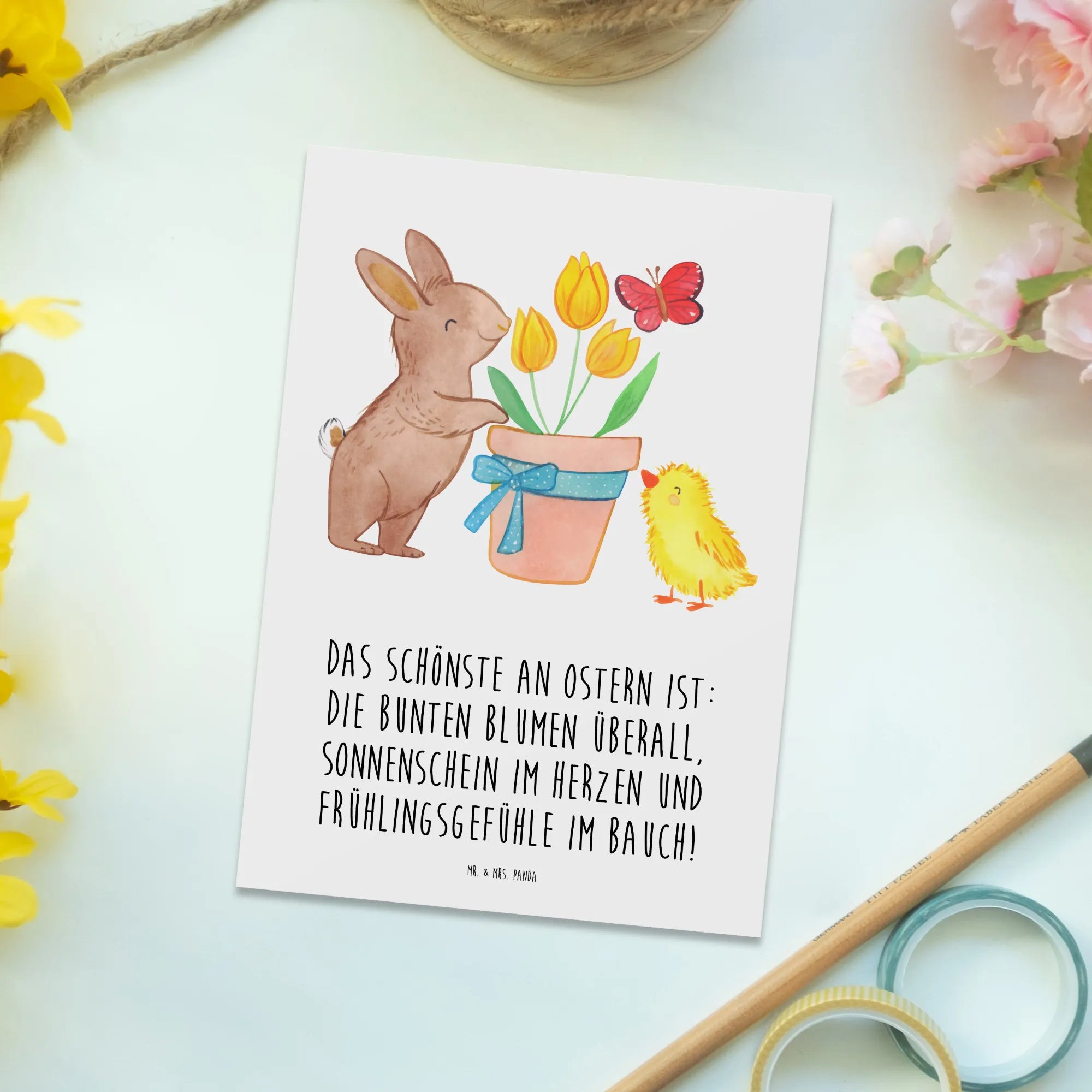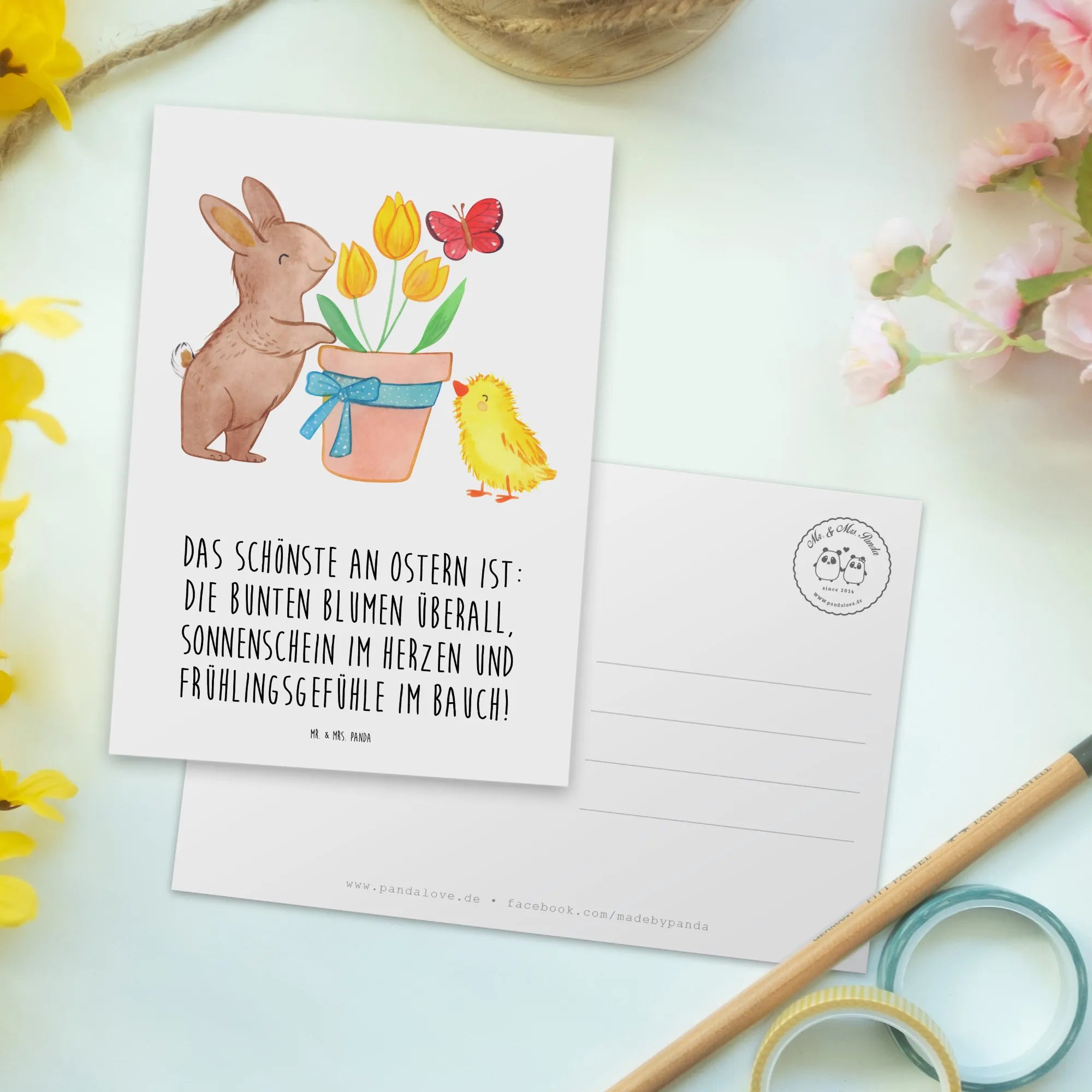 Immerse yourself in the joyful essence of Easter with our adorable bunny hugging a lovely vase of bright yellow tulips. This picturesque scene is brought to life with a playful blue polka-dotted ribbon accentuating the vase. A cute little yellow chick stands by, gazing up in awe, while a vibrant red-orange butterfly flutters playfully nearby. The warm, soft colors brighten the atmosphere, encapsulating the magic of the season. Our lovely slogan, 'Das Schönste an Ostern ist: die bunten Blumen überall, Sonnenschein im Herzen und Frühlingsgefühle im Bauch!' serves as a perfect reminder of the happiness and warmth that Easter brings.