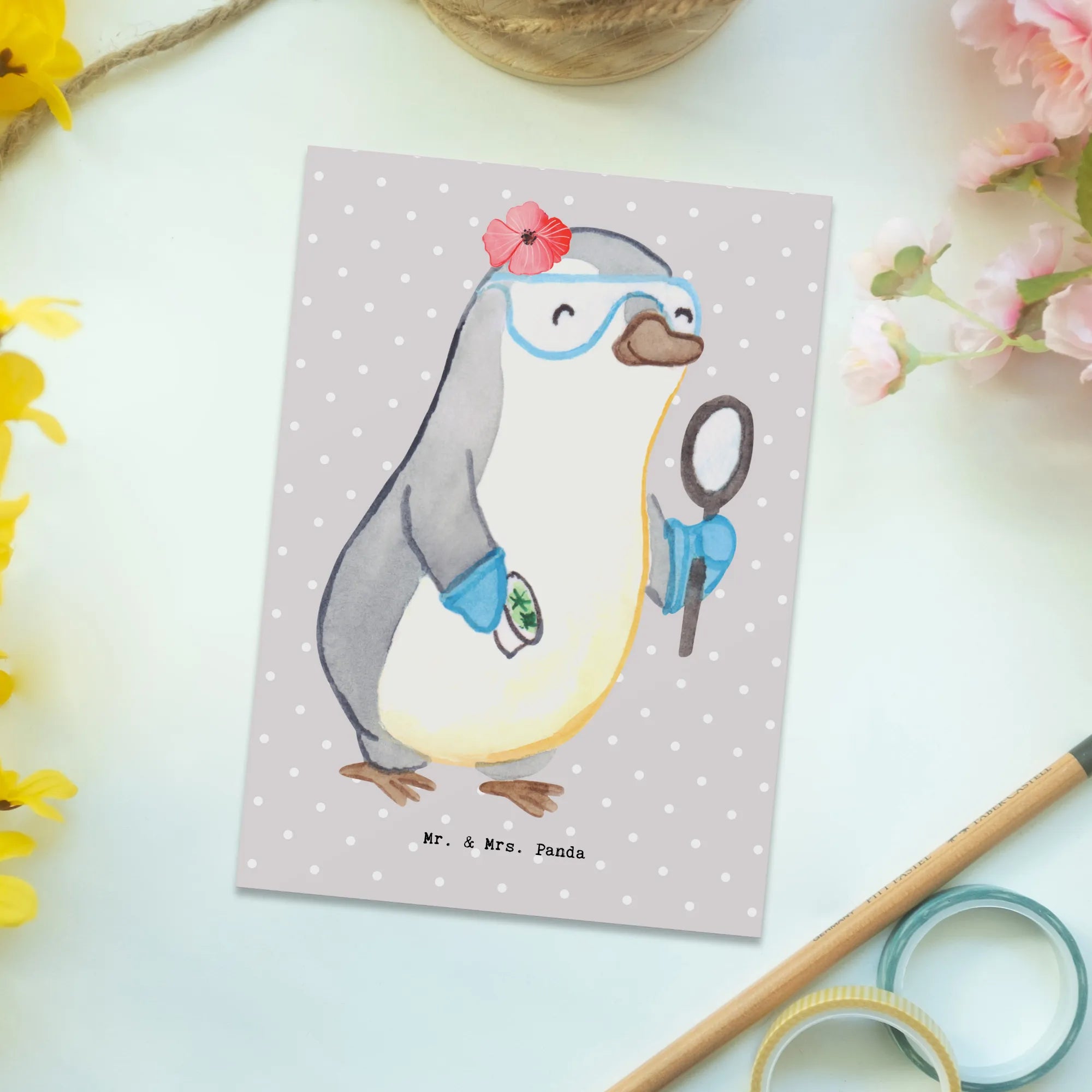 Looking for the perfect gift that speaks to the heart of every scientist or aspiring researcher in your life? Our unique Postcard featuring a charming scientist motif is just what you need! This delightful design, created by the talented Mr. & Mrs. Panda, showcases an adorable female penguin in rubber gloves, meticulously holding a test tube while wearing protective goggles. It’s a playful tribute to the world of science and research, making it an ideal choice for anyone involved in academia, be it a student, professor, or a hardworking researcher.