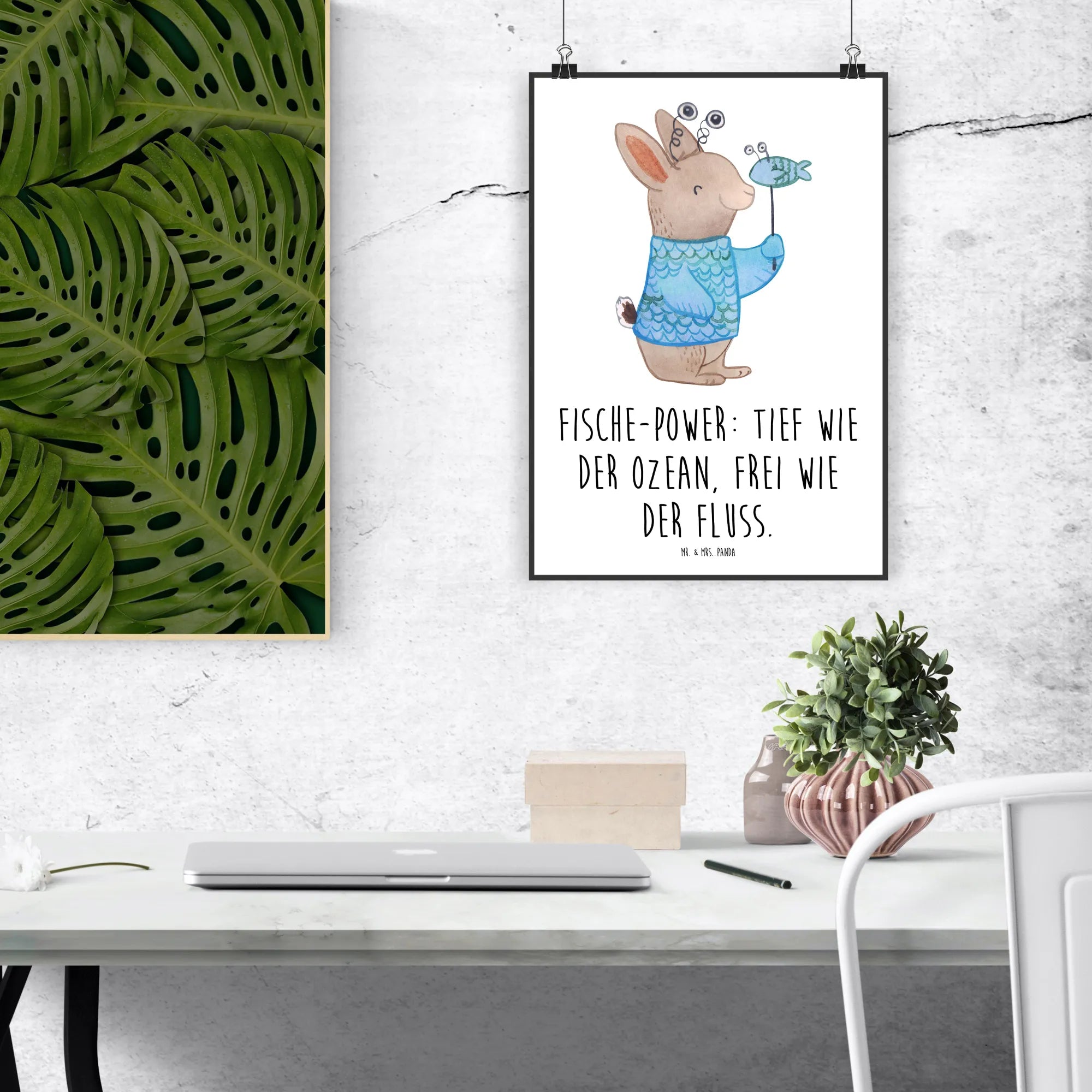 Welcome to the vibrantly whimsical world of our Pisces motif! A friendly rabbit holding a charming, anthropomorphized fish captures the joyful essence of this water sign. Dressed in a blue outfit featuring shimmering fish scales, this delightful rabbit embodies the creative flow and emotional depths cherished by Pisceans. The fish, complete with its own glasses and expressive arms, adds a layer of fun and quirkiness. With the slogan 'Fische-Power: Tief wie der Ozean, frei wie der Fluss', this artwork is not just decoration; it’s a celebration, making it the perfect birthday gift to uplift your beloved Pisces friends and family.