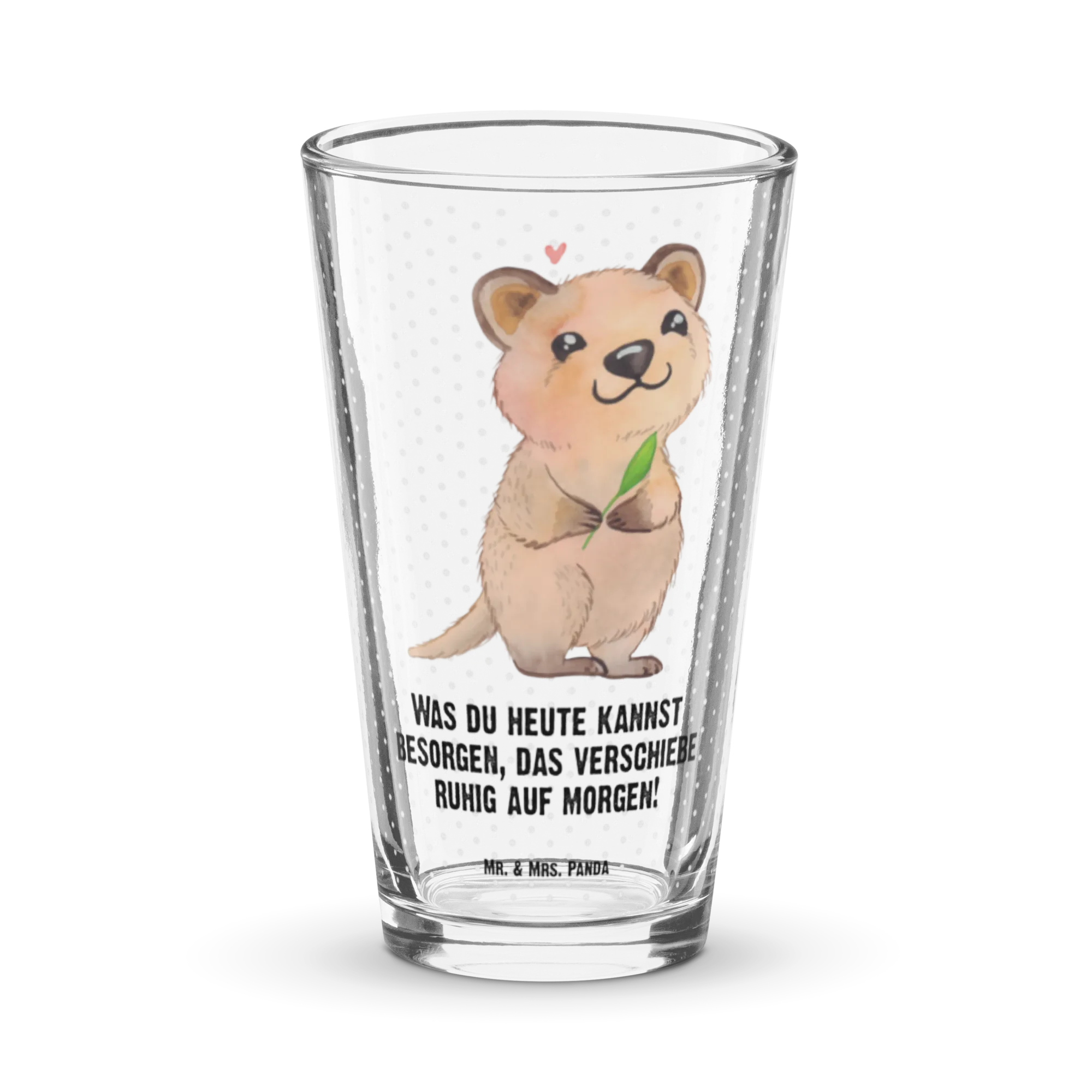Das süße Quokka mit seinem strahlenden Lächeln hält ein grünes Blatt und über ihm schwebt ein kleiner, rosa Herzchen – das vermittelt pure Lebensfreude! Das Trinkglas ist mit dem lustigen Spruch "Was du heute kannst besorgen, das verschiebe ruhig auf morgen!" versehen und bringt somit gute Laune in jeden Tag.