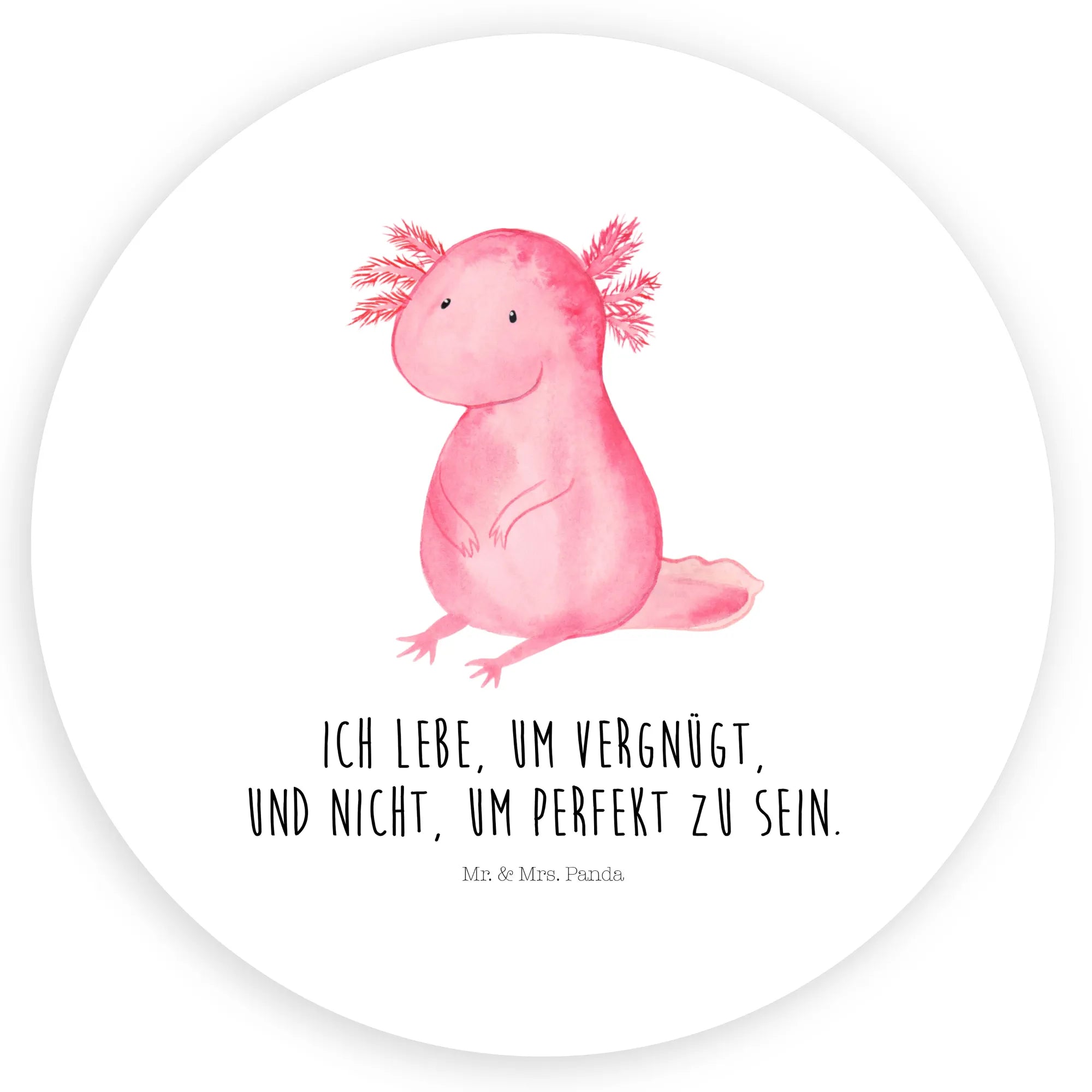 Ein zauberhafter 40mm Rund Aufkleber von Mr. & Mrs. Panda – perfekt für kleine Freuden im Alltag. Unser runder Aufkleber zeigt einen niedlichen Axolotl aus der Axolotl-Kollektion, liebevoll gezeichnet und mit dem herzerwärmenden Spruch „Ich lebe, um vergnügt und nicht um perfekt zu sein.“ versehen. Ein kleines Kunstwerk, das als Kinderaufkleber, Gastgeschenkaufkleber oder Scrapbooking-Sticker sofort für gute Laune sorgt.