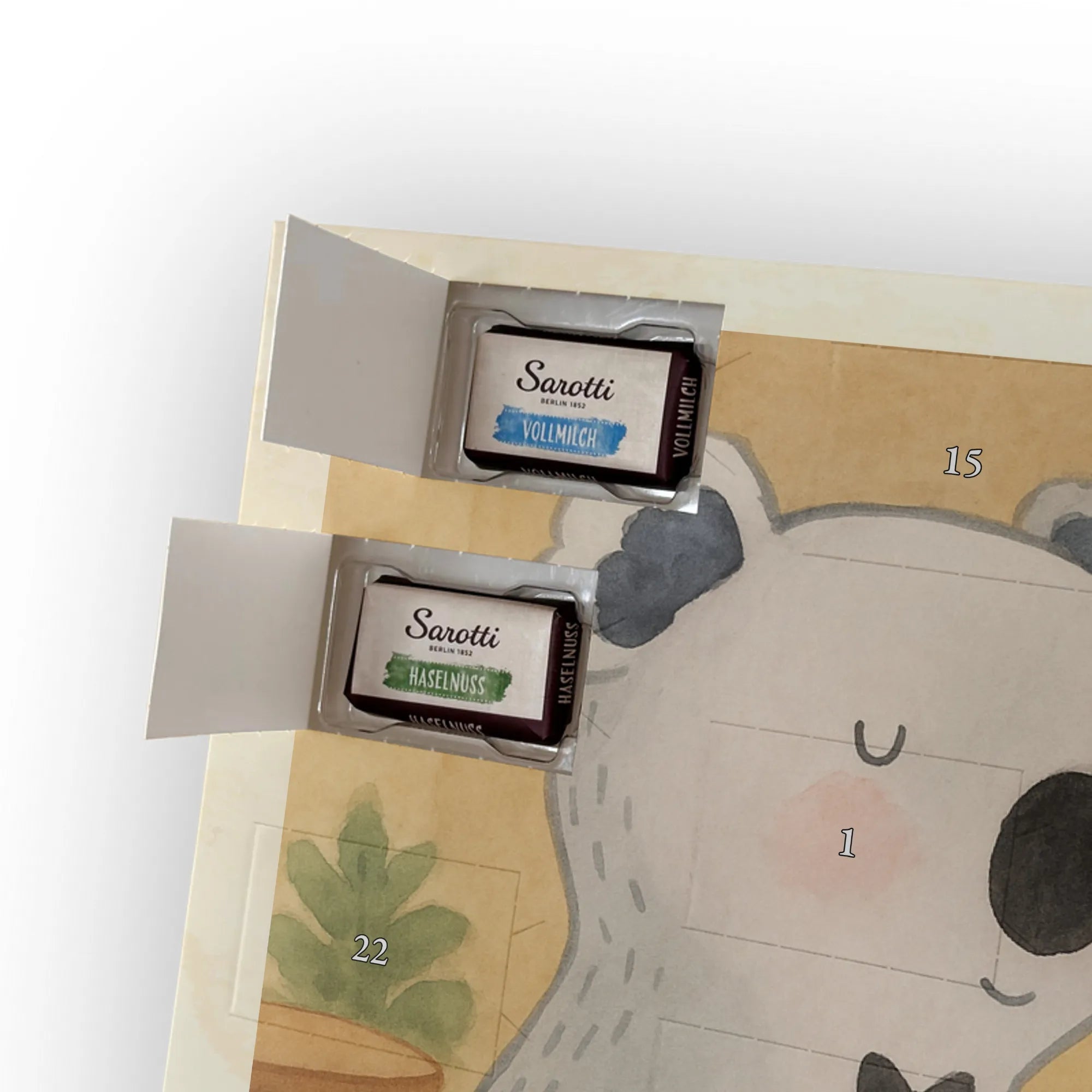 🐼 Adventskalender mit Schokolade: Liebevoll bedruckt, seidenmatter Lack, edles Design.