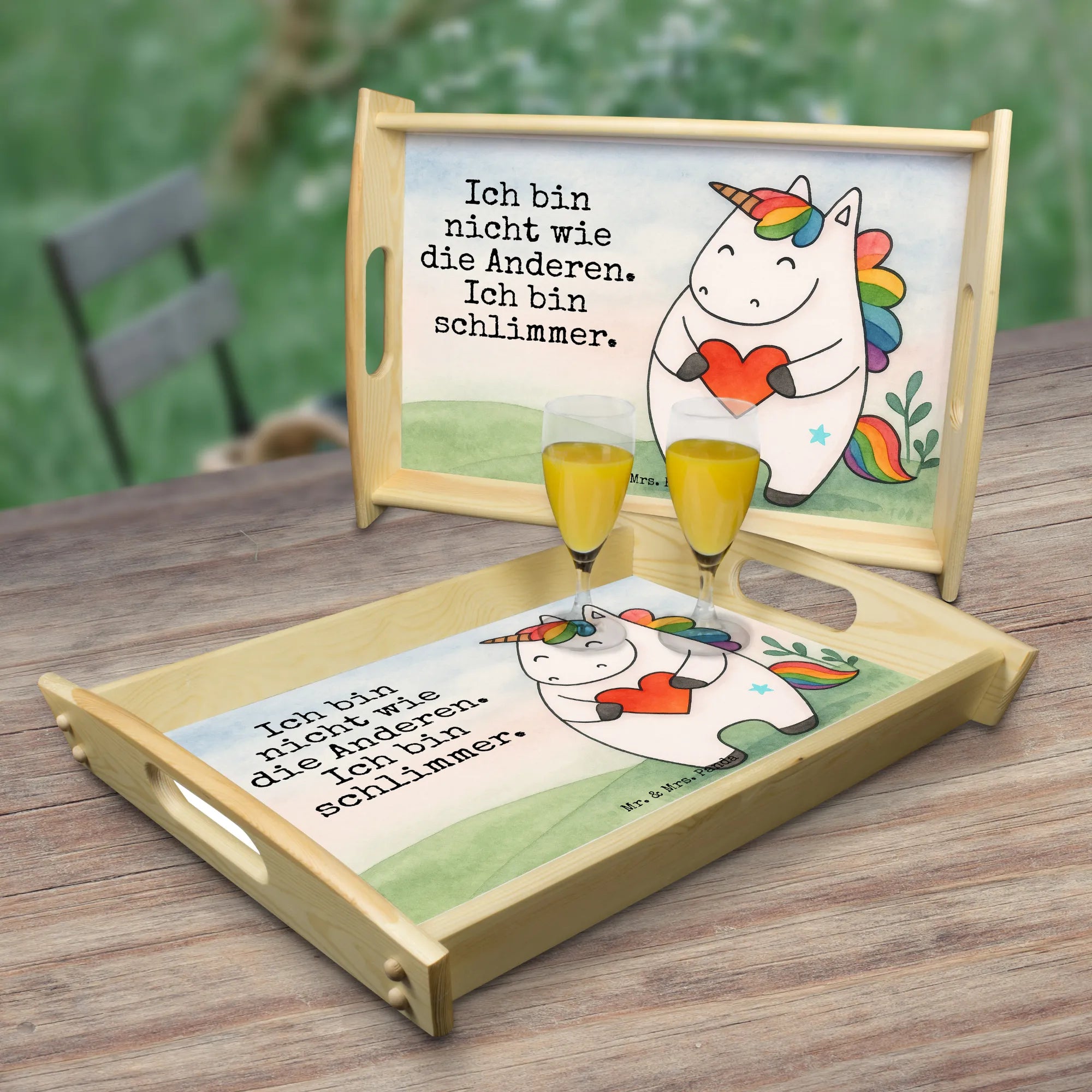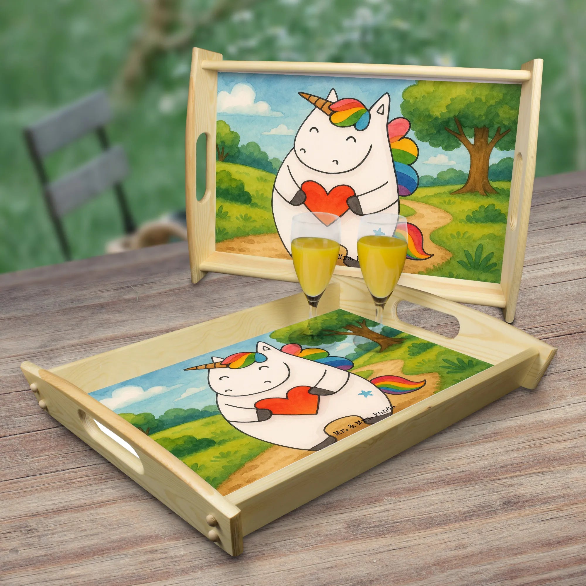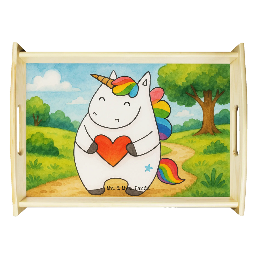 Das einzigartige Serviertablett von Mr. & Mrs. Panda wird dein Frühstücksbuffet zum Erlebnis machen! Mit seinen großzügigen Maßen von 480 mm x 480 mm x 65 mm und einem Gewicht von 925 g ist es die perfekte Kombination aus Funktionalität und Stil. Aus hochwertigem, lasiertem Echtholz gefertigt, verzückt das Tablett mit einem strahlenden Druck, der für gute Laune sorgt. Ob im Bett oder auf dem Sofa, die seitlichen Griffmulden garantieren ein angenehmes Handling. Die spezielle Anti-Rutsch Beschichtung sorgt dafür, dass alles sicher an seinem Platz bleibt. Dank der kratzfesten Oberfläche ist das Tablett sehr pflegeleicht – einfach mit einem feuchten Tuch und etwas Spülmittel abwischen. Bitte nicht einweichen! Denke daran, dass die Anfertigung wegen der hohen Qualität etwas Zeit in Anspruch nimmt.
