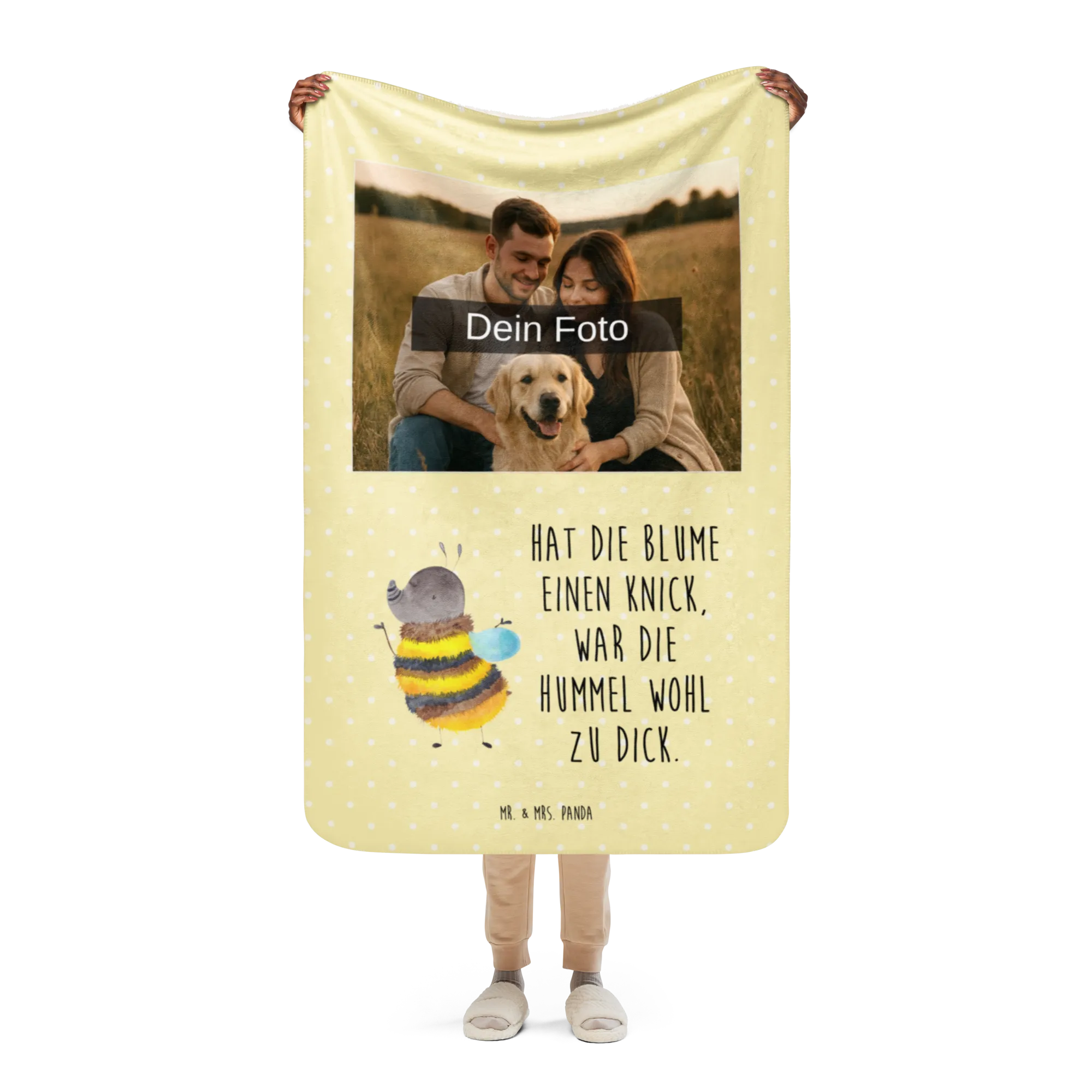 Erlebe die warme Umarmung unserer Sherpa Foto Kuscheldecke von Mr. & Mrs. Panda! Mit einer großzügigen Größe von 1300 mm x 1550 mm bietet sie ausreichend Platz, um dich darin einzukuscheln. Die Decke besteht aus 100 % ultrweichen Polyesterfasern, die perfekt in 51,5 % glattem Obermaterial und 48,5 % kuscheligem Sherpa unterteilt sind. Das Anfassgefühl ist einfach himmlisch! Mit einer Stoffstärke von 220 g/m² und 240 g/m², ist diese Decke nicht nur funktional, sondern auch ein optisches Highlight in jedem Raum. Ihre leuchtenden Farben und das liebevolle Design mit Sprüchen und Motiven von Mr. & Mrs. Panda verleihen jedem Moment magische Momente. Perfekt für gemütliche Filmabende oder entspannende Stunden zu Hause. Vergiss nicht, die Decke vor der ersten Nutzung zu waschen, um ihre volle Pracht zu genießen!