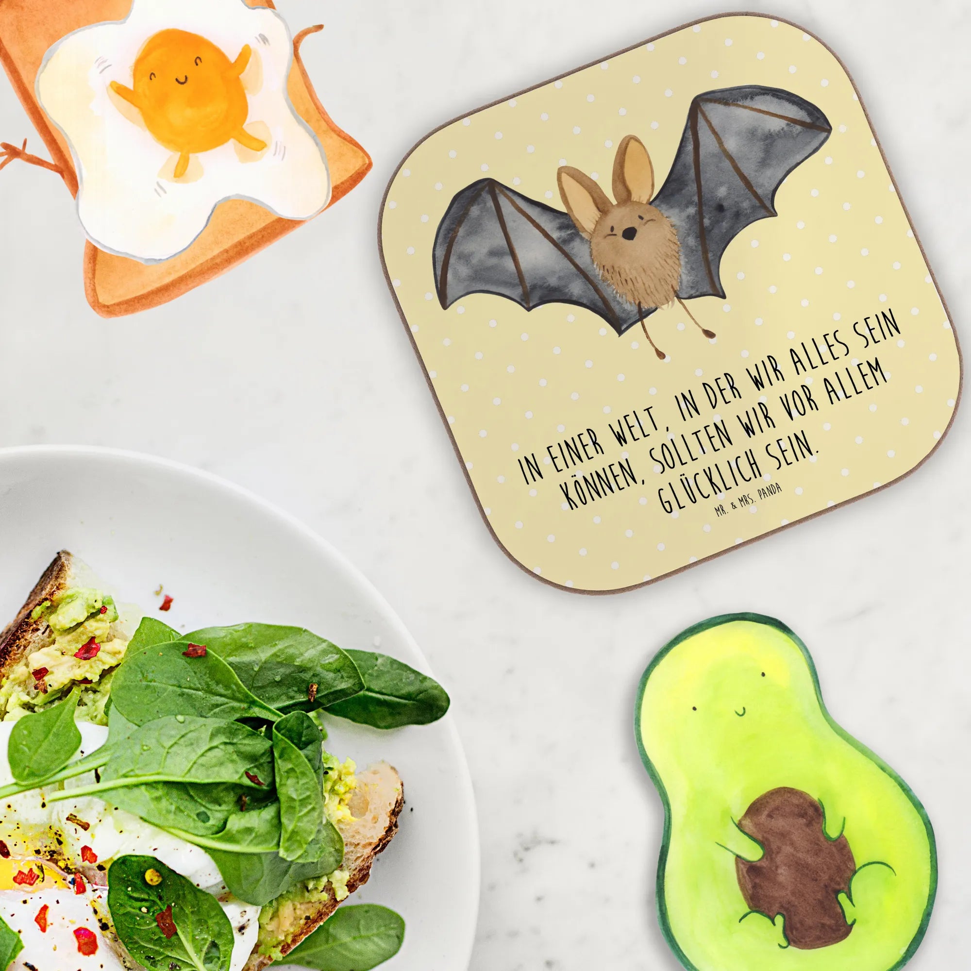 Imagine hosting a lively breakfast party with friends or enjoying a cozy evening at home, all while showcasing this adorable bat in flight. Each coaster is designed with an enchanting image of a bat flapping its wings, reminding you to embrace life with passion and a positive spirit. As our charming slogan reminds us, "In a world where we can be anything we want to be - being happy is still the most important thing." Let this cute little creature inspire you and your guests to live life to the fullest!