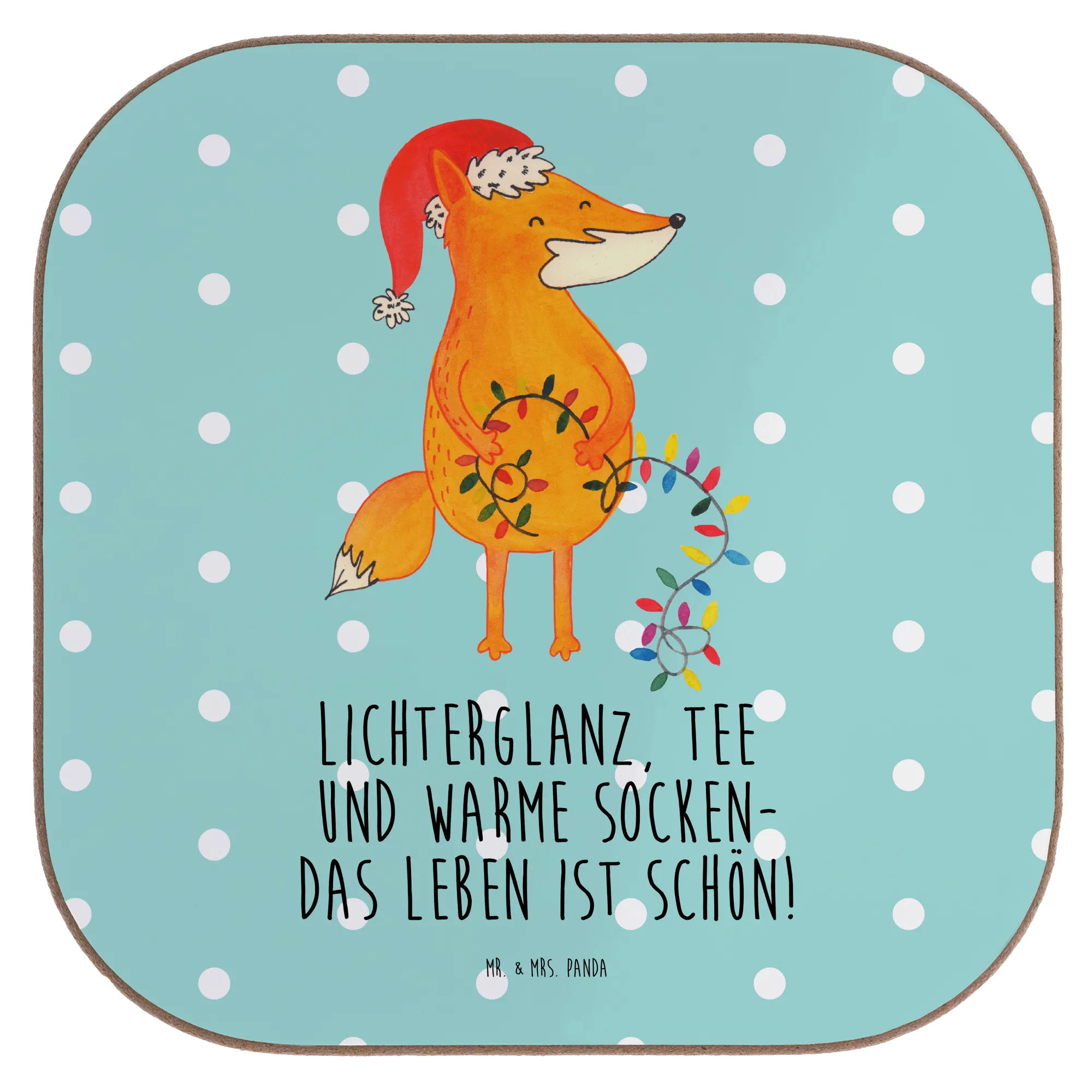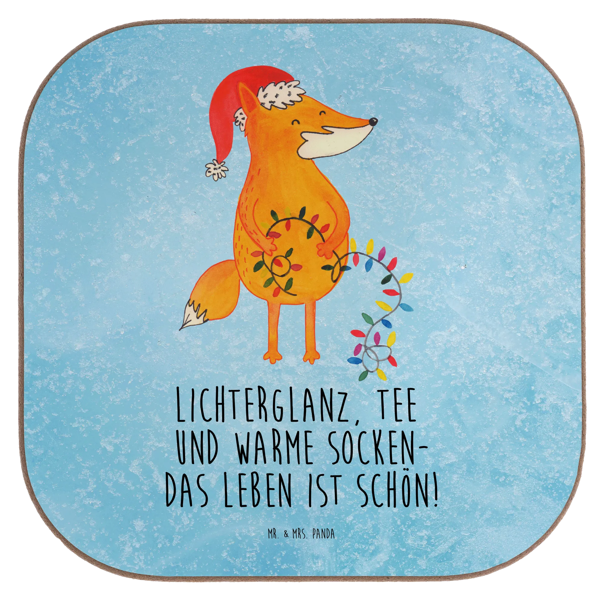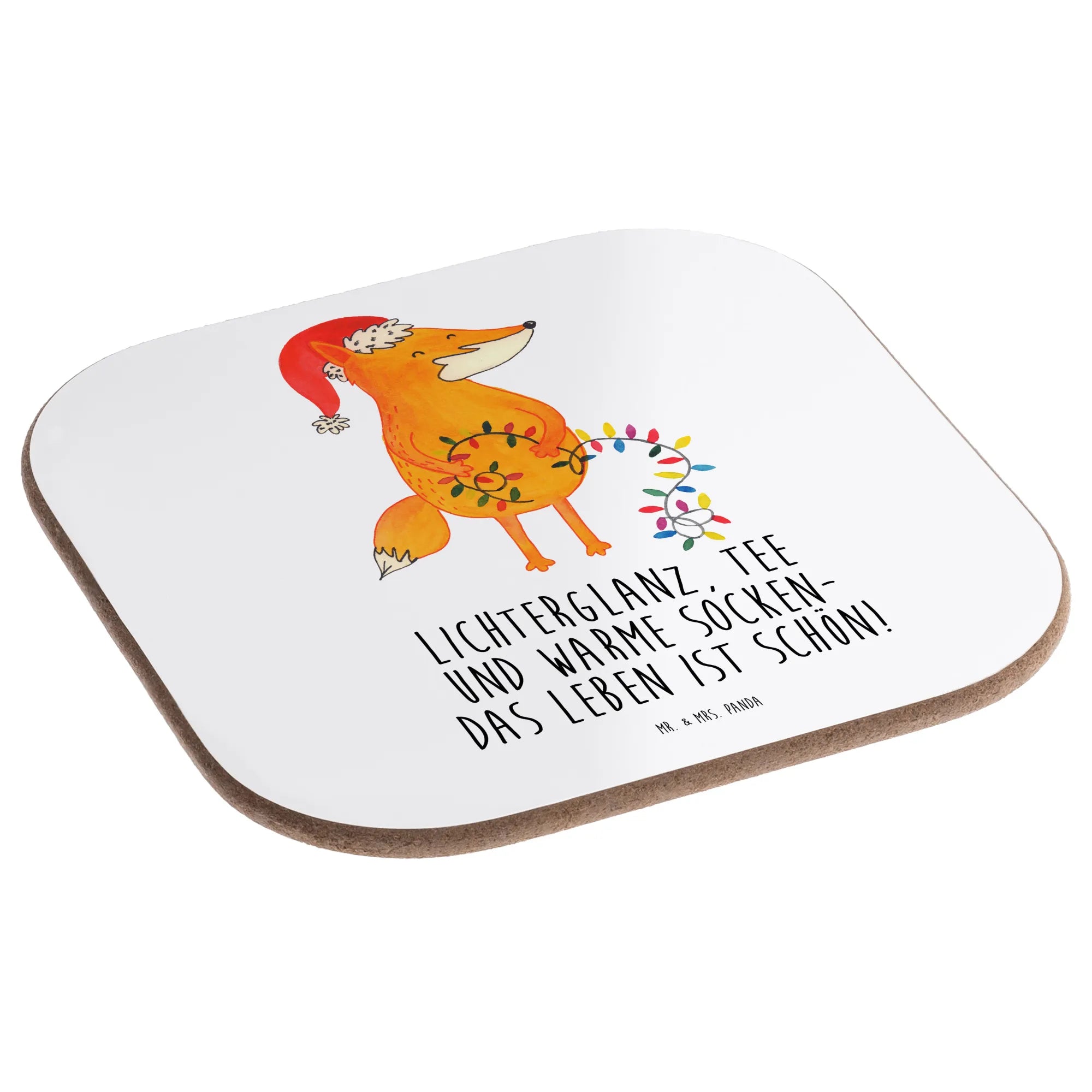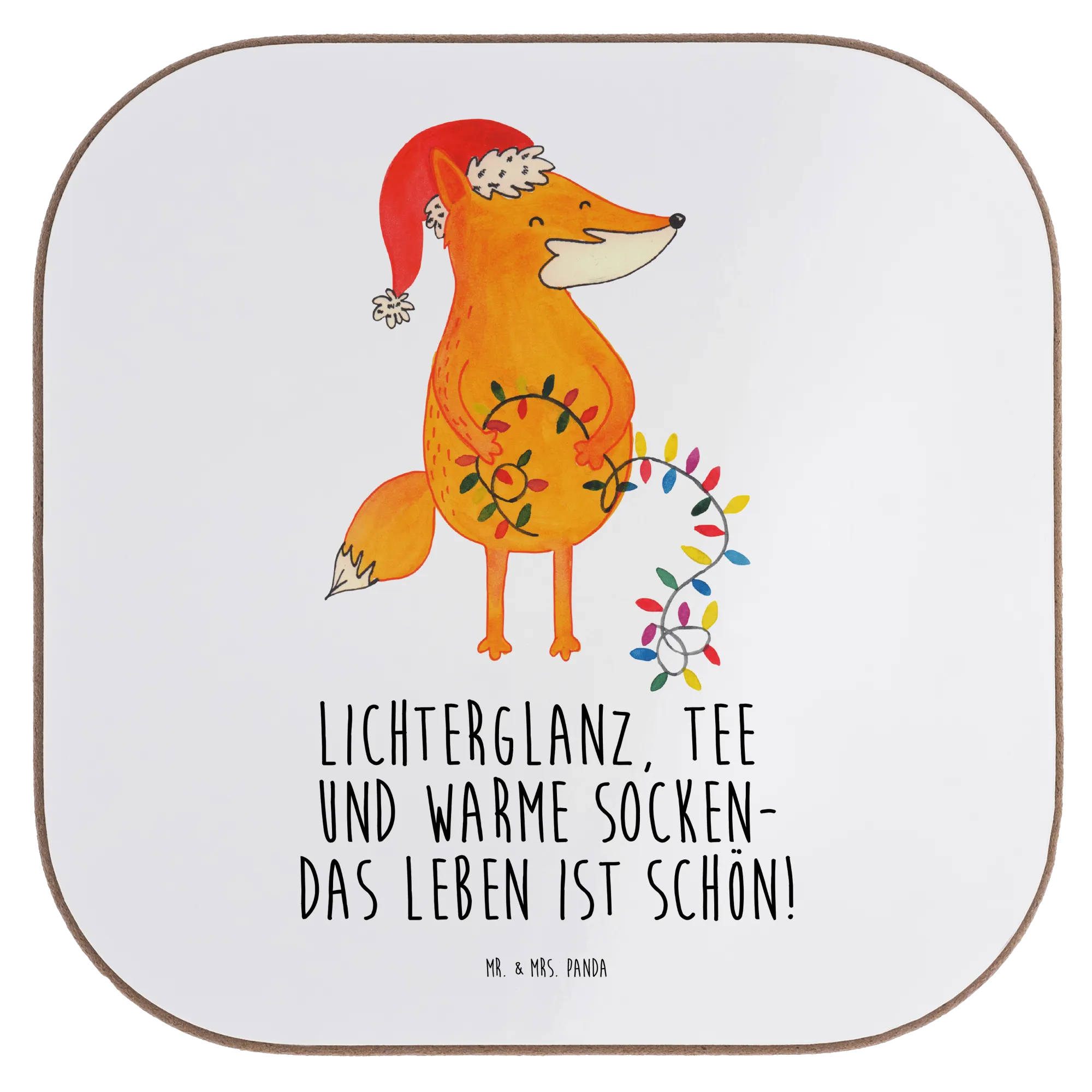 Our charming fox is all set for Christmas adventure! With a festive Santa hat and a glowing string of lights in its paws, this delightful creature whispers the magic of the season. The warm orange hue and delicate designs of greenery and berries draw attention to the beautiful details. The saying 'Lichterglanz, Tee und warme Socken – das Leben ist schön!' perfectly captures the spirit of winter celebrations. Let this whimsical fox brighten your holiday decor and remind you to bask in the beauty of togetherness, laughter, and love during Christmas time.