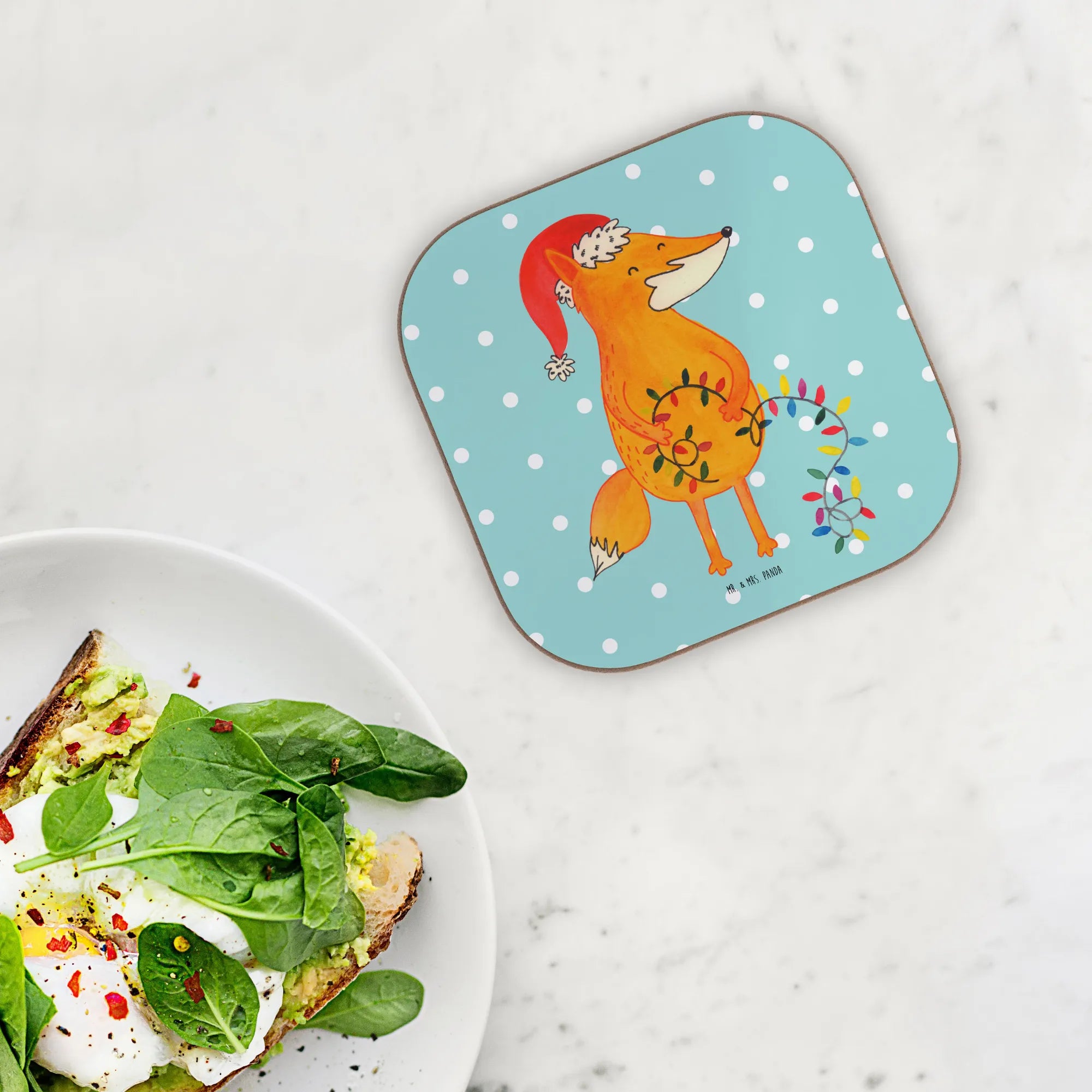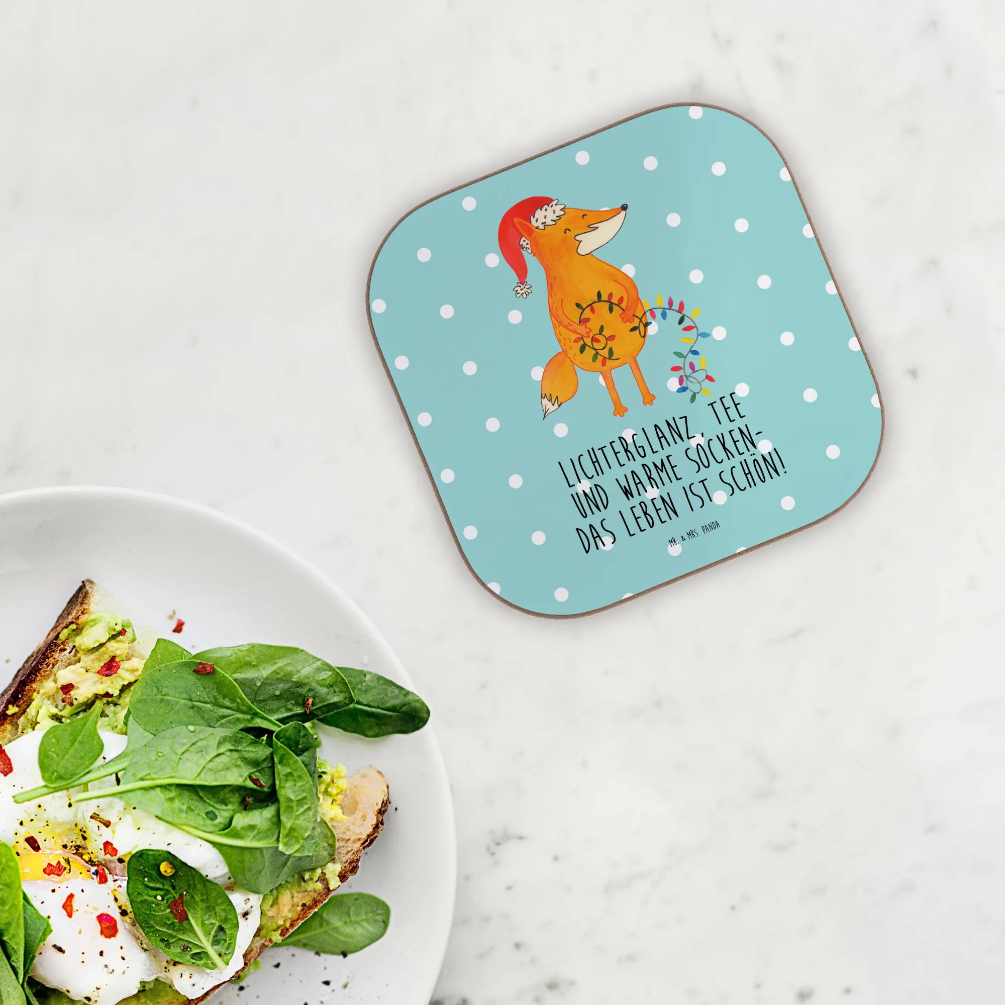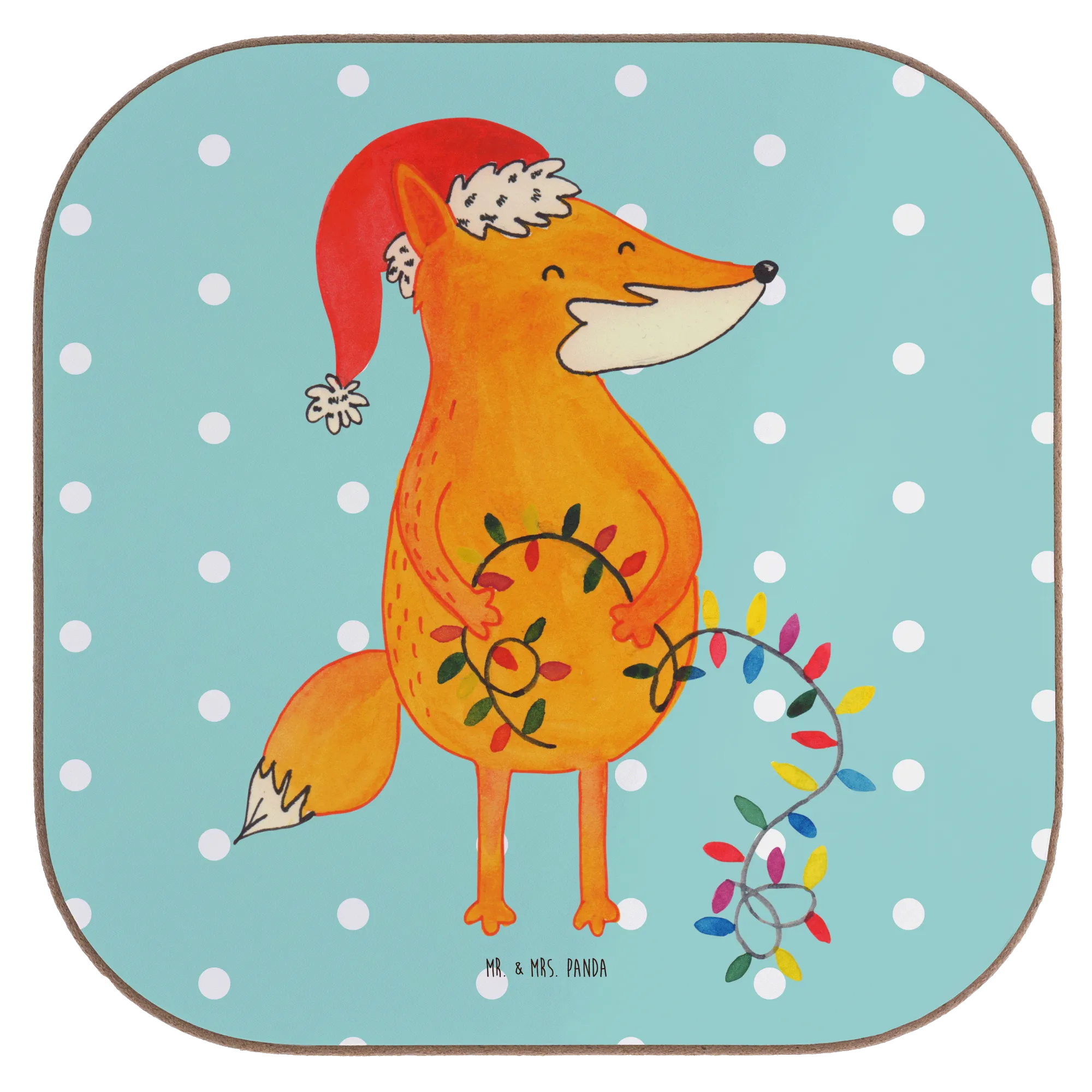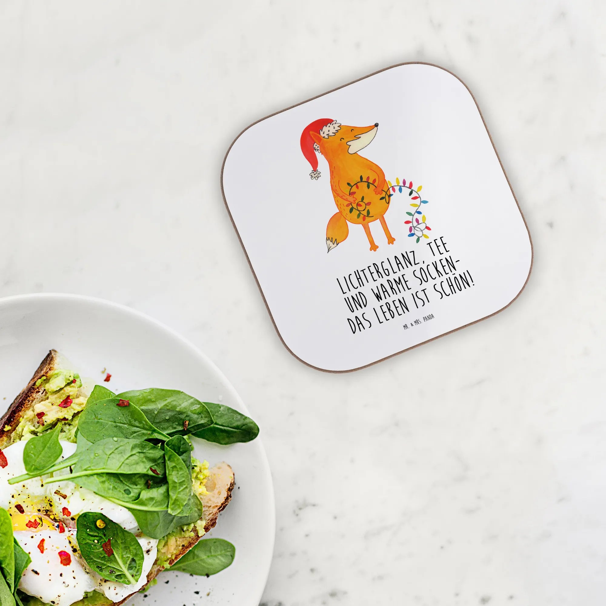 Our charming fox is all set for Christmas adventure! With a festive Santa hat and a glowing string of lights in its paws, this delightful creature whispers the magic of the season. The warm orange hue and delicate designs of greenery and berries draw attention to the beautiful details. The saying 'Lichterglanz, Tee und warme Socken – das Leben ist schön!' perfectly captures the spirit of winter celebrations. Let this whimsical fox brighten your holiday decor and remind you to bask in the beauty of togetherness, laughter, and love during Christmas time.