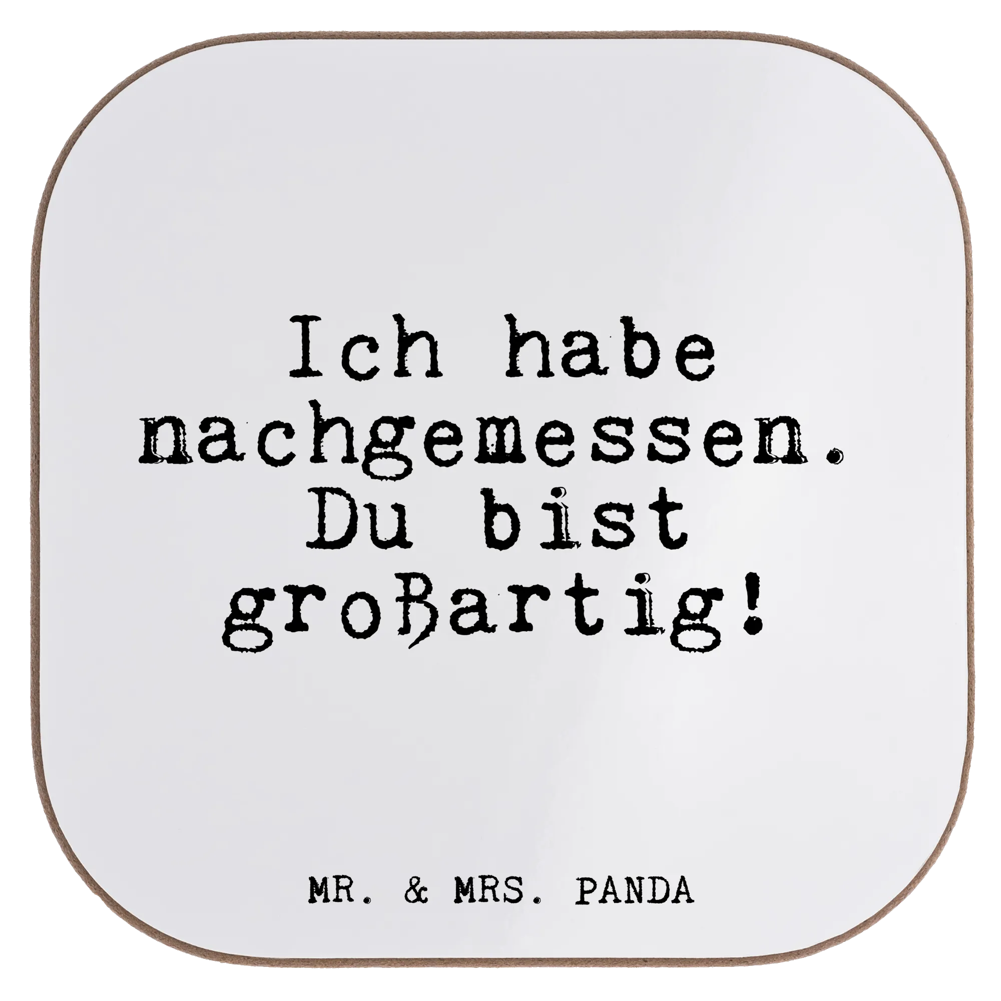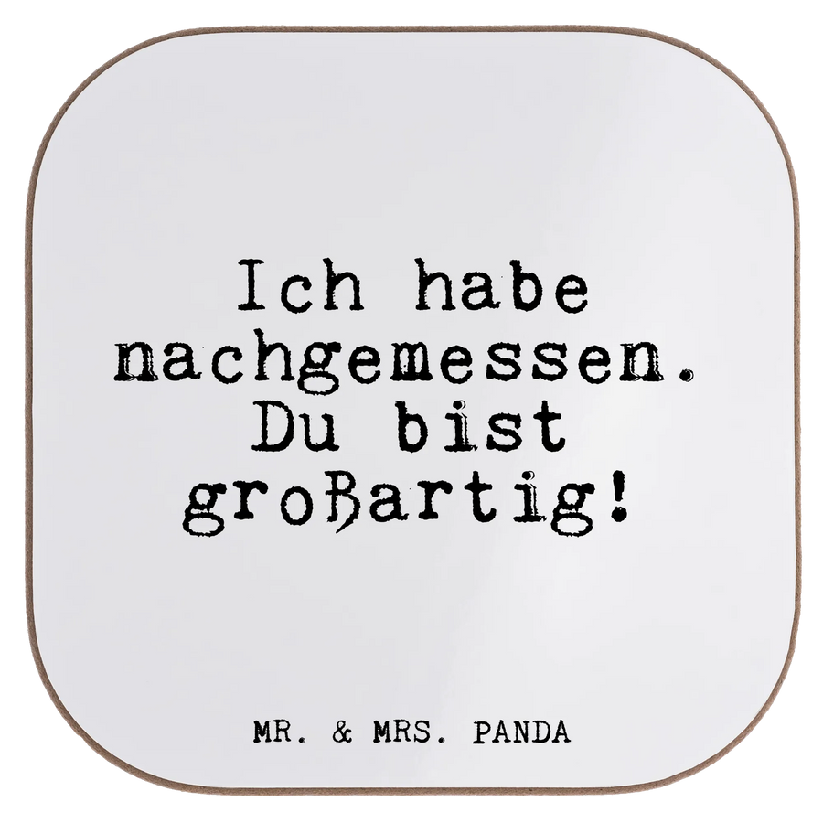 Ein wunderschöner quadratischer Untersetzer von Mr. & Mrs. Panda mit dem frechen und liebevollen Spruch „Ich habe nachgemessen. Du bist großartig!“ – das ideale Geschenk für Lieblingsmenschen und beste Freundinnen. Dieser Glasuntersetzer ist mehr als nur ein Tischschutz: Er ist ein kleines Statement und ein guter-Laune-Bringer für jeden Tag.