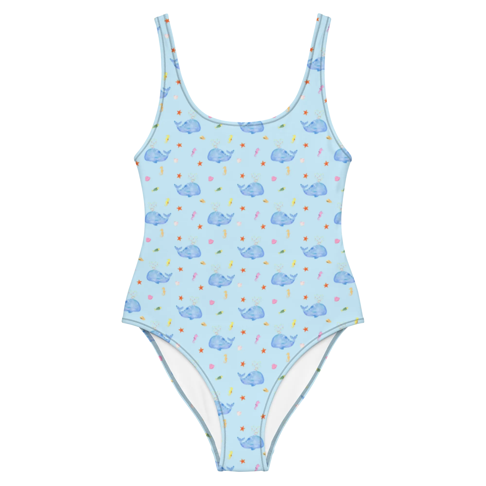 What makes this swimsuit truly special is its enchanting design. Picture a friendly blue whale, eyes closed, with a delightful smile, swimming gracefully through a sea of confetti. This charming motif captures the essence of joy and childlike wonder; it’s as if the ocean is inviting you to create new beginnings filled with fun and laughter. The color palette is serene, reminiscent of shimmering ocean waves, making it a perfect match for any aquatic adventure.