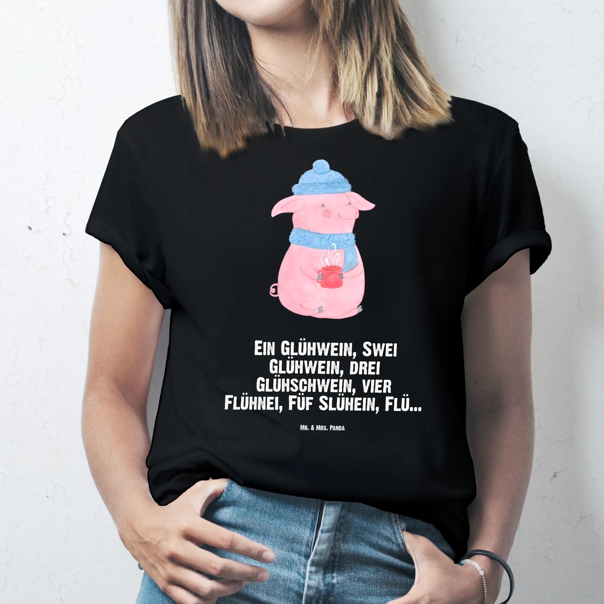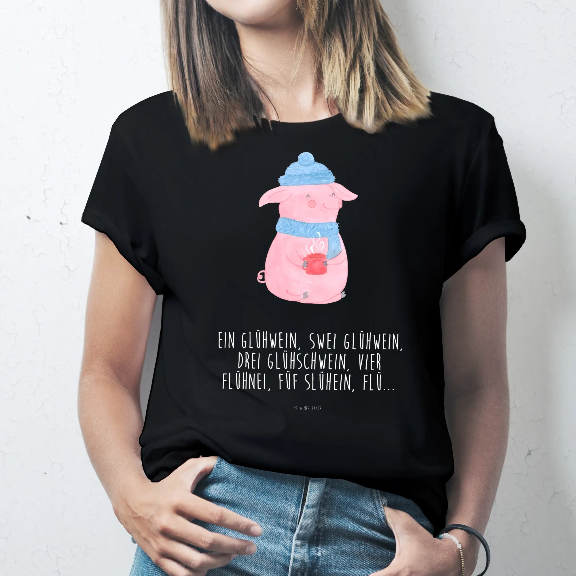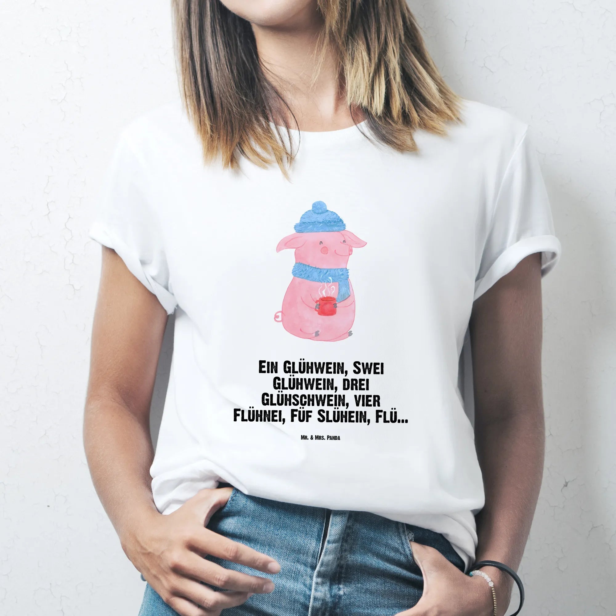 Our adorable mulled pig captures the essence of winter cheer, dressed in a cozy blue hat and scarf. With a warm cup of mulled wine in hand, this whimsical character embodies the spirit of the Christmas season. The fun-loving slogan 'Ein Glühwein, Swei Glühwein, drei Glühschwein, vier Flühnei, Füf Slühein, Flü...' lays the foundation for creating joyful memories as you gather with friends and family. As you take in this charming motif, let it inspire you to savor every moment, creating laughter-filled evenings that warm both heart and soul.