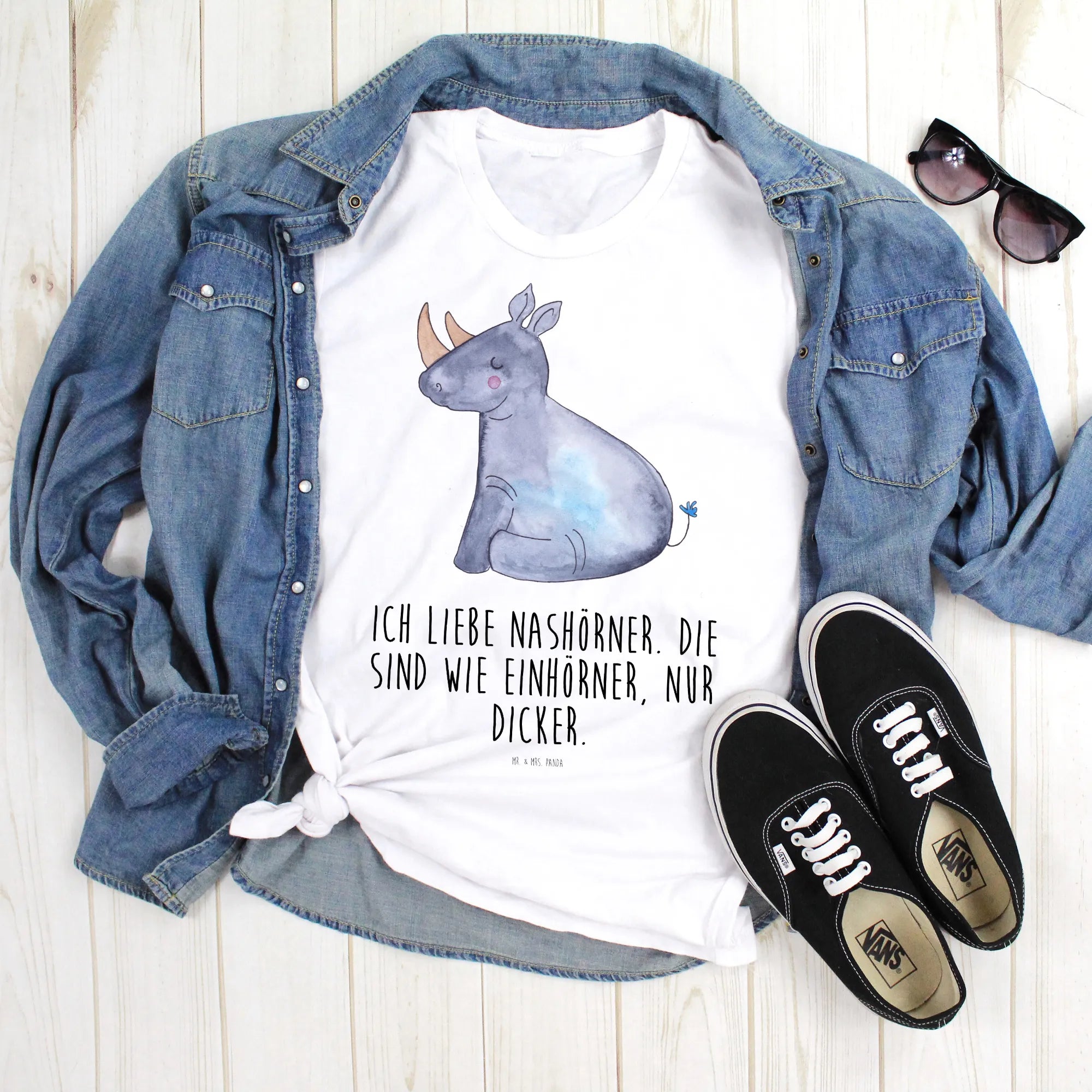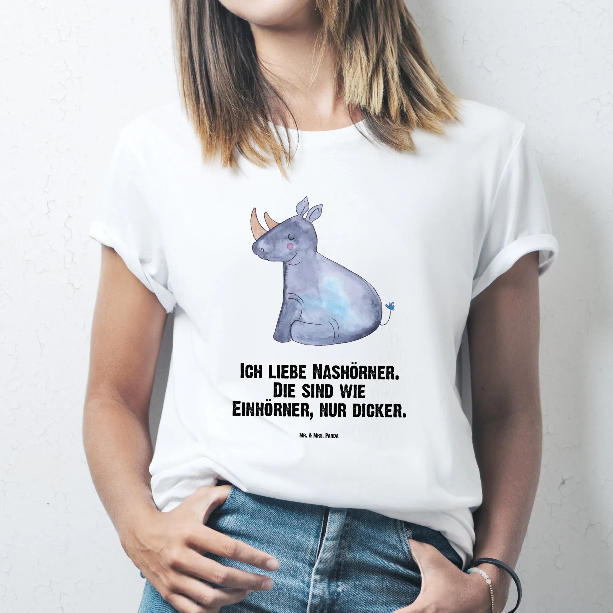 Unser Einhorn Nashorn Motiv ist liebevoll von Mrs. Panda handgezeichnet und bringt die typische Einhornpower mit einer Portion Bodenständigkeit. Das weiße Damen T-Shirt setzt das Design besonders gut in Szene und eignet sich hervorragend als lustiges T-Shirt für Geburtstag, Jubiläum oder als Überraschung beim Junggesellenabschied.