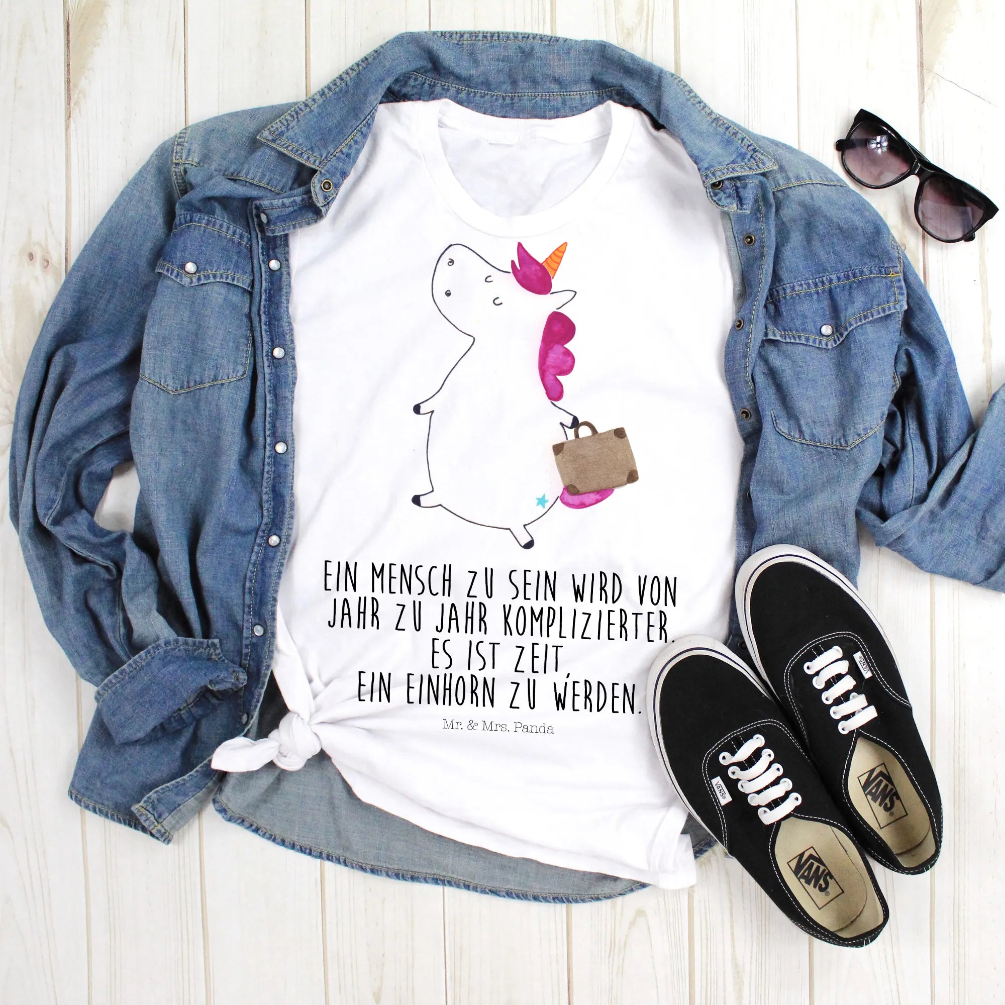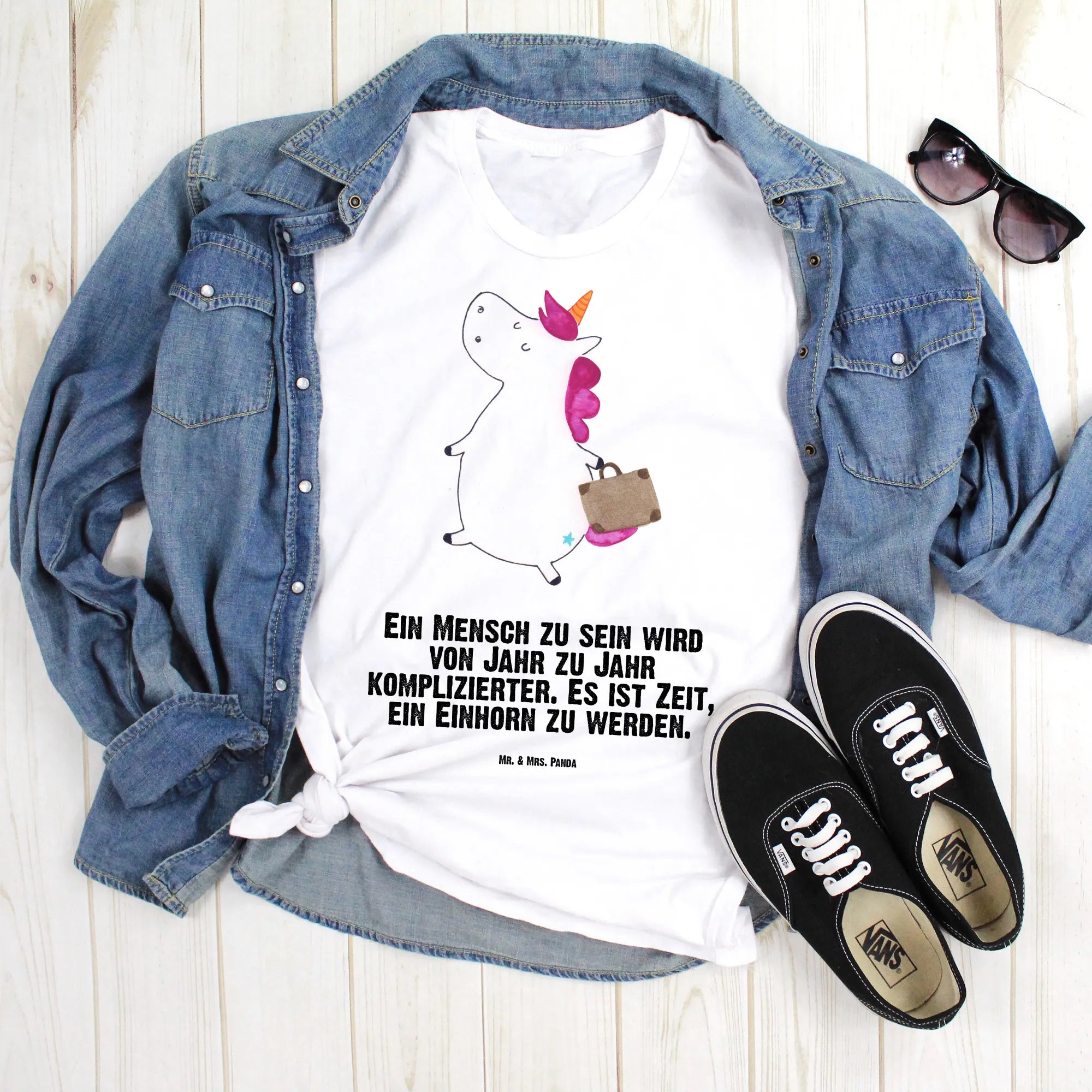 Suchst du ein besonderes Geschenk, das Herz und Humor vereint? Unser Größe L T-Shirt mit dem Motiv „Einhorn Koffer“ aus der Einhorn - Kollektion von Mr. & Mrs. Panda ist genau das: verspielt, liebevoll und perfekt für alle, die das Leben mit einem Augenzwinkern nehmen. Das süße Einhorn mit Koffer erzählt von Fernweh, Abenteuerlust und der Freude, Kind zu bleiben.