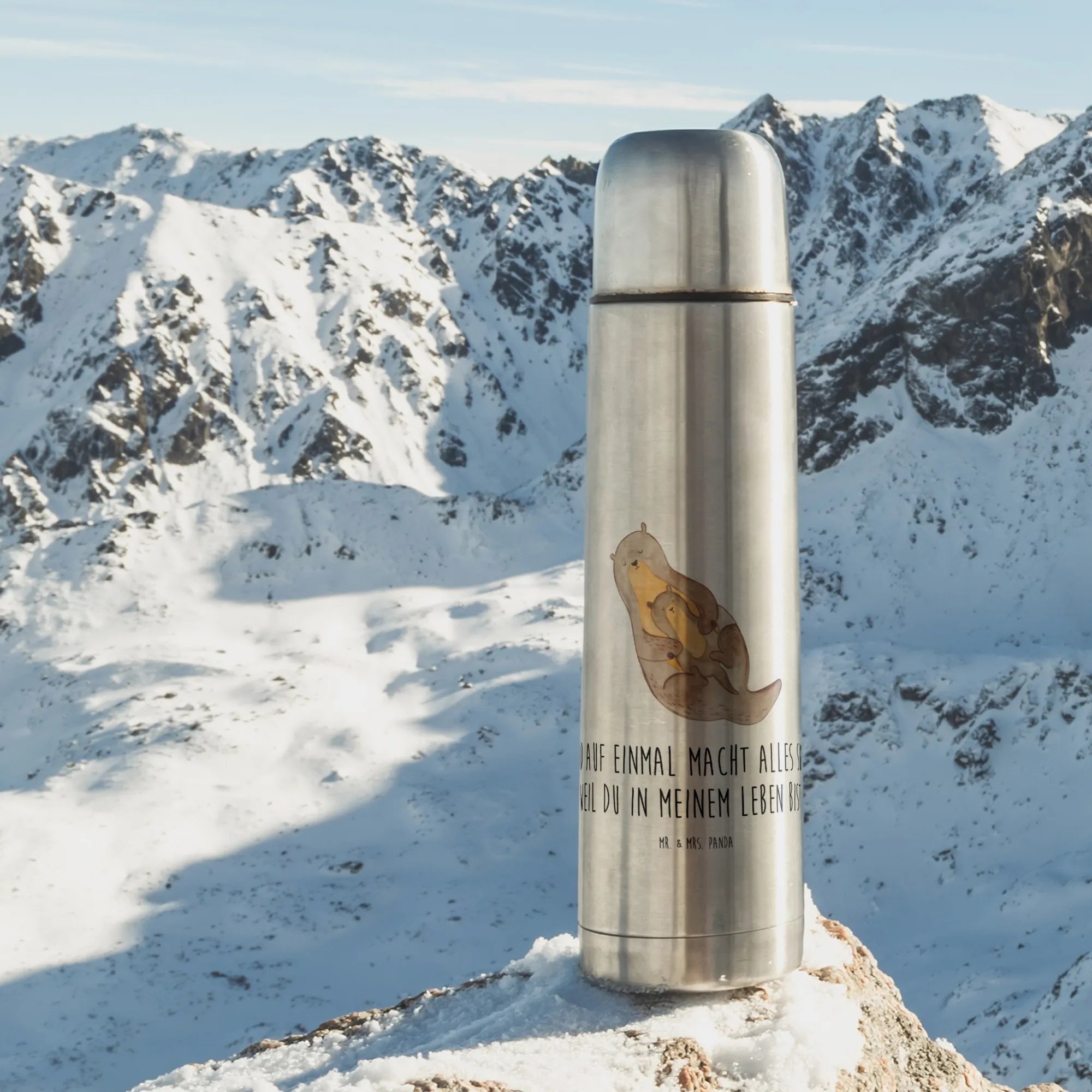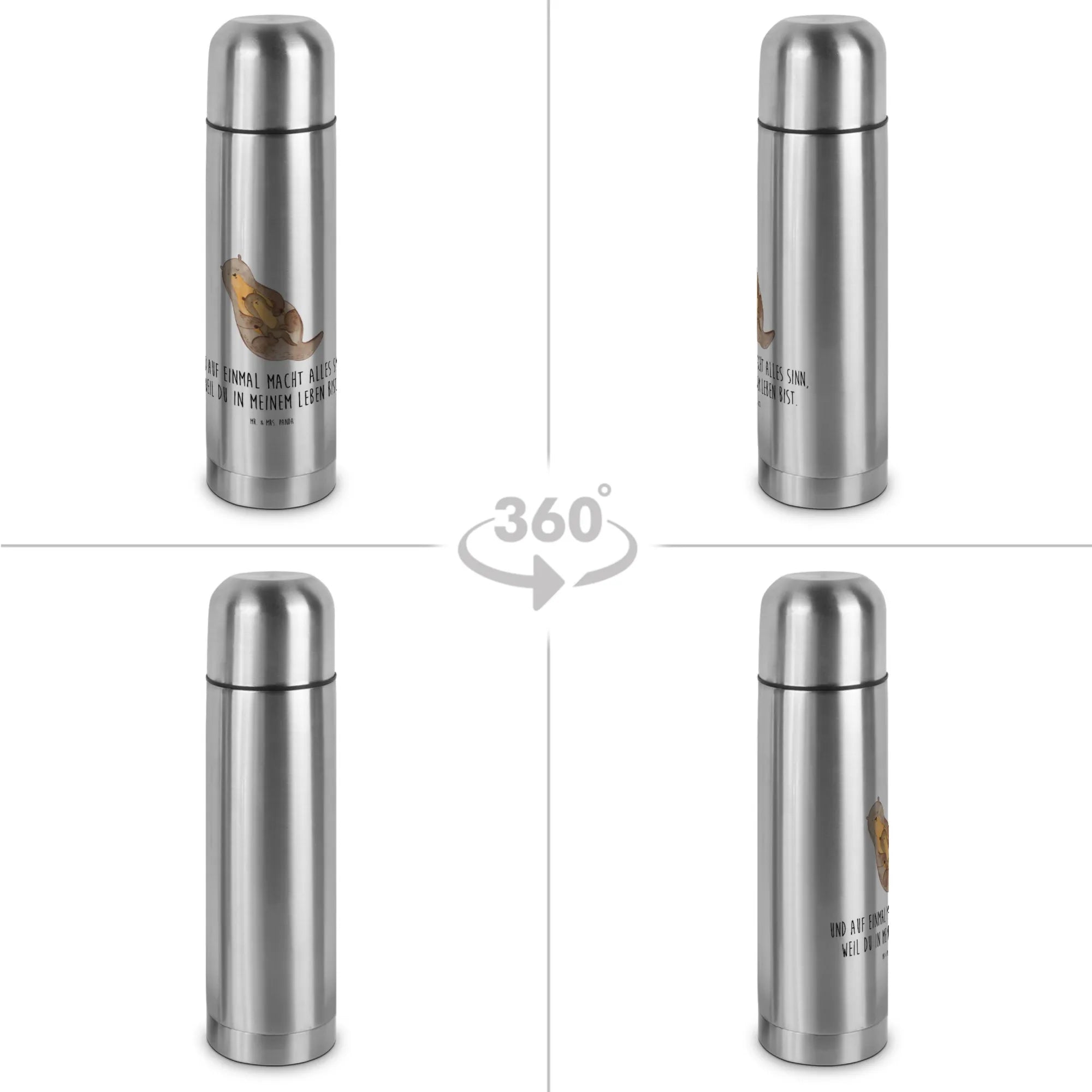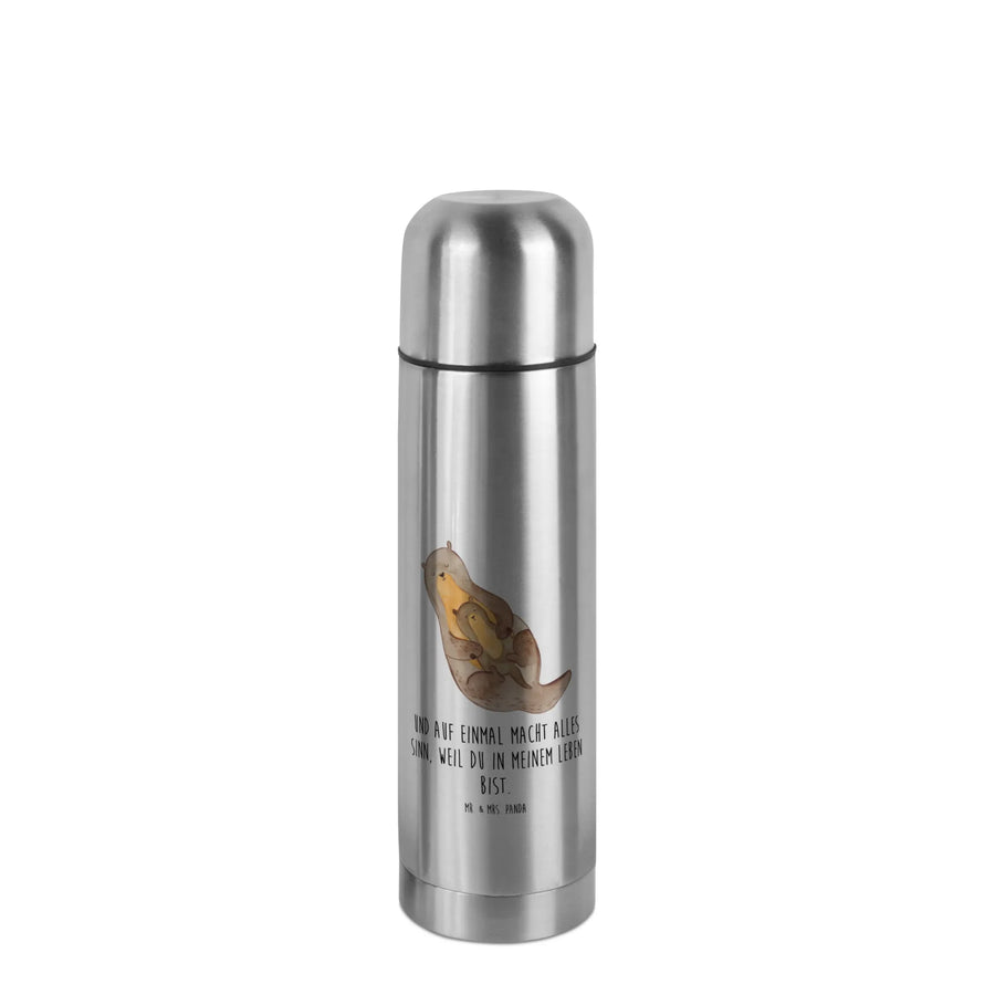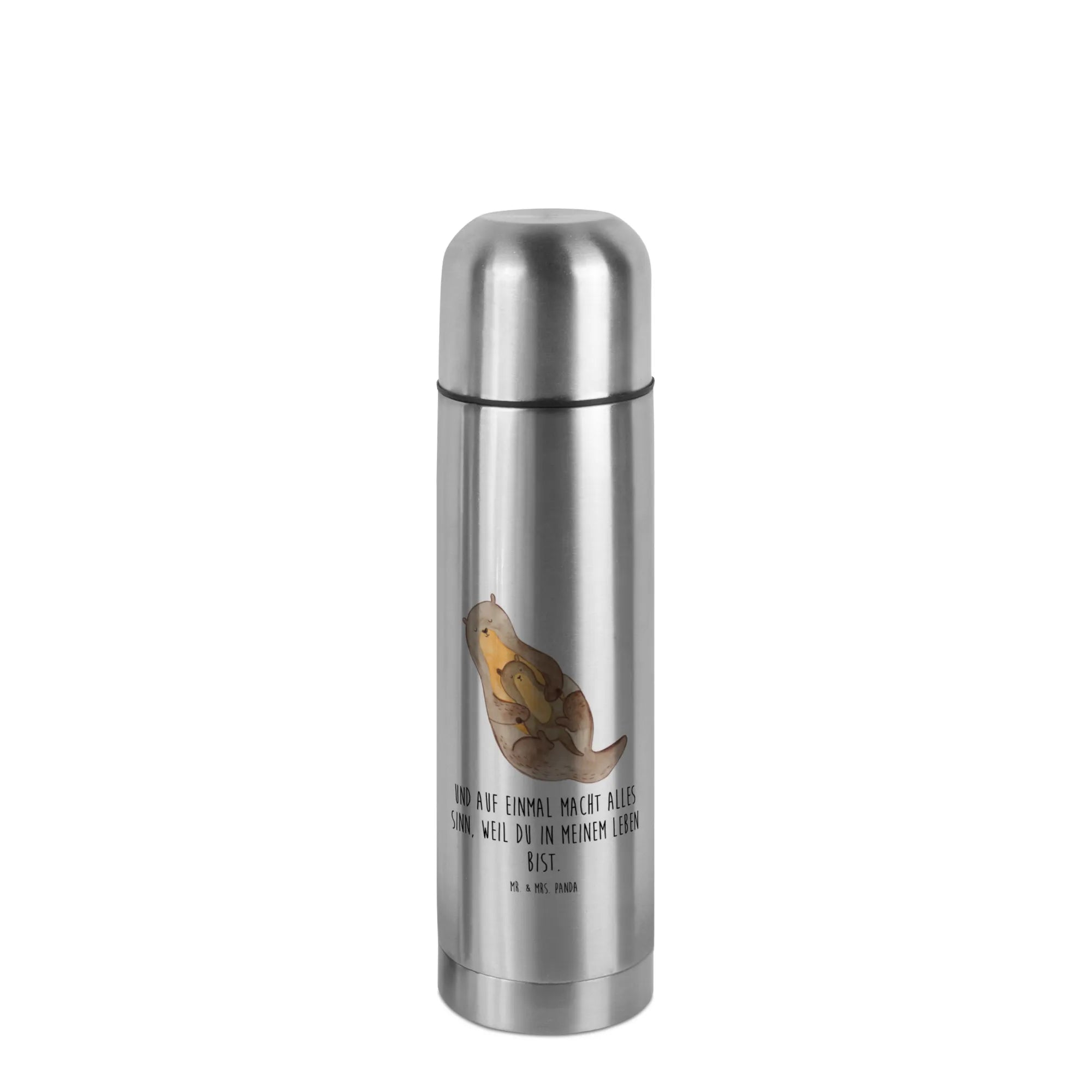 Das niedliche Motiv ist in brillanter Druckqualität auf silbernem Untergrund gehalten, was der Kanne einen edlen Look verleiht. Wenn Du also nach einem durchdachten Geschenk für einen besonderen Menschen suchst, der die Natur und insbesondere die süßen Otter liebt, dann ist diese Thermoskanne genau das Richtige! Ideal für den Muttertag, Vatertag oder als kleines Dankeschön für die beste Freundin. Schenke Liebe, Wärme und die Botschaft: "Und auf einmal macht alles Sinn, weil du in meinem Leben bist."