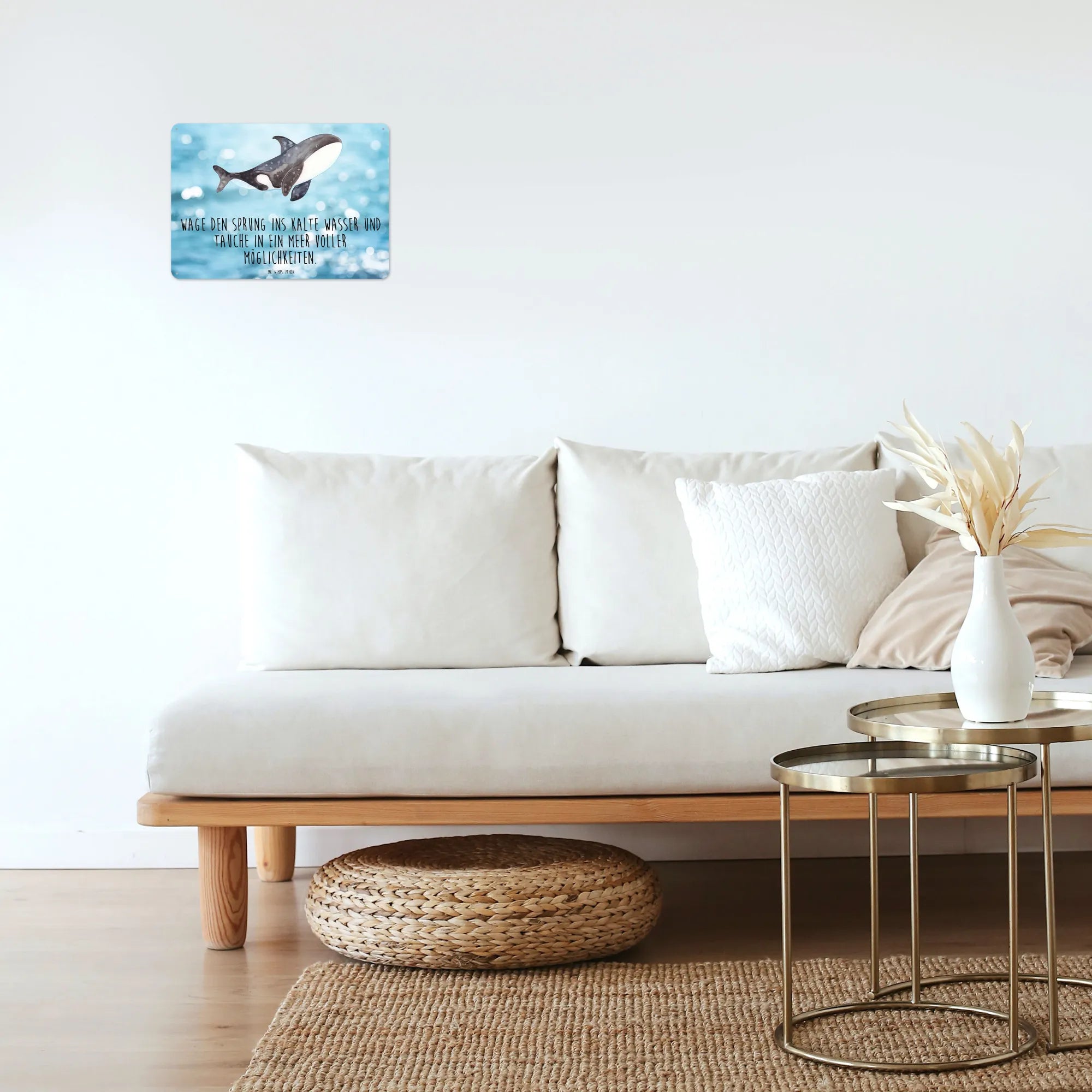Der Orca, ein majestätisches Tier der Meere, symbolisiert Freiheit und den Mut, neue Wege zu gehen. Mit dem liebevollen Spruch "Wage den Sprung ins kalte Wasser und tauche in ein Meer voller Möglichkeiten" inspiriert Dich dieses Schild jeden Tag aufs Neue.