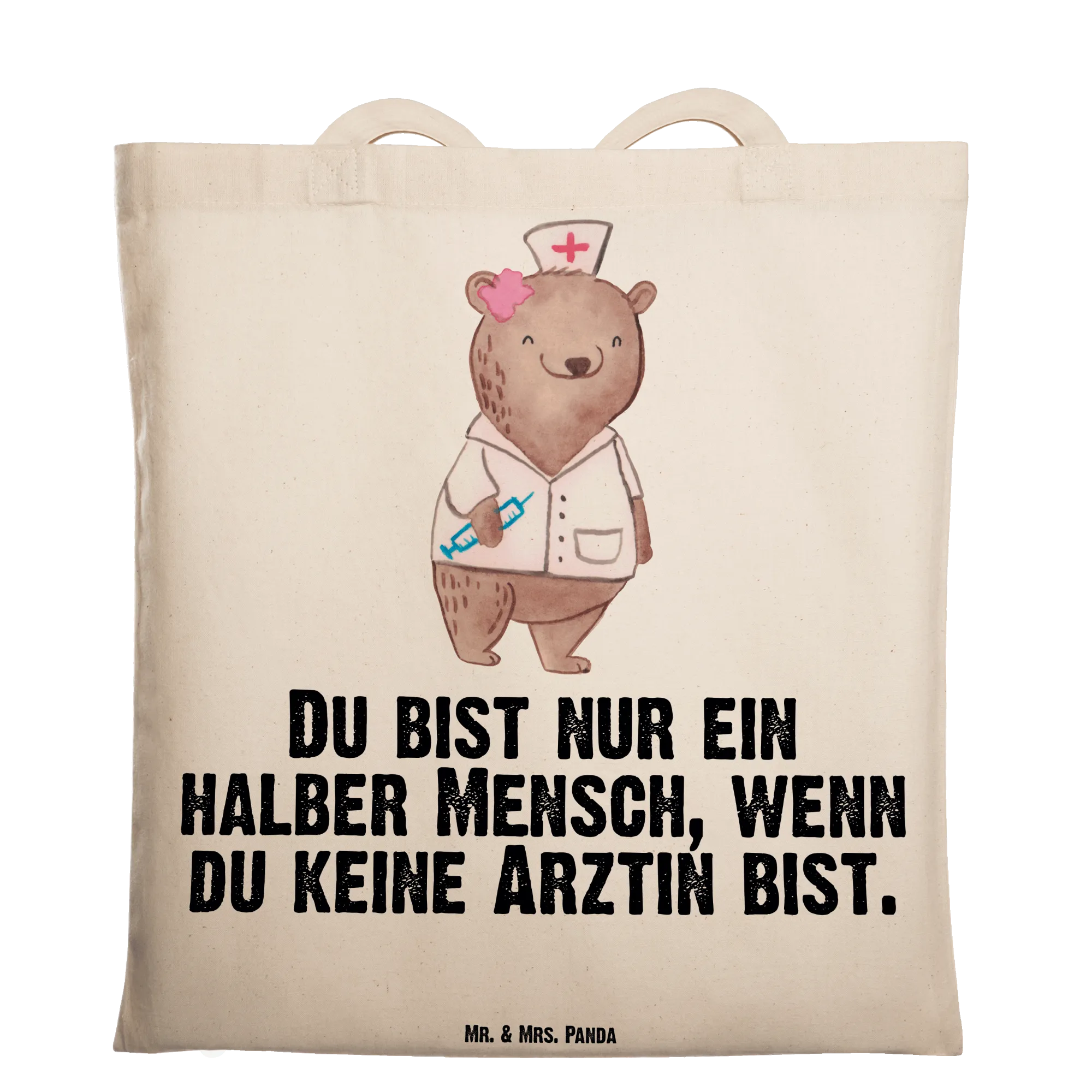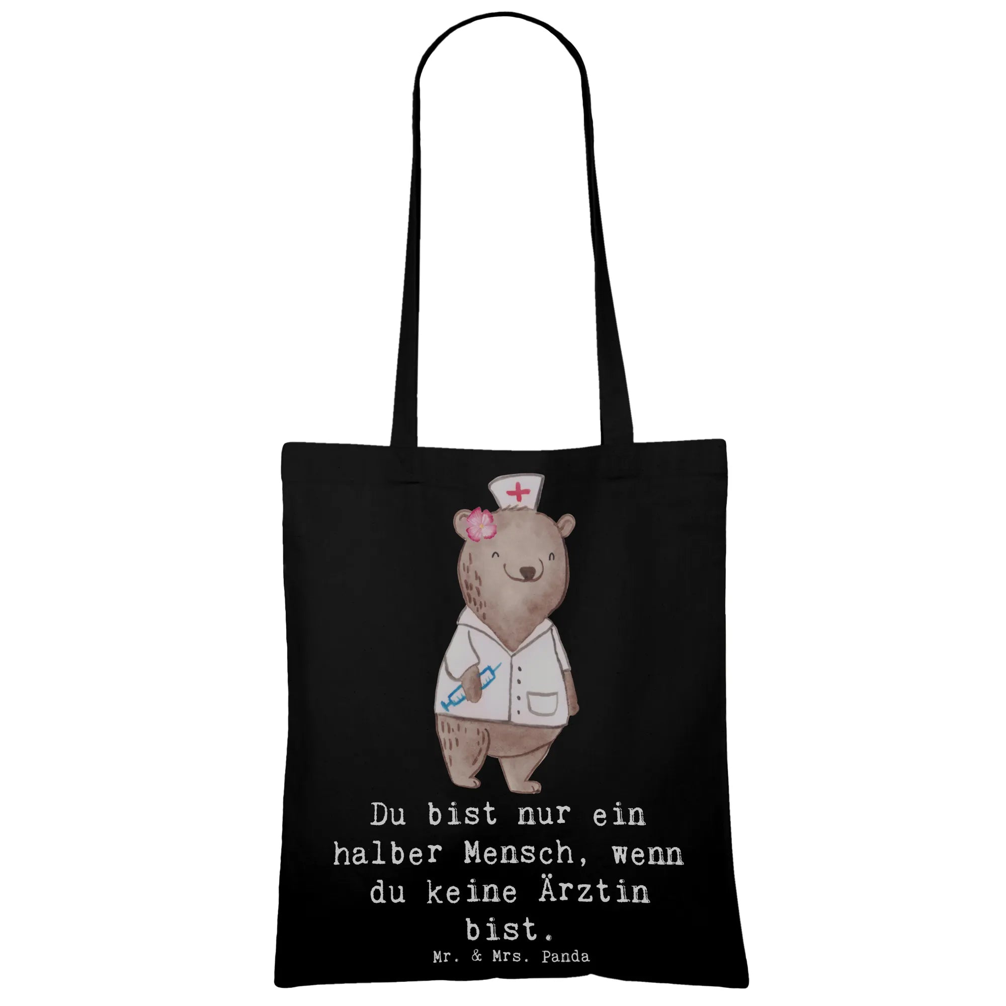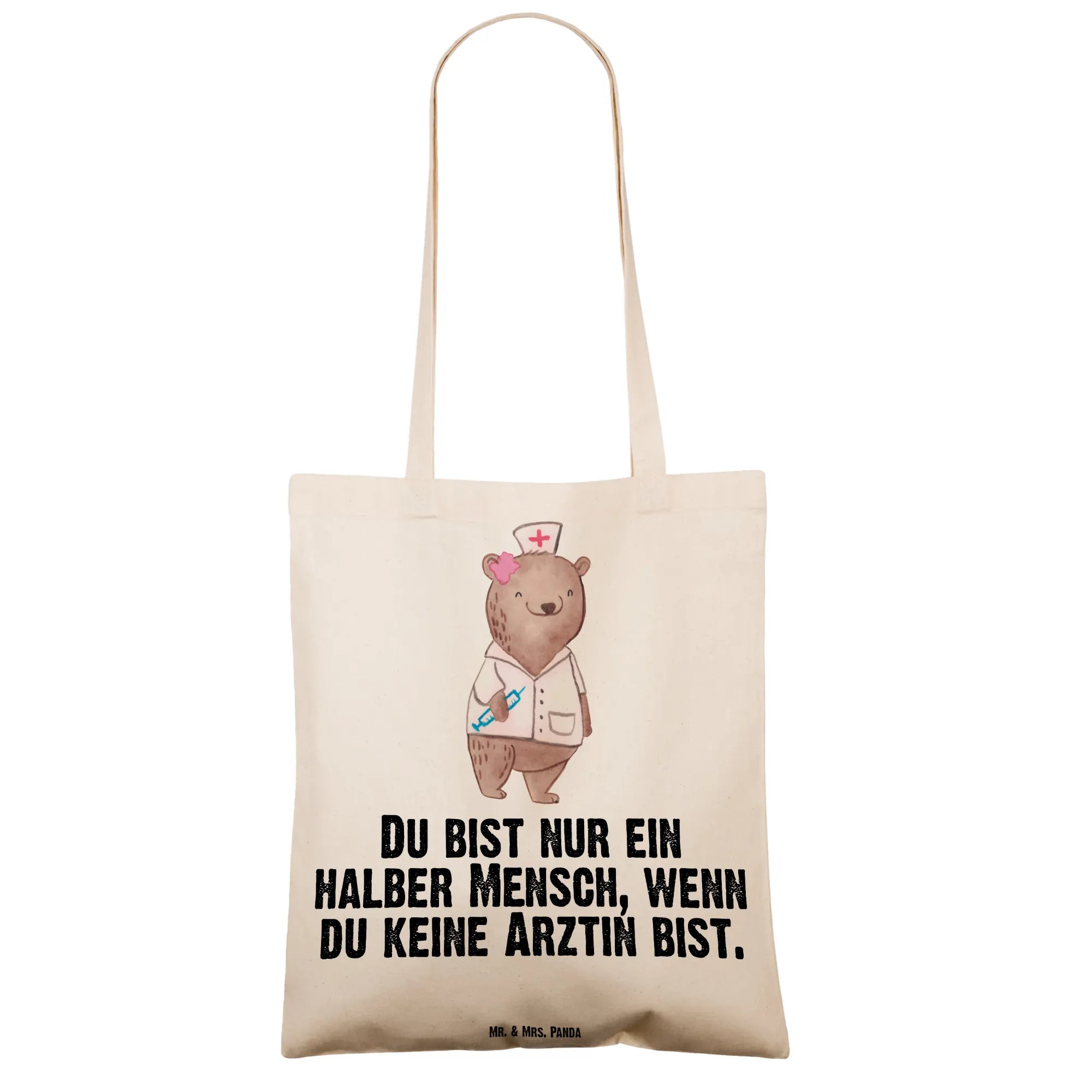 Ein Herz für Ärztinnen: Die Tragetasche "Ärztin mit Herz" von Mr. & Mrs. Panda ist das ideale Geschenk für alle Medizinerinnen, Hausärztinnen und Doktorinnen. Das niedliche Bärenmotiv im weißen Kittel und der freche Spruch „Du bist nur ein halber Mensch, wenn du keine Ärztin bist.“ zaubern ein Lächeln auf jedes Gesicht. Perfekt als Dankeschön, zum Berufsjubiläum, Abschied oder Ruhestand.