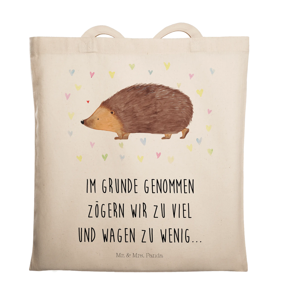 Introducing the enchanting Tote Bag featuring a delightful hedgehog surrounded by cheerful hearts, part of the beloved Small World collection by Mr. & Mrs. Panda! This beautifully designed carrier bag is the perfect gift for those who cherish cute animal motifs and funny, heartwarming art.