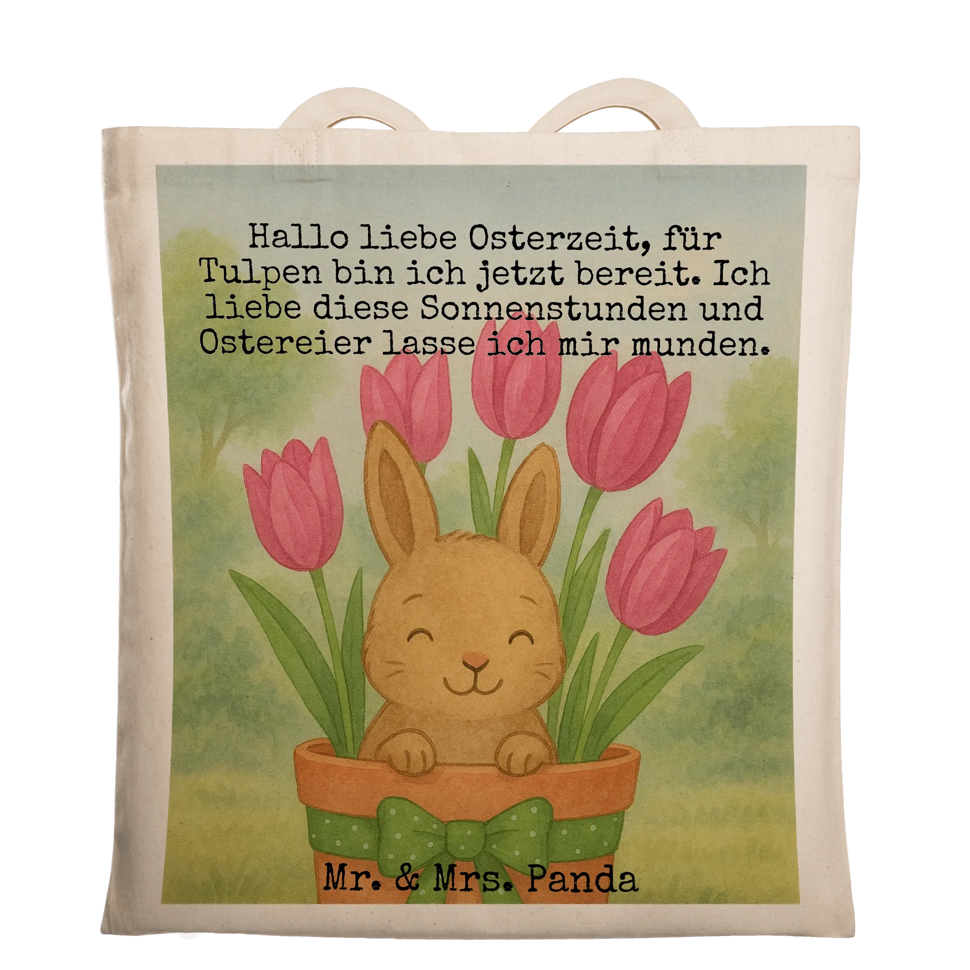 Welcome the joy of spring into your life with our Bunny Tulips motif! A sweet brown bunny comfortably sits in a terracotta pot, surrounded by playful pink tulips that brighten up any room. Adorned with a delightful green polka-dotted ribbon, this motif brings festive cheer, perfect for Easter gifts or home decor. Celebrate the season and the beauty of nature with the heartfelt words: 'Hallo liebe Osterzeit, für Tulpen bin ich jetzt bereit. Ich liebe diese Sonnenstunden und Ostereier lasse ich mir munden.' It’s all about capturing love in bloom!