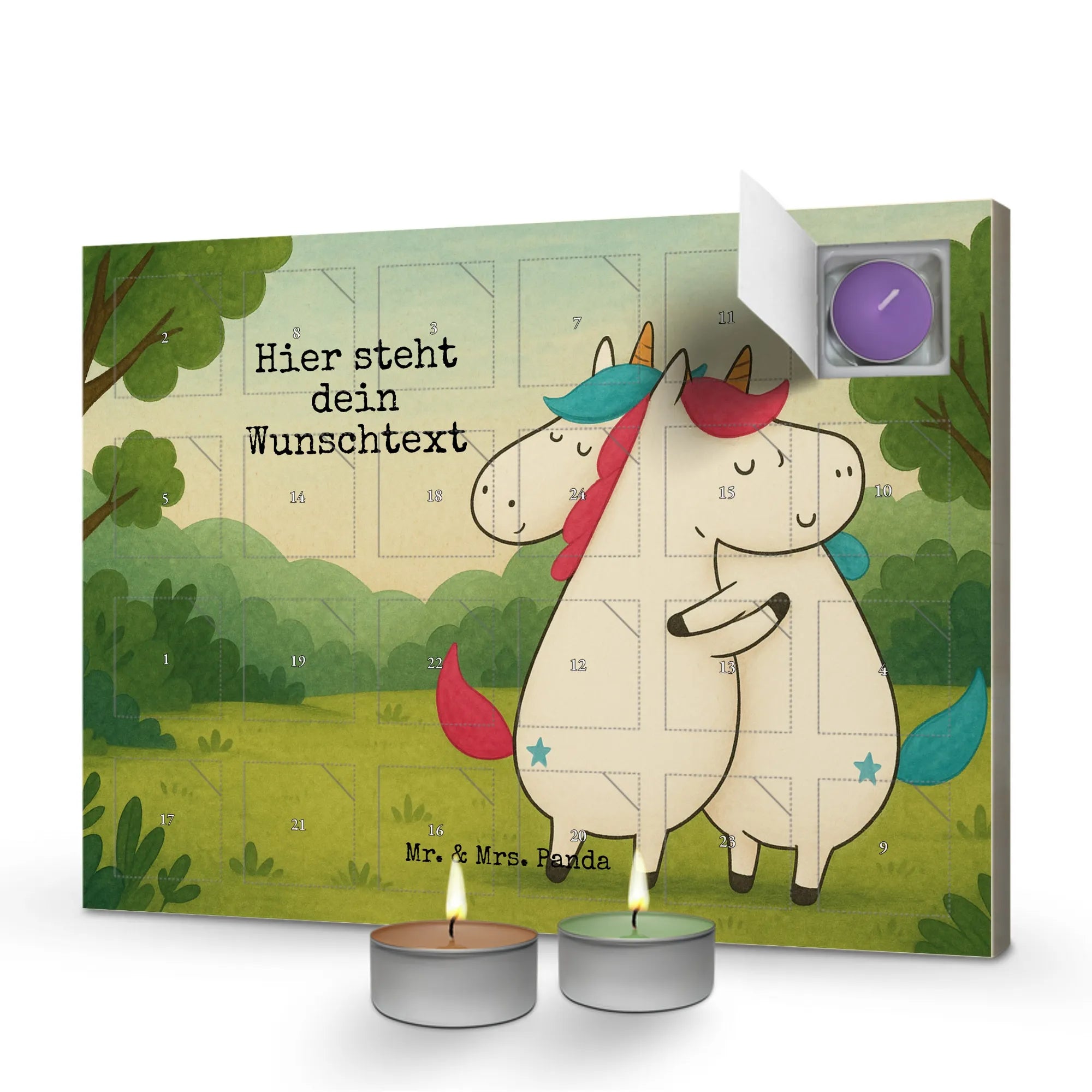 Discover the magic of the pre-Christmas season with our 'Personalized Scented Candle Advent Calendar' from Mr. & Mrs. Panda. Enchantingly adorned with beautiful quotes and motifs, this unique Advent calendar can be personalized with a message or name of your choice. Be captivated by Mrs. Panda's charming drawings on the front and a new festive scent behind every door, including vanilla, lavender, and apple-cinnamon. A sturdy box that can be hung up or displayed completes the experience.