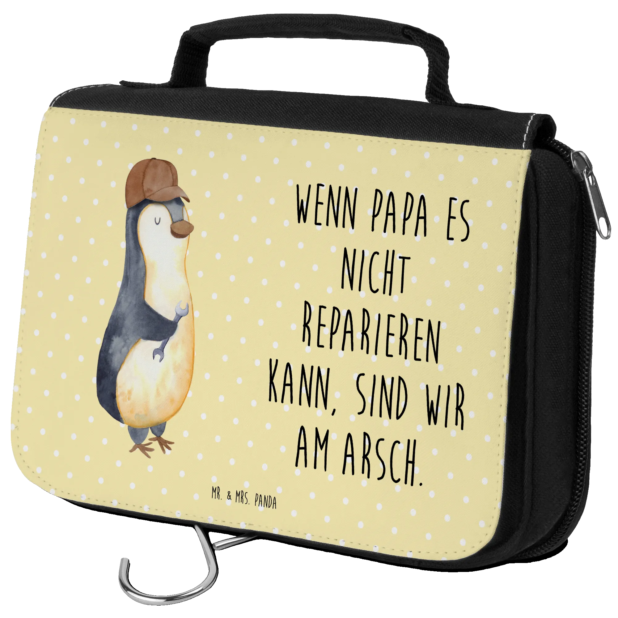 Looking for the perfect gift for that special dad in your life? Look no further than the charming Mr. & Mrs. Panda wash bag with the slogan "If Daddy can't fix it, we're screwed." This lovely wash bag is not just a practical carry-all for cosmetics and hygiene products; it’s a delightful nod to every dad’s handy skills (or lack thereof!). Featuring a whimsical penguin character wearing a jaunty brown cap and holding a stylized wrench, this fun design captures the essence of fatherhood with a playful twist.