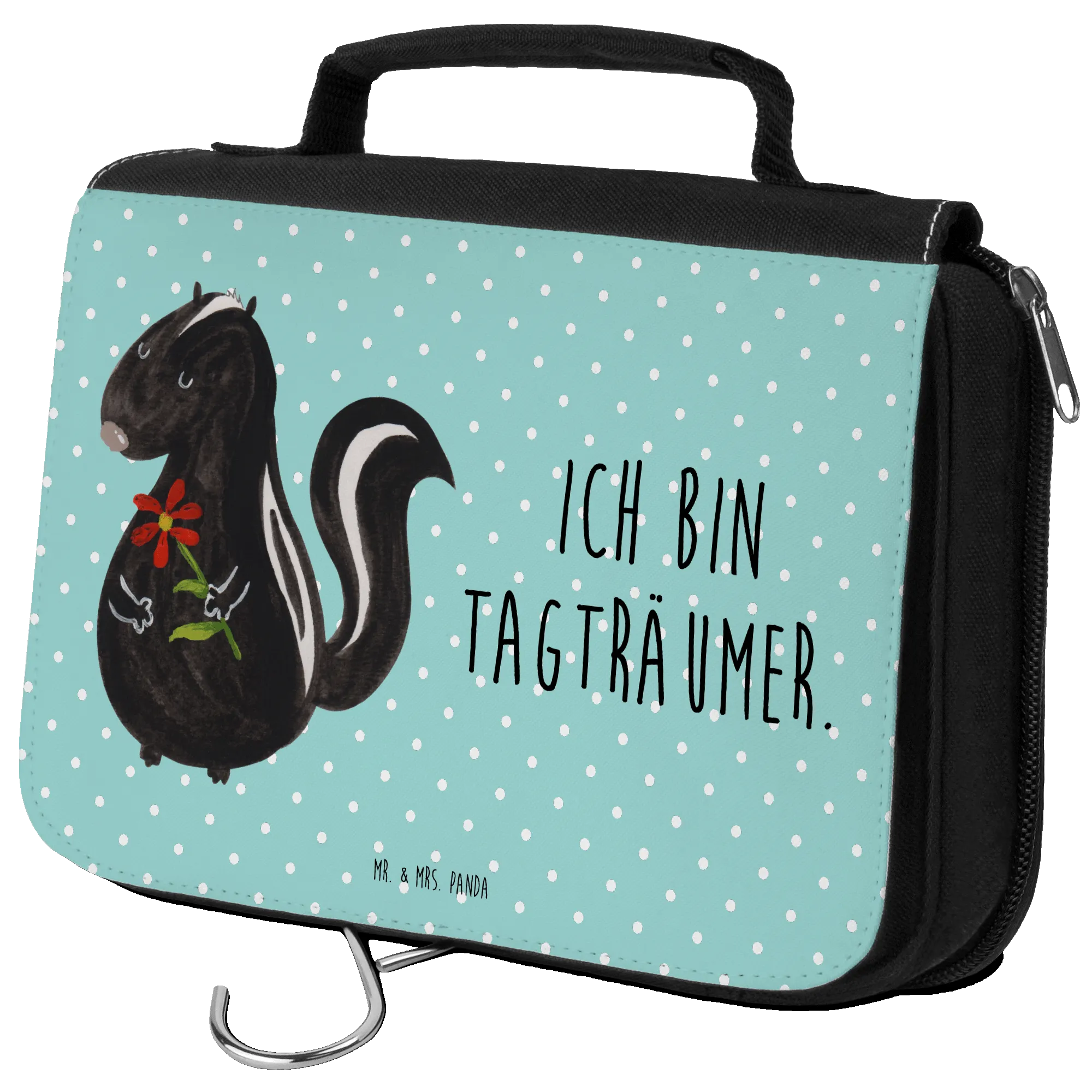 Crafted with high-quality materials, this wash bag is made from a durable blend of polyester and cotton to ensure your makeup and hygiene essentials are well-protected. It features a beautiful turquoise pastel background, ideal for both ladies and gentlemen who want to add a touch of whimsical charm to their travel gear. Gone are the days of rummaging through your bag to find that one elusive lip balm or your favorite moisturizer; the Skunk Flower Wash Bag boasts multiple zippered compartments, including a large inner pocket and an outer mesh pocket for extra organization.